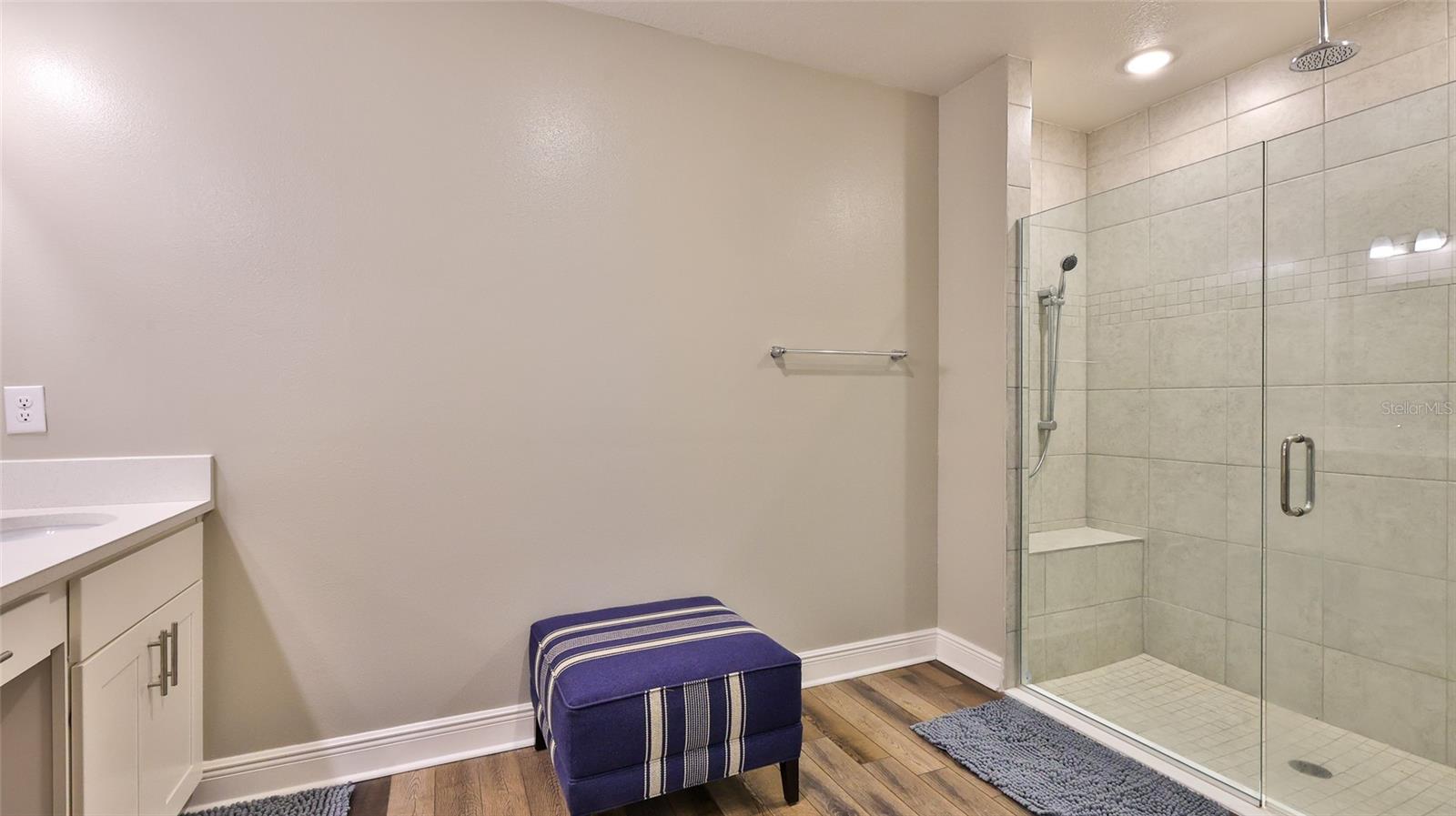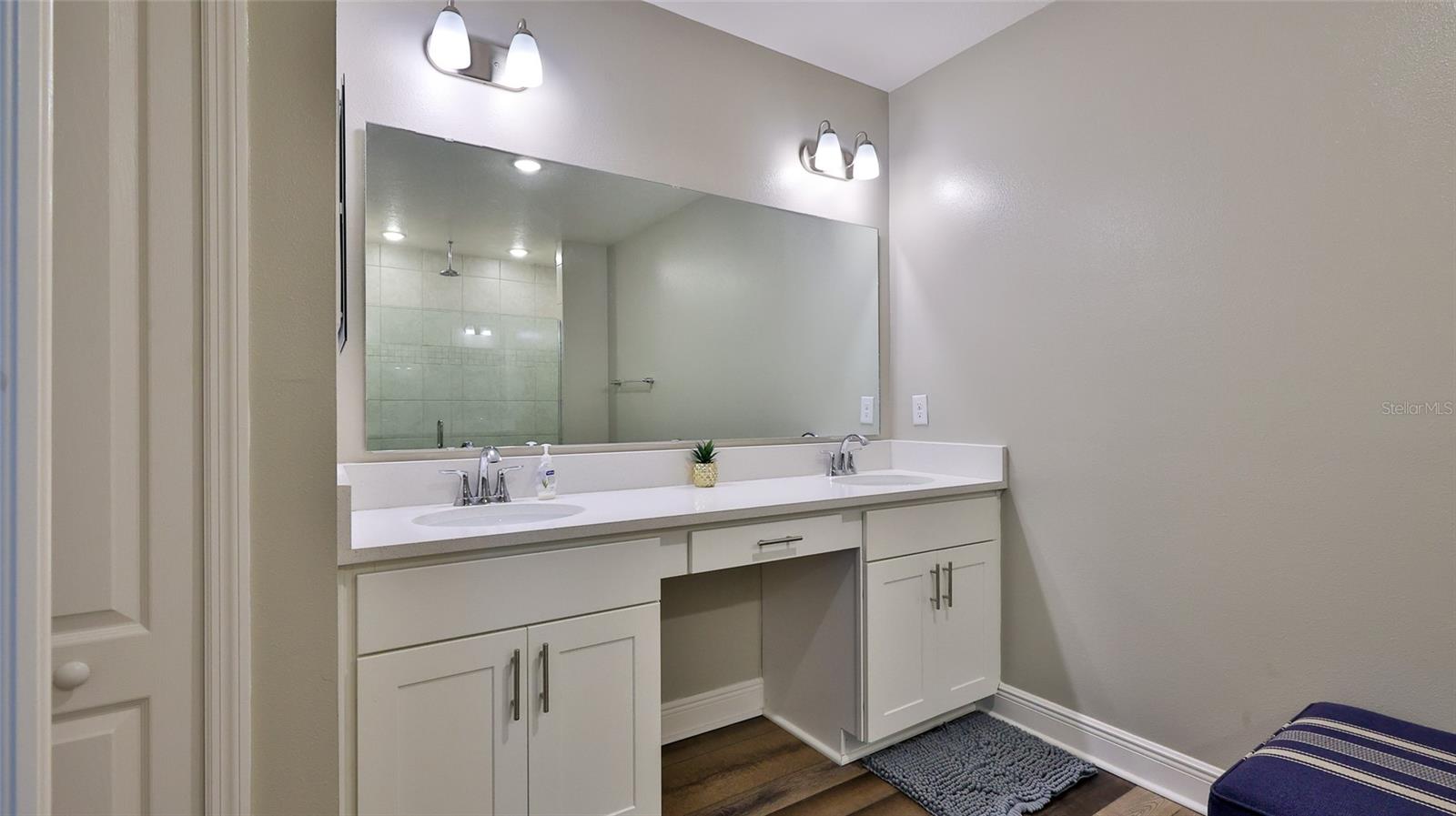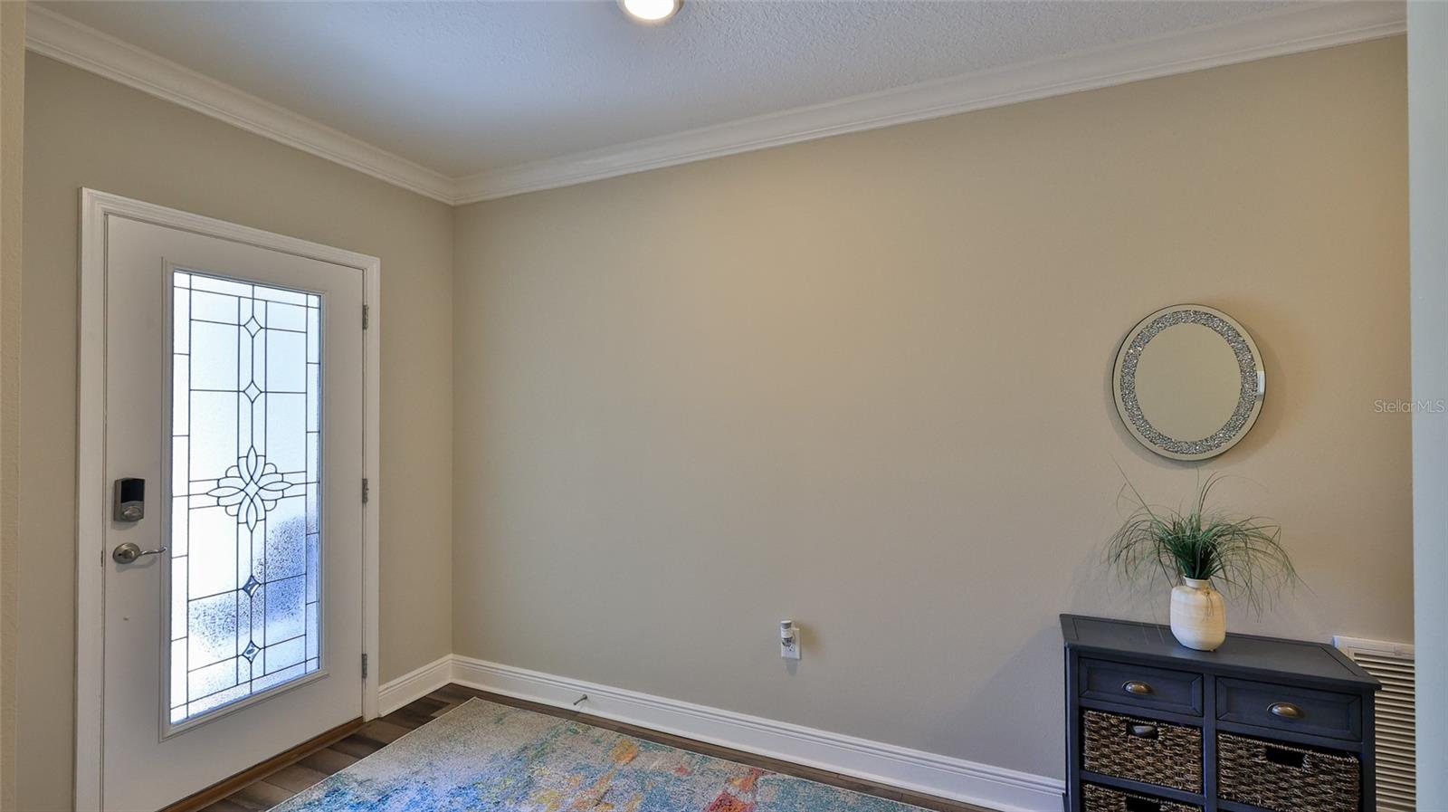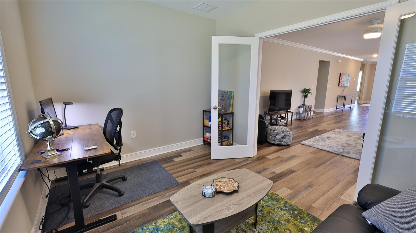 Maintenance free living in the 55+ community of Huntington Green at Hunter's Ridge. This home was finished in late 2022 and features 3 bedrooms, 2 baths, kitchen with large center island overlooking great room and dining area. Other upgrades including deluxe kitchen cabinetry, quartz counters, Samsung stainless appliances, crown molding, designer vinyl flooring throughout, ceiling fans and blinds on all windows. Large primary suite with walk in closet and primary bath with tile flooring, double vanity, large shower with 3 shower heads, glass doors. Bonus/flex room and screened porch overlook large back yard with views of lake. Two car garage. Huntington Green also has a private pool and club house with fitness plus owners can use two other clubhouses in Hunter's Ridge Community. Main and Sub HOA fees total $352 / month.