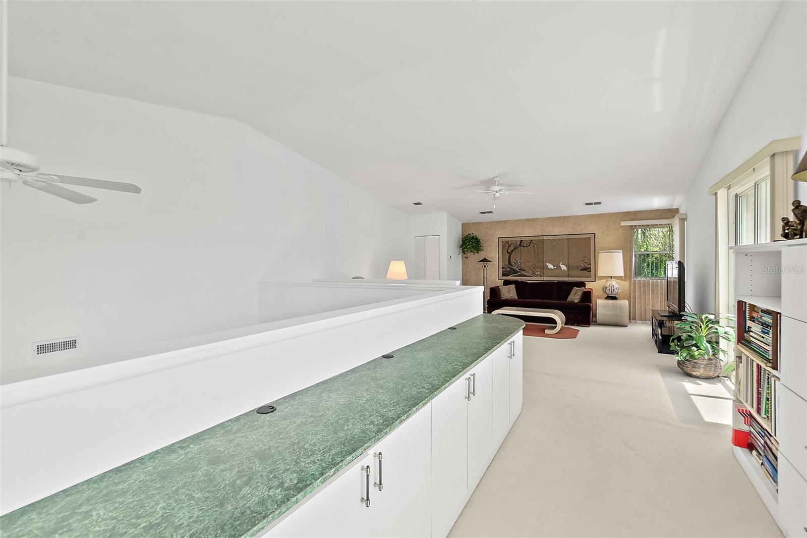PREMIUM GOLF COURSE front home with 2 bedrooms plus office and grand bonus room! Upon entering your glass front door, you are greeted with lots of natural light and a spacious open floor plan! Dining Room space has tile floors & large windows. It flows right into family room with 2 story ceiling. Large kitchen with newer refrigerator and dishwasher, pantry, Eat-in kitchen space with sliders out to courtyard area. Downstairs Master Bedroom offers 2 walk-in closets, private door out to patio, tile floors, & beautiful golf course views. En-Suite Master Bath has 2 sinks, vanity area, walk-in shower, sliders to side courtyard, and easy access to washer/dryer, located in master bath. 2nd Bedroom is a Jr. Suite, grand in size. 2nd bath is connected with tile tub/shower combo.Additional sunroom with sliders to outdoor space and showcasing your golf course views. Downstairs is completed with 1/2 bath great for guests. Head upstairs to your additional living and office space combo. All with splendid views and practical built-ins. Well maintained, cul-de-sac home with major items updated. New roof in 2017, 2 A/C systems, both replaced (around 2021), transferable termite bond, great storage throughout, 2 large bedrooms, lush landscaping, great location within community and easy access to gate/amenities, plus more. TURN KEY OPTION AVAILABLE. Truly stunning lot on The Founders Golf Course of Plantation Bay. Located in GATED, golf cart friendly community of Plantation Bay. Plantation Bay has optional country club membership to include 45 holes of golf, BRAND NEW premium clubhouse, tennis courts, pickleball, 2 community pools and cabana, bocce ball, and more. Buyers of this home to receive a substantial discount on initiation fee at the club. Ask listing agent for details. Fantastic location & well maintained, an impressive property!