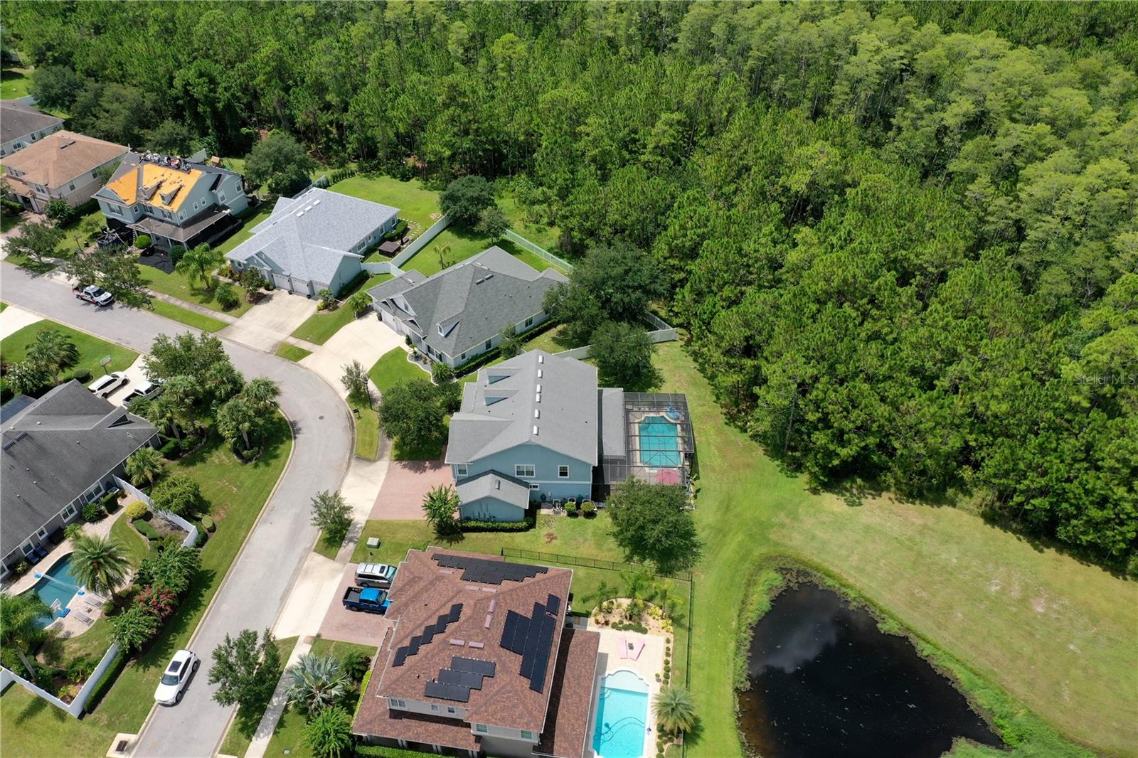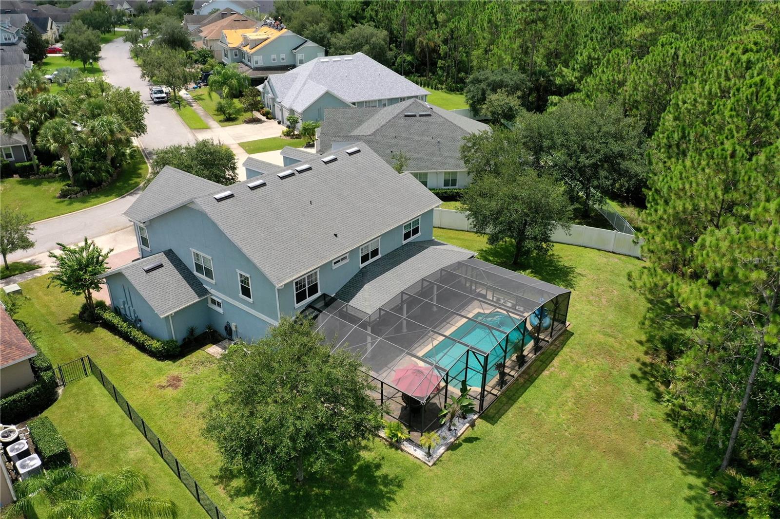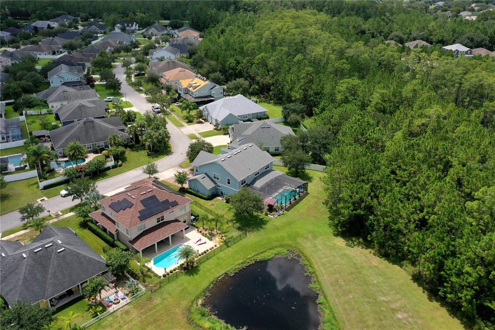 Welcome to this beautifully maintained 4-bedroom, 2.5-bathroom, 3-car garage home in the prestigious Deer Creek subdivision of Hunters Ridge! Nestled on a premium lot with unobstructed views of a serene lake, pond, and wooded reserve, this property offers unparalleled privacy and tranquility, perfect for relaxing by your pool. Upon arrival, you'll be impressed by the underground utilities, lush landscaping, and the charming paver driveway and walkway. The spacious wraparound front porch adds to the home's inviting curb appeal. Inside, this 3,327 sq ft Martha Stewart Signature Home features a spacious floor plan with 8' doors and 9' ceilings adorned with crown molding. Natural light floods the home through numerous windows and sliders. The expansive formal dining room flows seamlessly into the large family room, both of which have new LVP flooring that leads you to the covered lanai and pool area. The island kitchen is a chef's delight, boasting a cooktop, double wall oven, new refrigerator and dishwasher, granite countertops, 42” Merillat cabinets with crown and light rail moldings, a decorative glass backsplash, and a massive walk-in pantry. Adjacent to the kitchen is a cozy dinette area. Additionally, a convenient mud room off the garage and a half bath enhance the home's functionality. Upstairs, a loft with a pool table (included) provides a fun space for recreation. The primary suite is a luxurious retreat with a walk-in closet, two linen closets, and an all-tile bathroom featuring a double vanity with granite tops and a separate tub and shower. Three generously sized guest rooms share a well-appointed full guest bath with a granite-topped vanity and a shower/tub combo. The upstairs laundry room, complete with a washer and dryer, cabinets, and a folding area, adds to the home's convenience. Step outside through either set of sliders to enjoy breathtaking views of the lake, pond, and wooded reserve from the expansive paver lanai. This outdoor oasis is perfect for entertaining, with both covered and open areas ideal for grilling, sunbathing, or simply relaxing. The lanai is fully screened with a brand-new installation in 2023, ensuring a bug-free environment. The partially fenced yard remains lush year-round, thanks to an irrigation system using reclaimed water. Additional features of this meticulously maintained home include a 3-car garage with custom shelving and a utility sink, hurricane shutters for the double-pane windows, two new AC's in March of 2025, new gutters, a security system, built-in surround sound in the family room, ceiling fans in every room, decorative chair rail, plantation shutters upstairs, 5 1/4” baseboards, and more. Don't miss the opportunity to see this stunning home in Hunters Ridge and its amenities such as; clubhouse, two pools, tennis courts, basketball court, baseball field, soccer field, parks, a fishing pier and canoe launch. Schedule your visit today and experience the perfect blend of luxury, comfort, and natural beauty. Make sure to watch the virtual tour which is a walkthrough video and then schedule a showing today!