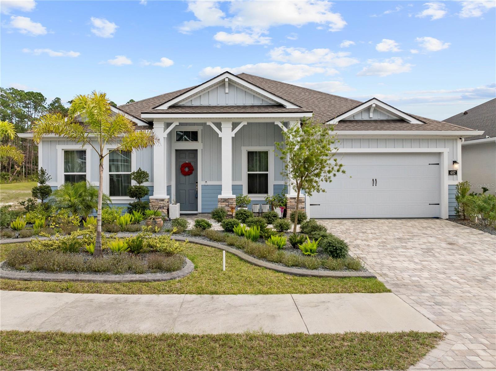 Why wait to build when you can move into this stunning 4-bedroom, 3-bathroom home, complete with an office/den and a 3-car tandem garage, located in the impressive, gated golf community of Plantation Bay. This Costa Mesa model, featuring the stylish Florida Vernacular elevation, offers modern elegance throughout, with ceramic wood tile flooring, soaring ceilings, and an open-concept layout perfect for entertaining and family gatherings. Designed with European flair, this home boasts designer paint, custom window coverings, exquisite landscaping, and an outdoor living space. The chef’s kitchen is a masterpiece, with quartz countertops, a large island with eat-in bar, extended cabinetry, a beautiful tile backsplash, and premium stainless-steel appliances. A hidden walk-in pantry adds both style and practicality to the space. A whole-house water purification system provides reverse osmosis drinking water. Wake up to serene pond views from your luxurious primary retreat, featuring a tray ceiling, an oversized walk-in closet, and a spa-inspired en-suite bath. The split-floor plan offers guests privacy and flexibility, making this home ideal for any lifestyle. Step outside to a beautifully designed lanai with leather-finished marble flooring, an outdoor kitchen, and breathtaking views of the tranquil pond and surrounding forest, which will remain undisturbed. The property is already prepared for your dream pool design and a screened enclosure. Located just minutes from I-95, Tanger Outlets, and top-rated restaurants, this is a must-see! Schedule your private showing today!