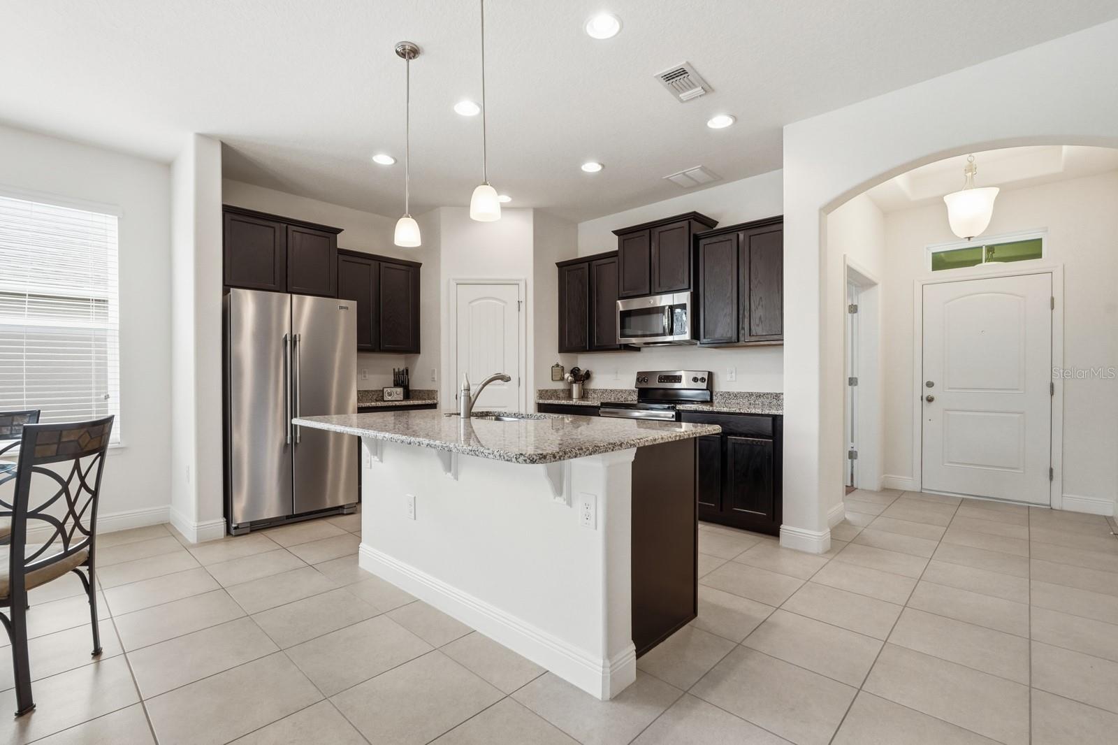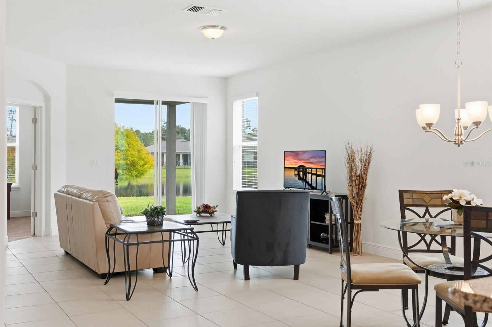 Move-in ready and beautifully, meticulously maintained home in the sought-after, exclusive custom designed River Oaks neighborhood, this 3-bedroom, 2-bath home with an office/flex room and a 3-car garage(one bay can be a workshop), 3 car wide driveway, offers effortless living and stunning lake views. Built in 2016, it features 1,813 sq. ft. of living space and a freshly painted (2 years) exterior. Step inside the foyer to find elegant tray ceilings and 9'4'' ceilings throughout, enhancing the home's spacious and airy feel. The open-concept layout seamlessly connects the kitchen, dining area, and living room, perfect for both everyday living and entertaining. The kitchen boasts stylish shaker cabinets, granite countertops, stainless steel appliances, an island with barstool seating, and a large pantry closet, including a drop zone or coffee bar. Tile flooring runs through the main living areas, complemented by cozy, well maintained carpet in the bedrooms. The primary suite showcases tray ceilings and an en-suite bath featuring dual vanities, a garden tub, a separate shower, and an expansive walk-in closet with abundant storage. Additional highlights include 6 inch baseboards throughout and a large indoor laundry room with a utility sink. Step outside to a covered patio overlooking the tranquil lake and fountainan ideal spot to relax and unwind. Conveniently located just minutes from 2 top-rated schools, shopping, dining, and the beach, this home truly has it all. Schedule your private showing today! All information taken from the tax record, and while deemed reliable, cannot be guaranteed.