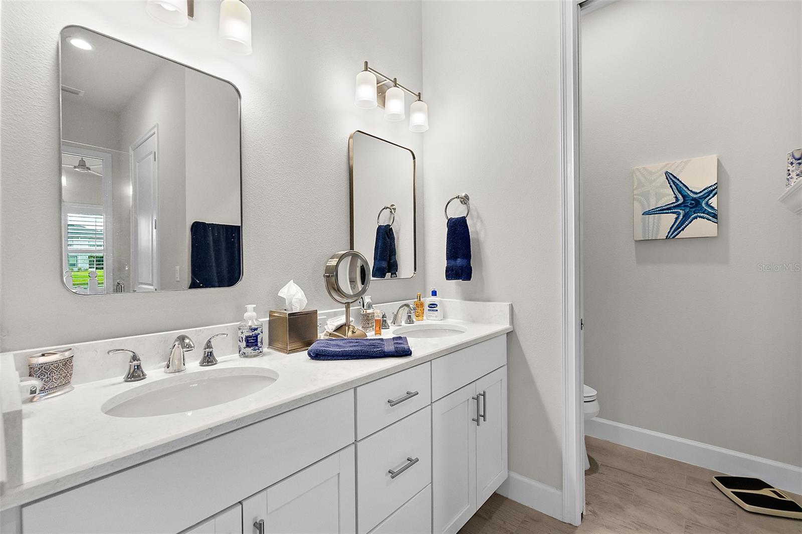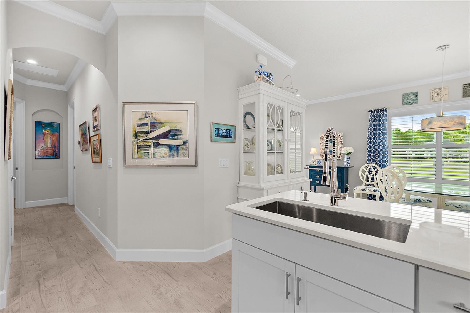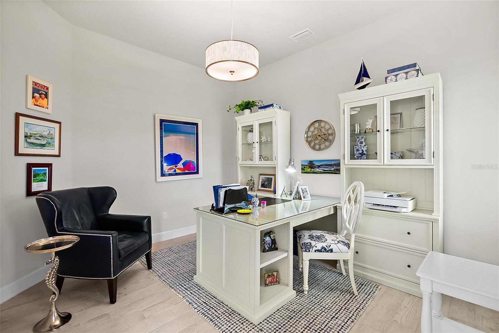 Welcome to this stunning 2-bedroom, 2-bathroom villa with a den/flex room, perfectly situated in one of Ormond Beach's most desirable communities. Overlooking tranquil waters with a soothing fountain, this home combines luxury finishes, thoughtful design, and low-maintenance living. Step inside to find upgraded wood-look tile flooring, plantation shutters, and upscale lighting throughout. The spacious, open-concept kitchen is a chef's dream, featuring 42'' upgraded cabinetry, quartz countertops and backsplash, a large farmhouse-style sink, corner pantry, and an upgraded range—all beautifully designed for both function and style. The primary suite is a peaceful retreat with elegant French doors, two custom walk-in closets, and a spa-inspired ensuite bathroom with a walk-in shower and private water closet. A split-bedroom layout provides privacy for guests, complemented by a well-appointed hall bath. Enjoy the flexibility of a separate den/flex room perfect for a home office, media room, or guest space. The laundry room adds everyday convenience, while the garage impresses with epoxy flooring and extra storage. Loaded with upgrades and move-in ready, this villa offers elegant living in a peaceful, scenic setting close to Ormond Beach's best amenities. Come join the Plantation Bay lifestyle! 45 holes of golf, tennis, pickleball, 2 pools, cabana, spa/fitness center and the New Clubhouse! Buyers of this home will receive a substantial discount on the initiation fees when you join within 30 days of closing
