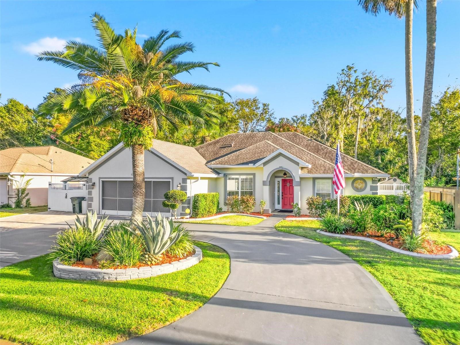 Directly across from the lake, this beautifully updated one-owner pool home radiates pride of ownership and refined Florida living. Step inside to discover thoughtful upgrades throughout, including a solar-heated, saltwater sport pool, a full solar energy system, and an updated kitchen and baths designed for everyday luxury. Enjoy tranquil water views from the front and serene natural views from back of the home — perfect for your morning coffee or a glass of wine at sunset. The pool area was designed for both relaxation and fun, featuring a deep center, shallow ends, sun shelf, and extended seating bench. An energy-efficient pool pump and well-fed irrigation system help keep utility costs and maintenance low. Inside, you’ll find non-skid laminate flooring, plantation shutters, tray ceilings, and tasteful coastal mural accents that capture the essence of Palm Coast living. The owner’s suite offers a true retreat with a garden tub, walk-in shower, dual vanities, and spacious walk-in closet. Additional highlights include a 5-seat hot tub, custom chandeliers (conveying with sale), Carport on the side of the home with double gate entry (perfect for parking your toys), Top Rated Schools, BRAND NEW ROOF, HVAC 2018 and serviced 2025, Water Heater 2021, Solar updated 2025, and Kitchen Appliances 2023. This is the perfect blend of comfort, efficiency, and coastal charm — all in one of Ormond's most desirable neighborhoods.