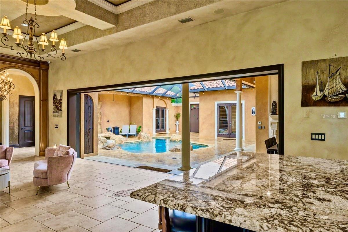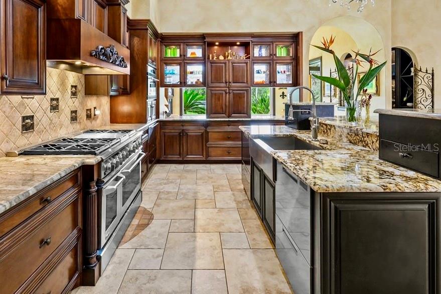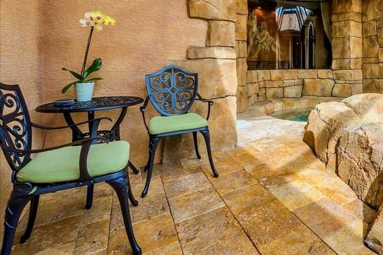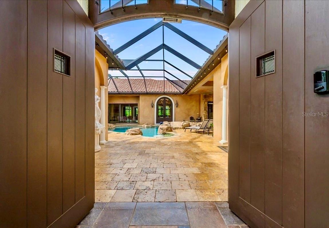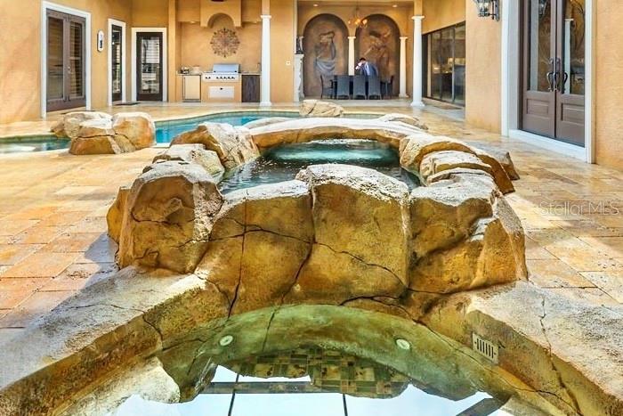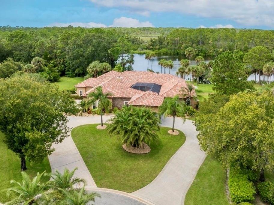 Along the serene waters of the Tomoka Preserve, stands a Mediterranean palazzo of rare distinction, created to be a piece of art in its own right. A scenic drive through the preserve, lined with majestic palms draped in Spanish moss, leads to this private waterfront estate offering a perfect balance of elegance and tranquility. Resting on 1.24acres of private lagoon front, this award-winning custom estate offers both prestige and seclusion. Blending elegance with nature, occasional deer may pause to watch you fish or canoe from the backyard. At the end of a quiet cul-de-sac, the home greets visitors with a regal canopy entrance, a sweeping-wide circular driveway, Venetian columns, Italian curved terracotta roof, paver-lined paths and tropical landscaping. A life-size “Signora dell’Acqua” fountain (lady of the water) and river rock gardens complete the essence of a Mediterranean retreat. Past the main gate, one will find a 2,294-sq.ft screened courtyard, complete w/ Venetian-style stone bridge across the travertine pool complex, featuring a waterfall, dipping pool, heated hot tub and a main saltwater heated pool with a swim-up bar, water curtain and controllable LED lighting. Outdoor dining is enhanced with hand-painted frescoed walls, a roofed kitchen & grill, an oversized fireplace anchors the lanai. Multiple covered seating areas, from coffee retreat by the spa to a central dining pavilion. Inside, soaring ceilings, some rising up to 16ft, hand-plastered walls, Italian-style frescos, and grand crystal chandeliers set the tone. The Grand Room offers panoramic views of the river and courtyard; The chamber of custom display cabinetry is complemented by wine and coffee bar, complete with cast-iron French doors and frescos of the Italian countryside. Pocketing glass doors dissolve boundaries between indoors & out, inviting breezes from the lagoon. The kitchen combines elegance with function: Monogram appliances, a 6-burner stove w/ griddle, double ovens, dual Fisher & Paykel dishwashers, floor-to-ceiling custom cabinetry, a granite island, a spacious walk-in pantry, serving stations, and abundant storage. The master suite is a private sanctuary with oversized windows and direct access to the outdoor spa. Hand-painted frescoed hallway leads to dual vanities & expansive stone double shower. Two oversized walk-in closets offer crystal chandeliers and solid wood shelving. Additional bedrooms include a in-law suite w/ a private courtyard entry, a junior suite with French doors and a flexible media lounge/ bedroom w/ veranda access. Beyond the bedrooms, the estate surprises at every turn. A walnut-clad office conceals a secret “Hide-Away Room,” while the Relaxation Room features a fireplace & river views. Card Room opens to the dining space. Even the foyer impresses with a cast-iron French glass door and chandelier. While steeped in romance, the home is built for peace of mind. Some of the recent updates include a 6-zone irrigation system with new well, pump, Wi-Fi controls, termite protection, upgraded pool/ spa mechanics & heaters. The new water filtration system provides exceptional water quality. This estate also offers a whole-house vacuum system, 32-camera monitoring, invisible dog fence, hurricane shutters, a hidden safety room, a climate-controlled garage & a whole-house generator. Truly a rare offering: being one of two estates with direct lagoon access to the Halifax River. This Venetian Palazzo is more than a home- it’s a statement.
