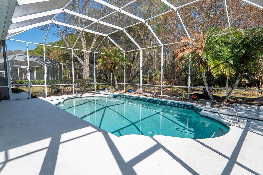 Pride of ownership shines throughout this immaculate well maintained one-owner home. The house sits on a quiet cul-de-sac within a private golfing community and backs up to a conservation area giving lots of privacy. This ICI Preakness model is one of the most popular models and is surrounded by mature landscaping has an open concept with 4 bedrooms and 3 bathrooms. Enter the home through double glass doors to soaring high ceilings and sight throughout the main areas of the home. This bright and airy home has both a formal living room and a dining area, ideal for entertaining, along with a family room open to the kitchen for a more relaxed living space. The kitchen also has a nook for casual dining. Family room has access and views out to the pool and lanai. Primary bedroom which also has patio doors out to the pool, has a large ensuite with separate wc and large walk in closet. A further bedroom with built in storage and desk and a bathroom down the hallway completes this side of the house. There are a further 2 bedrooms and bathroom on the other side of the house. Plantation Bay offers 45 holes of golf, 2 clubhouses, swimming pool, lighted tennis courts, pickleball courts and a state of the art fitness center. There are many different levels of membership available. Watch the virtual tour to truly appreciate what this home has to offer.