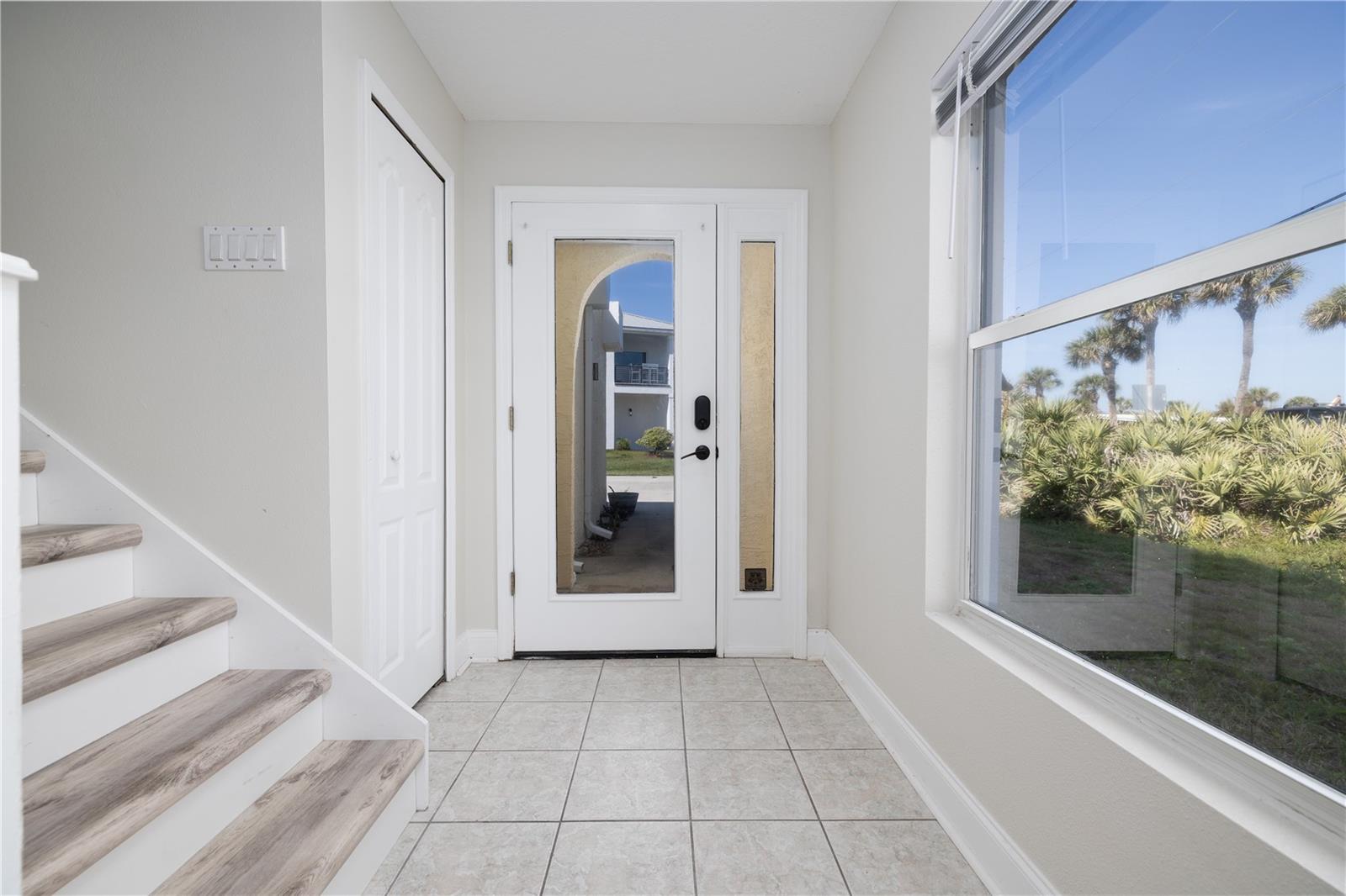 One or more photo(s) has been virtually staged. Unique 3-story Spanish Mediterranean townhome offering expansive panoramic ocean views from the balcony, over 1000 sq ft rooftop deck, living room, and both primary suites. Conveniently located directly across the street from the beach, this property provides easy access to the quiet, uncrowded shores of Ormond Beach—perfect for morning walks, sunrise and sunset views, and enjoying the relaxed coastal lifestyle. This spacious three-floor townhome features high ceilings and two primary suites, each with a walk-in closet and en-suite bathroom. The second-floor primary suite includes a private adjoining balcony where you can step outside and enjoy ocean breezes while sipping your favorite beverage listing to the ocean sounds. An open loft area on second floor provides additional flexible space ideal for a second living room, office, or lounge. Additional seating area on the second floor perfect for reading a book or working. The third floor showcases a bright sitting area filled with natural light, a wet bar, and access to a massive rooftop deck overlooking the ocean and beach—perfect for entertaining guests or relaxing while taking in the views. The large kitchen offers granite countertops, stainless steel appliances, plenty of soft-close cabinetry, and an archway opening to the spacious dining and living areas. Flooring is consistent throughout the first floor with wood-look porcelain tile, while the entire second floor features new luxury vinyl plank flooring. Additional features include hurricane shutters, a large driveway with plenty of room for guests, a spacious two-car garage, and an interior washer and dryer. This home is being sold furnished, making it ideal as a second beach getaway, a primary residence, or investment opportunity. Located in the quiet seaside community of Ormond-by-the-Sea, walking distance to restaurant, yet still close to the excellent restaurants, shopping, and amenities the City of Ormond Beach has to offer.