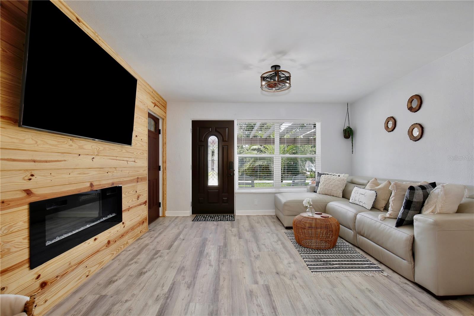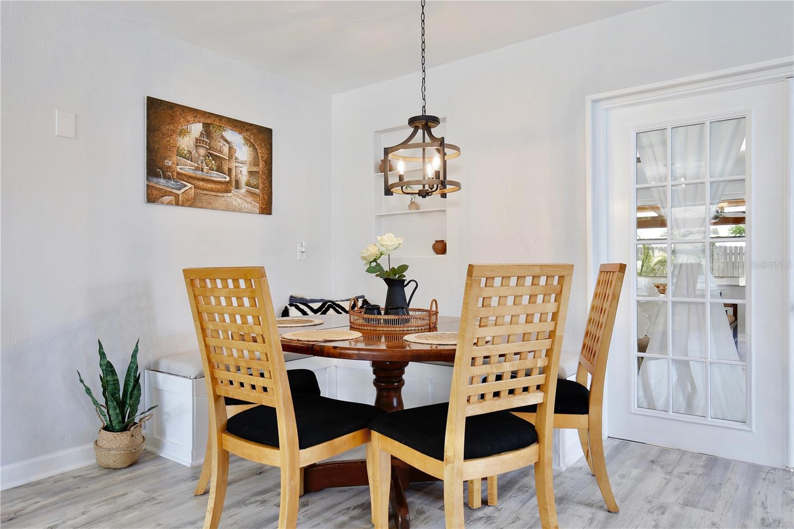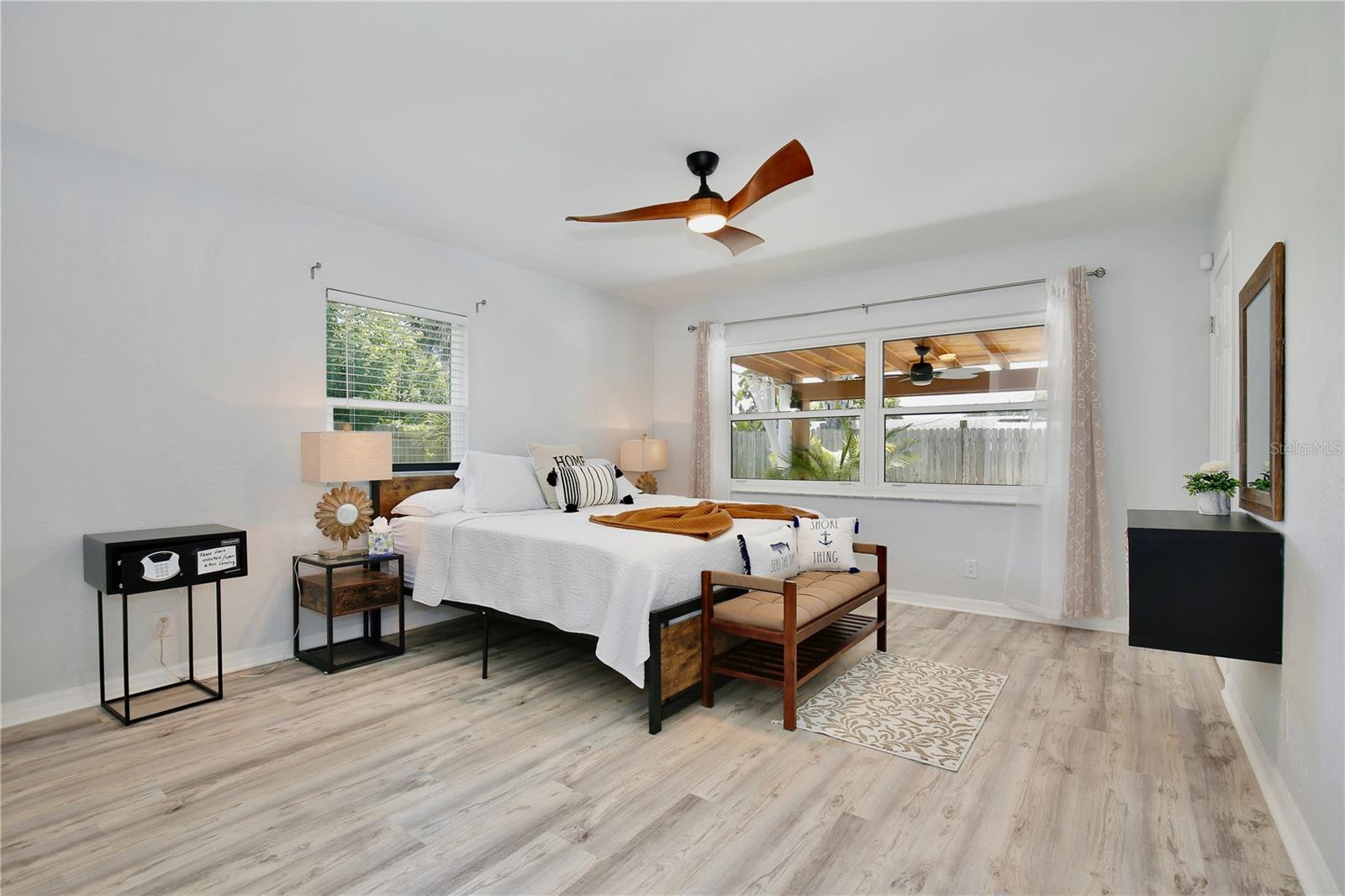 Experience coastal living at its finest in this charming haven, where you’ll be walking distance from public beach access, fishing piers and riverside parks—tailored for those who dream of a life by the water. Presenting a cheery exterior complemented by a pergola framed entrance, this home welcomes you to beachside bliss. Step inside this FULLY FURNISHED BEACH HOME to discover an open and airy floor plan that exudes warmth and style, with wood look vinyl floors and a harmonious palette of neutral colors throughout. The rustic light fixtures add character, while the living room draws you in with its wood panel TV accent wall featuring a cozy electric fireplace. The living space flows seamlessly into a dining area boasting built in booth seating, perfect for gathering with friends and family. Enjoy cooking family favorites in the light and bright kitchen, equipped with lustrous granite countertops and stainless steel appliances. Your private retreat awaits through French doors in the primary bedroom, offering serene views of the tropical backyard. Across the hall, the modern bathroom showcases a sleek glass door shower and stylish vanity. Guests will feel right at home in the spacious and welcoming bedrooms, while the second bathroom features a classic tub/shower combo and chic beadboard paneling. The laundry room completes the interior with a Whirlpool washer and dryer, ample cabinet space, and wooden floating shelves. Your personal tropical oasis awaits outdoors, featuring a covered paver patio with ceiling fans and enchanting lantern lighting. Follow the stone walkway to a cozy hammock corner, perfect for summer grilling and relaxation. The fenced yard is an ideal playground for pets and outdoor activities. Situated just steps away from Publix, dining, and leisure at Argosy Park with beach access, and also less than a mile from public fishing docks and parks on the Halifax River, this home combines the serenity of beach living with the convenience of nearby amenities. Spend the weekends fishing, boating, and soaking up the Florida sun. Don’t just imagine life in this coastal gem; immerse yourself in the 3D virtual tour and call today to schedule your personal showing!