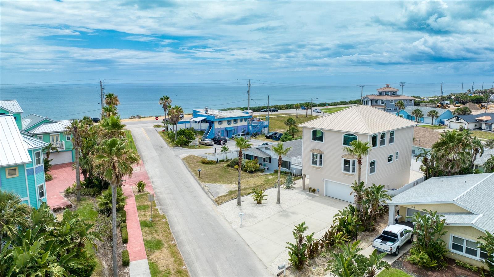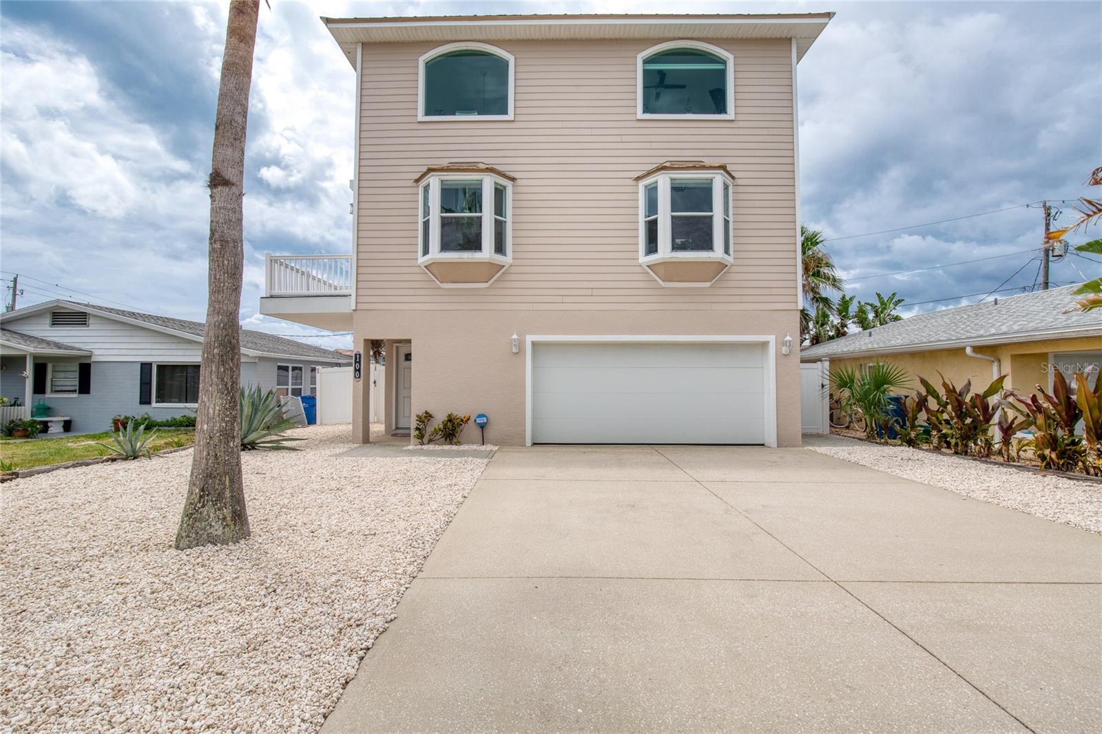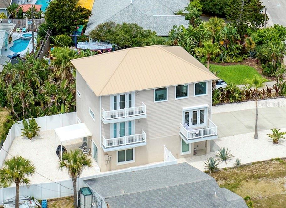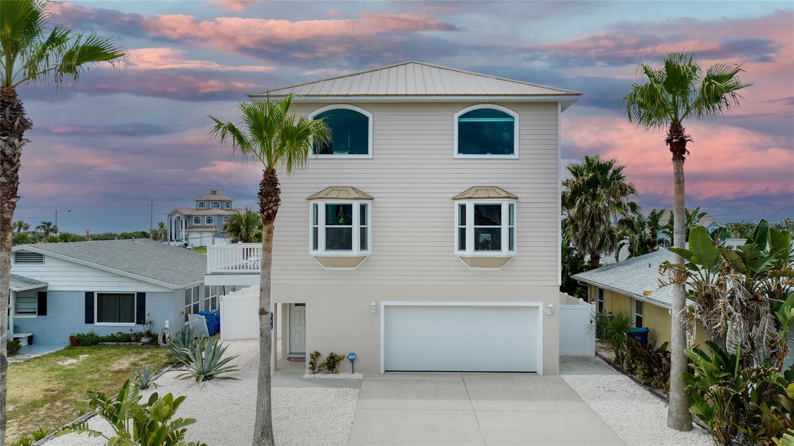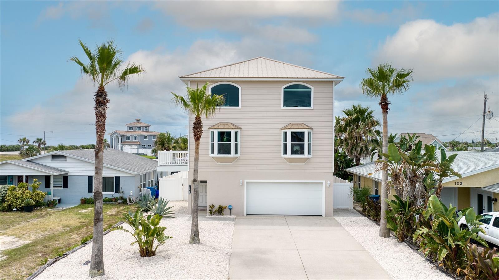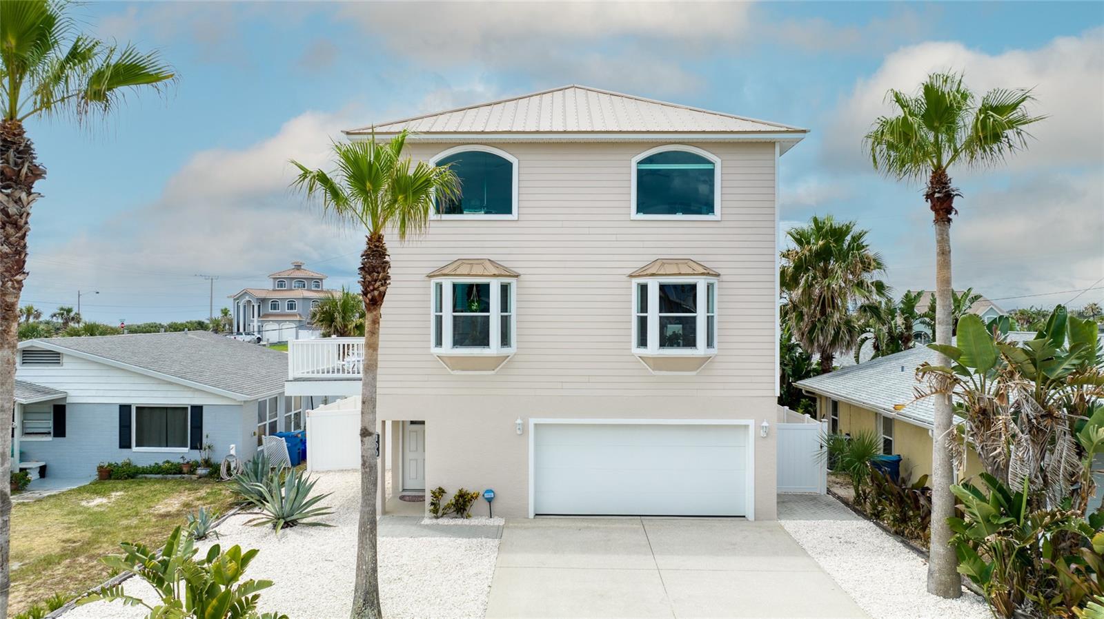 Million dollar views without the noise or traffic of A1A is what you will find in this updated one-of-a-kind 3 Bedroom 3.5 Bath 2500+ square foot three-story (with balconies) Key West Style Beach House. Each of the large bedrooms is on a separate level and includes its own ensuite bathroom. The open concept kitchen has custom cabinets, quartz countertops, a large island, and an eat-in dining area with a beautiful bay window view. There are amazing ocean and 360-degree views from the oversized windows in the third-floor loft & bedroom area, which also includes a peek of the Intracoastal. Enjoy your morning coffee watching the sunrise over the Atlantic Ocean.The front yard and fully fenced back yard have been completed with low-maintenance tropical desert landscaping. The covered backyard patio was designed and constructed in 2019. No need to worry, because this home has been meticulously maintained with a new metal roof and hurricane impact windows/doors including the garage. The A/C system was replaced in 2023 along with a water heater, dishwasher, ceiling fans and light fixtures. In 2024, the garage door opening system, microwave and electric range were replaced. Beautifully updated bamboo floors encompass the 2nd and 3rd floors. Square footage from tax rolls. All info intended to be accurate but can't be guaranteed.