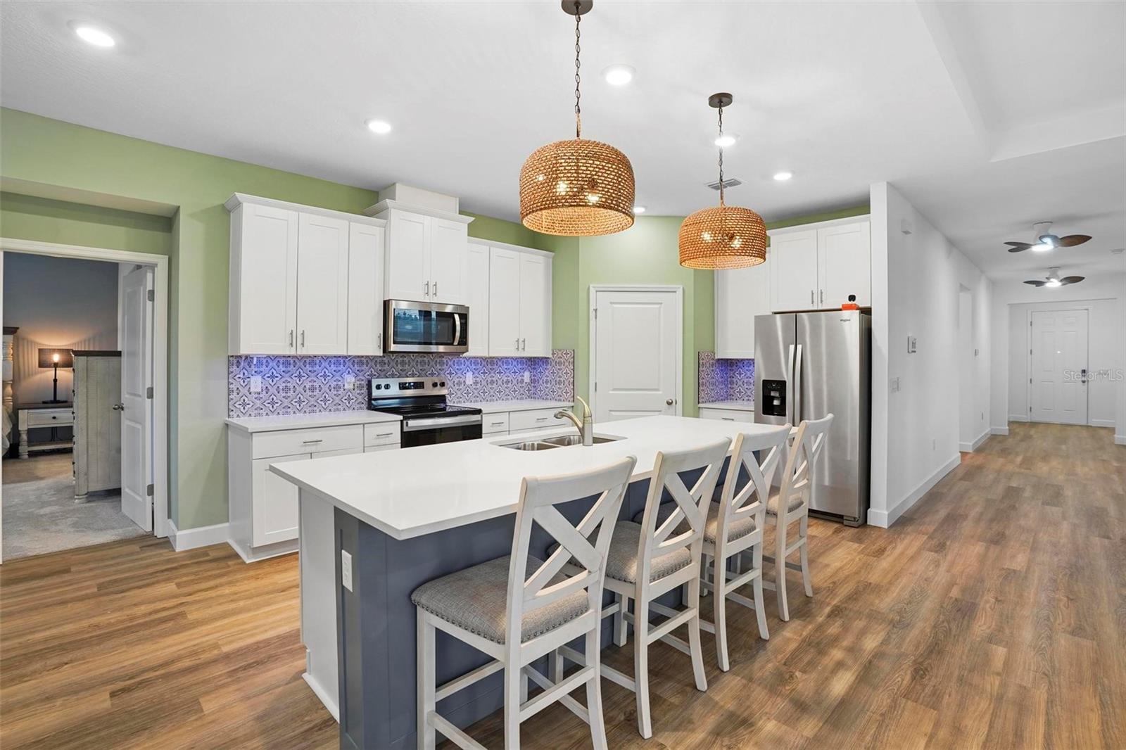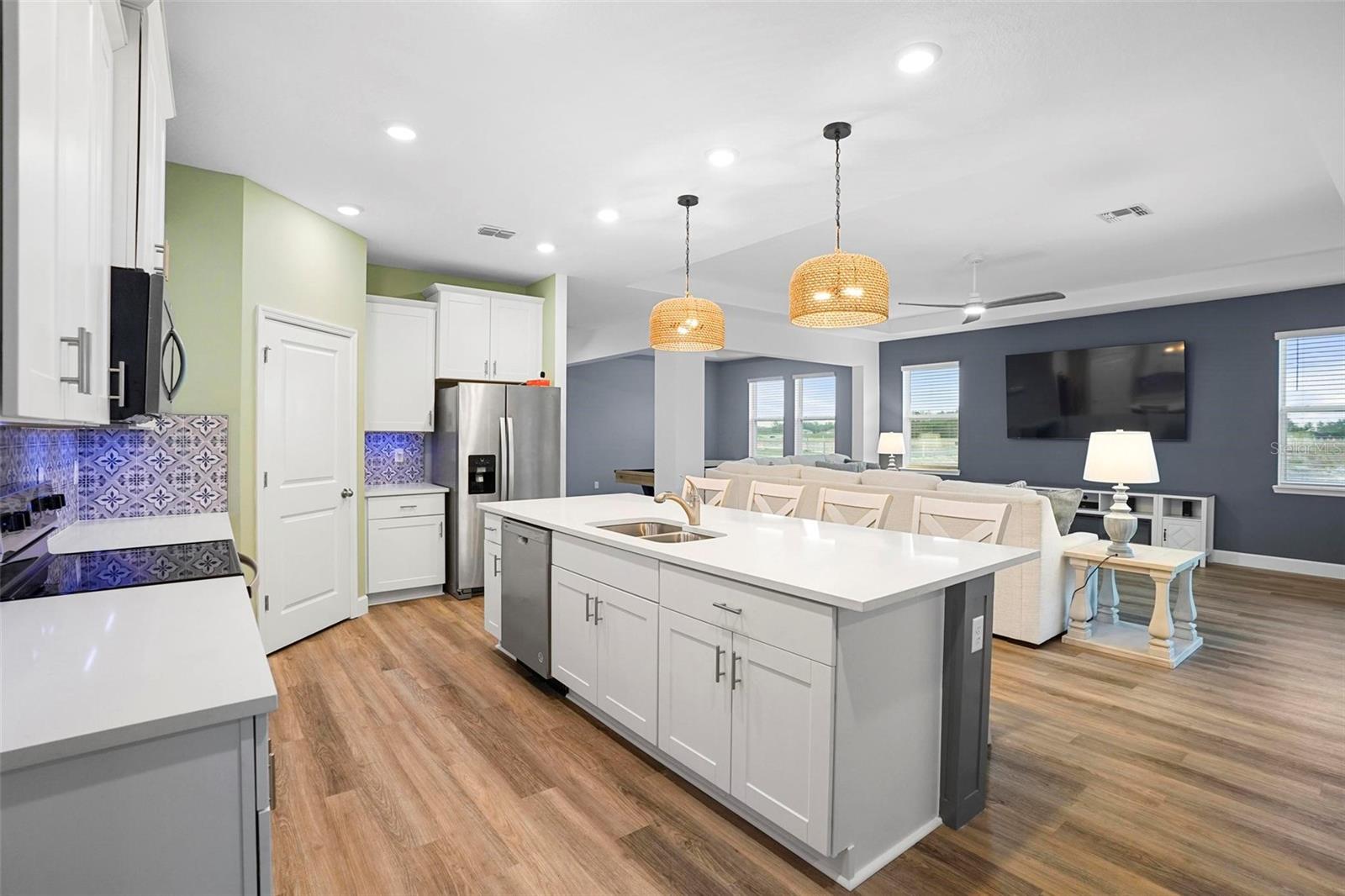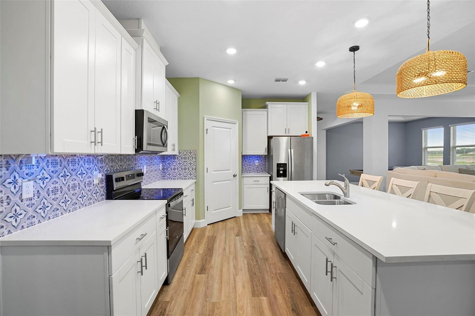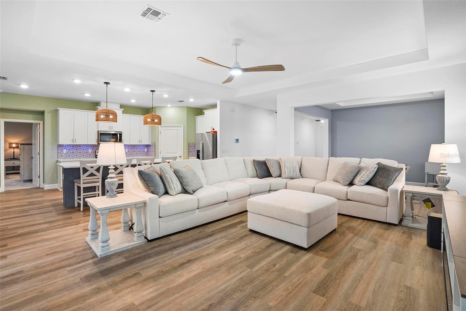 Say hello to the Upgraded Camden model in Archer Mills—a home unlike any other in the neighborhood! This multi-gen smart home layout offers two homes under one roof with the convenience of lawn maintenance in the HOA dues, it's ideal for a second home or a primary residence and comes complete with all the upgrades you've ever wanted! You enter into a beautiful open foyer and greeted with two guest bedrooms that share a stylish Jack and Jill bathroom. This bathroom isn't just functional; it's a standout feature with its elegant double vanity and luxurious rectified porcelain tiles in the shower and flooring. Moving down the hall, you'll find a spacious dining room, perfect for family gatherings or additional living space. The heart of the home is the kitchen, which seamlessly connects with the great room. It shows beautifully with granite countertops, stainless-steel appliances, newly added soft-close doors and a pull-out trash can, new pendant lights, and fun 8x8 rectified porcelain deco tiles that brings the whole house together. Adjacent to the kitchen is a café area that offers views of the oversized covered lanai, ideal for casual dining. The master bedroom, situated at the rear of the house includes two walk-in closets and an ensuite bathroom. This bathroom is updated with 24x48 rectified matte porcelain tiles, a shower floor with mosaic porcelain tiles with heated drop-in tub, and 12x24 rectified porcelain tiles on the bathroom floor. What truly sets this home apart is its separate suite. This suite includes its own private entrance, living space, bedroom, kitchenette, polished 24x48 rectified porcelain tiles on the walls, and 12x24 rectified porcelain tiles on the bathroom floor and heated drop-in tub. This smart home is equipped with cutting-edge technology, allowing you to control various features with your smart device. The interior highlights new Sherwin Williams satin Super Paint, with flat paint on the walls and semi-gloss Sherwin Williams Duration paint on the trim and doors. The exterior is now protected by Sherwin Williams Duration acrylic latex paint, resistant to moisture and mold. Additional upgrades include ceiling fans throughout, LED lights under the kitchen cabinets and upgraded carpet in all the bedrooms to a luxurious 60 ounces with a waterproof Life Proof pad. Sellers also added a second garage door opener with built-in camera and WIFI and an epoxy-finished garage floor with hookups for a generator or an electric car and updated Mud room nicely done with storage and a bench. Don't miss the opportunity to make this exceptional home yours!! Schedule your showing today!!