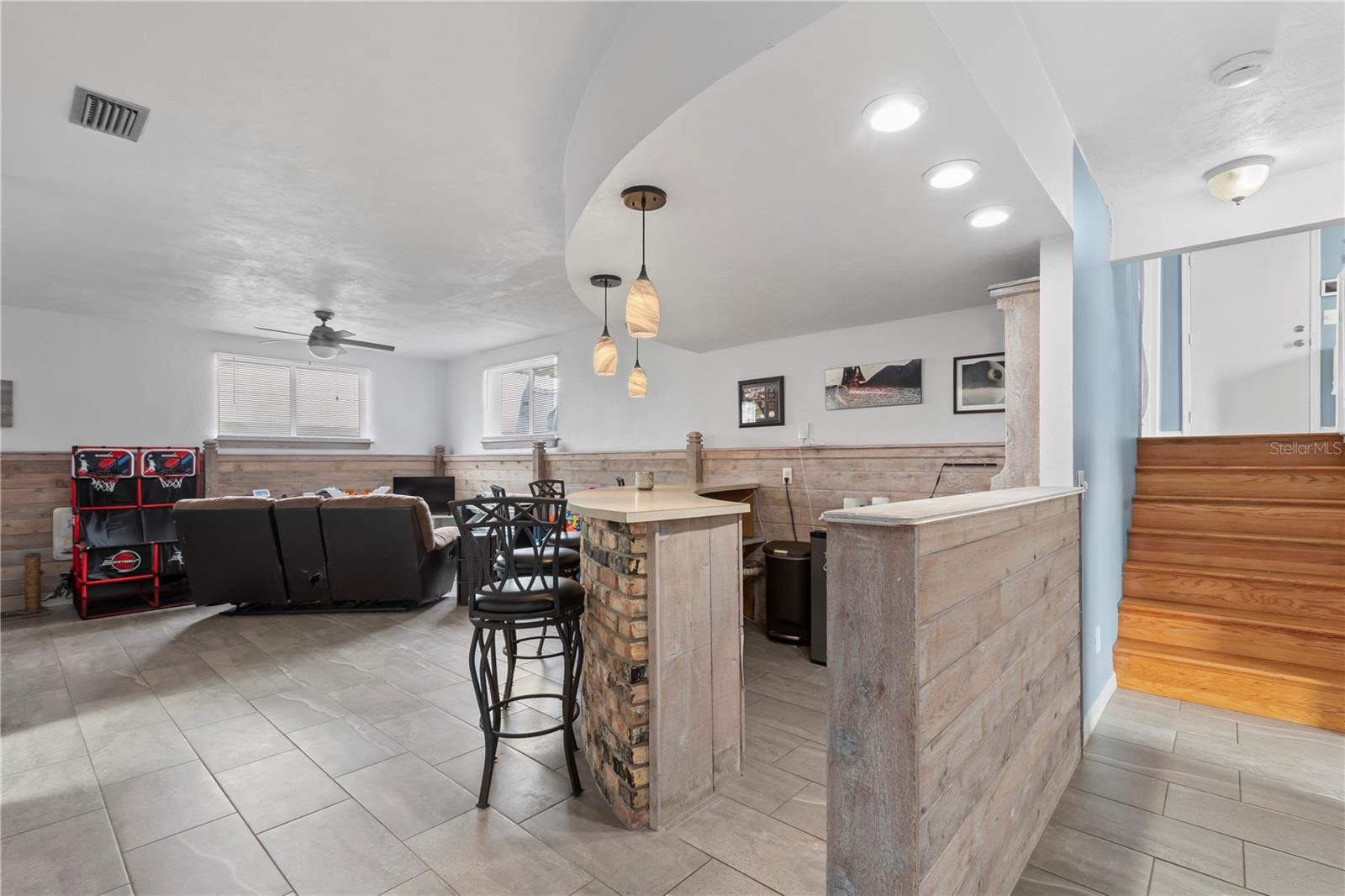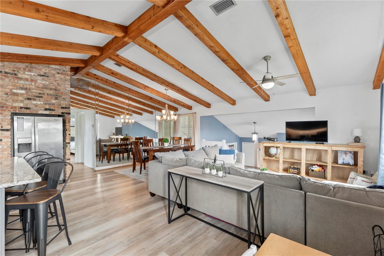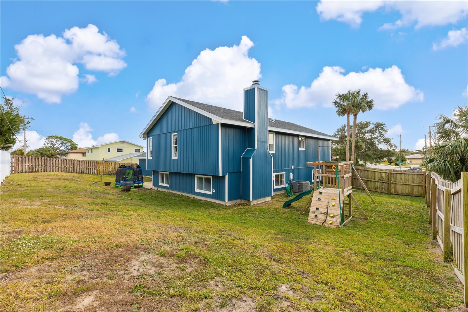 Just a short stroll to the beach, this beautifully updated home offers the perfect blend of modern living and coastal charm. The kitchen was fully remodeled in 2022, featuring sleek finishes and a bright, open design. In 2022 the upstairs A/C was replaced, and the newly installed vinyl siding (2024) enhances curb appeal and durability. Roof is from 2018. Step inside to discover soaring high ceilings with exposed beams, creating a spacious and inviting atmosphere throughout. Relax by the cozy wood-burning fireplace in the bonus area downstairs that is perfect for a game/playroom, mancave, office or extra entertainment area. The oversized garage is perfect for all your storage needs and has its own half bathroom for convenience. Ideally located just a short distance from Ormond's main street, this home offers easy access to all the shops, dining, and local attractions the city has to offer without being in an HOA! Don’t miss this opportunity to live the beachside lifestyle you've been dreaming of!