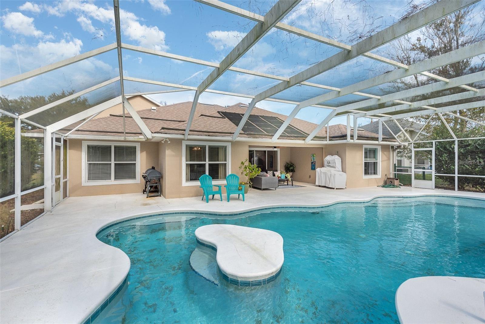 Step into this exquisite 4-bedroom, 3-bathroom residence, designed for those seeking both luxury and functionality. The home is highlighted by soaring vaulted ceilings and triple sliders that open to a secluded screen backyard solar pool with overflowing spa. This thoughtfully configured home provides versatile room use possibilities to suit your unique lifestyle. The lower level features four spacious bedrooms plus an office, while the upper level unveils a sprawling bonus room, perfect as an in-law suite, entertainment area, or whatever your heart desires. This versatile space is equipped with a wet bar, closet, pre-wiring for sound, and a well-appointed bathroom. Recent upgrades enhance the allure of this property, including a newer roof, glass front door and garage door. Contemporary ceiling fans add to the stylish and comfortable living environment. Step into your backyard oasis, designed for elevated entertaining around the solar-heated, screened-in pool with a sunbathing island and outdoor shower. Safety and peace of mind are ensured with the home's robust block construction and hurricane shutters, including motorized shutters for the rear lanai and front door. Situated in the Hunters Ridge neighborhood, residents enjoy access to upscale amenities such as a tennis court, two community pools, a clubhouse, and extensive sidewalks perfect for leisurely strolls.