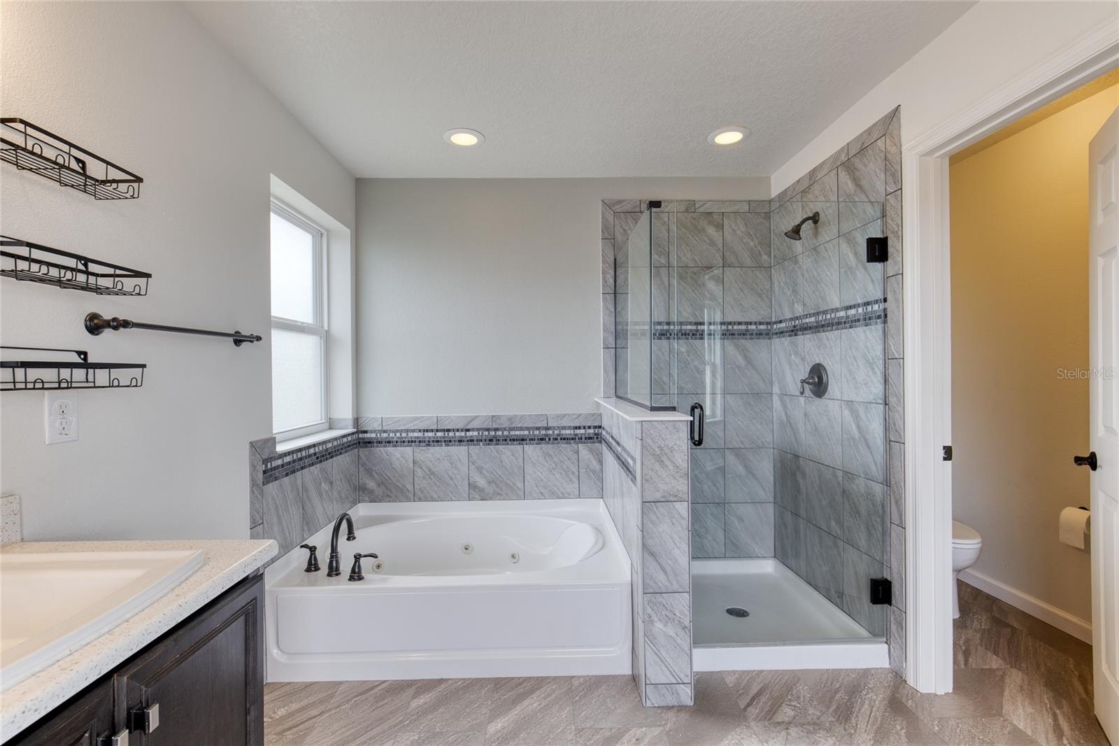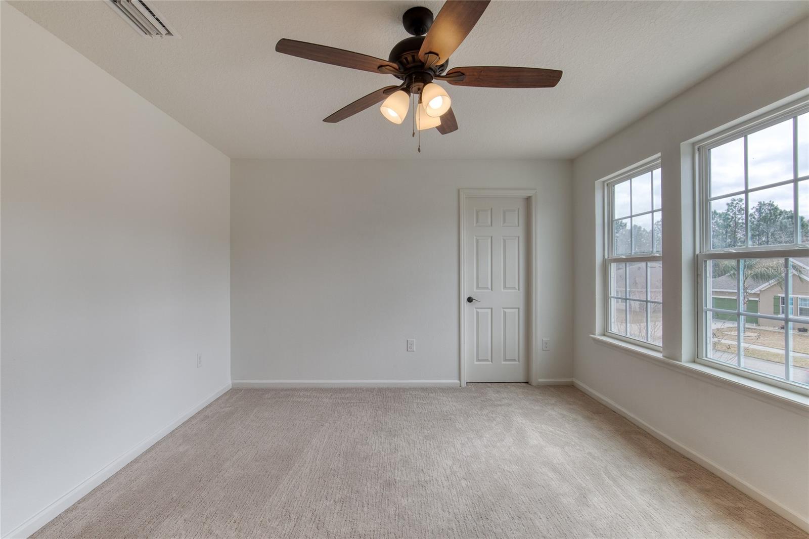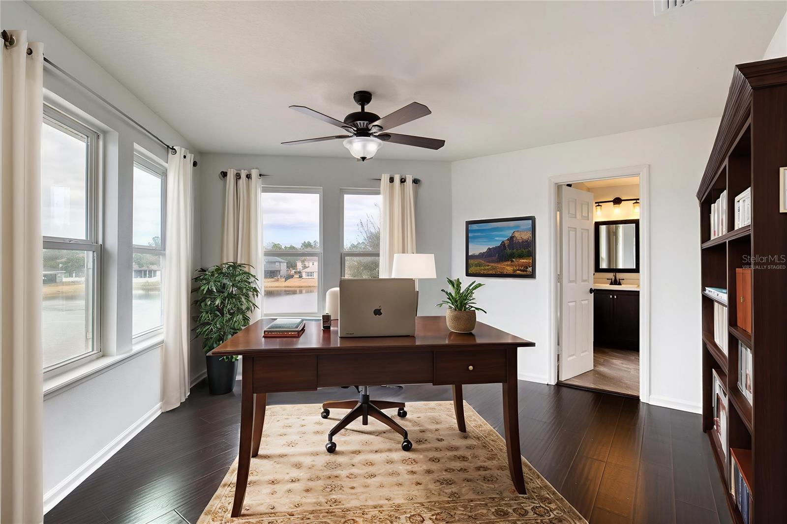 One or more photo(s) has been virtually staged. Beautiful, Waterfront 4 Bedroom 2.5 Bath 2 Car Garage with over 2800 SQ FT of living space in the sought-after Hunters Ridge community. The main level is designed for durability featuring luxury vinyl plank flooring that transitions from the entryway den into a spacious living area centered around a fireplace. The open kitchen is fully equipped with ample counter and storage space, granite countertops, center island with breakfast bar, upgraded cabinetry, dual pantries and stainless steel appliances. Enjoy tranquil views of the fountain on the lake from the living area, kitchen and eat-in dining space. Step out to the fully screen enclosed lanai to enjoy a well equipped summer kitchen. The second floor features all four bedrooms and plush carpeting. The expansive primary suite is large enough to accommodate a separate sitting area or office nook and includes architectural tray ceilings, walk-in closet with custom built-ins, double sink vanity, walk-in shower, and Jacuzzi soaking tub. Enjoy two spacious bedrooms with access to the guest bathroom featuring a double sink vanity and walk-in shower. The oversized fourth bedroom is the ultimate flex space and could easily function as a play room, work out room, or office. Recent upgrades include a 2023 A/C and fresh interior paint . For additional piece of mind, the property is fully equipped with corrugated hurricane shutters. The community of Hunters Ridge offers extensive amenities including two swimming pools, a clubhouse, tennis and pickleball courts, a fishing dock, and a canoe launch. Square footage per tax rolls. All information intended to be accurate but not guaranteed.