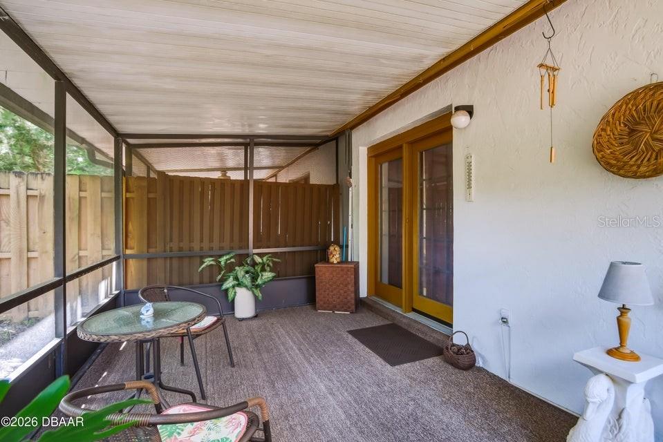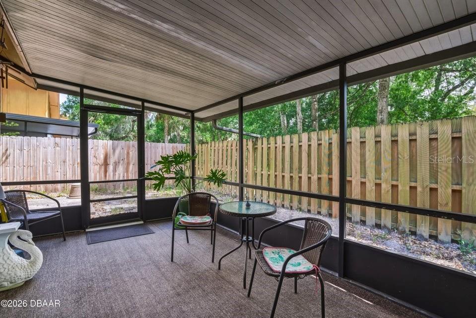 Step into a very well maintained, move-in ready home tucked on a quiet street in The Trails. The open single-level floor plan flows from a bright living area with a cozy fireplace to a refreshed kitchen and dining space. Many interior updates have been completed so you can unpack and enjoy. The screened porch overlooks a shaded, private yard framed by mature oaks, perfect for morning coffee or evening relaxation. Step out your back fence for quick access to the trail system. Two bedrooms, two full baths, large walk-in closet in the master and an attached two-car garage deliver comfortable, convenient living, mostly yard maintenance free. The Trails is a well-established, deed-restricted neighborhood just minutes from shopping, dining, schools, I-95, and the beach. 2019 Roof. Measurements are approximate, buyer to perform due diligence and verify all information. Furniture is available outside the RE transaction. Residents enjoy a resort-style pool, clubhouse, walking trails, and tennis courts managed by The Trails Homeowners Association, making this an ideal choice for buyers seeking both tranquility and community amenities.