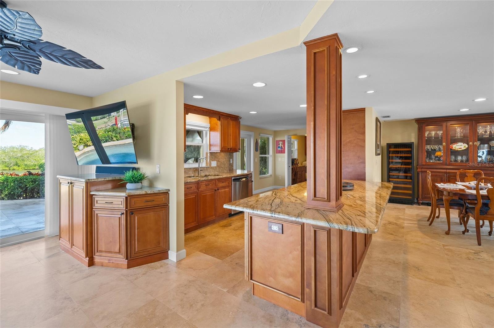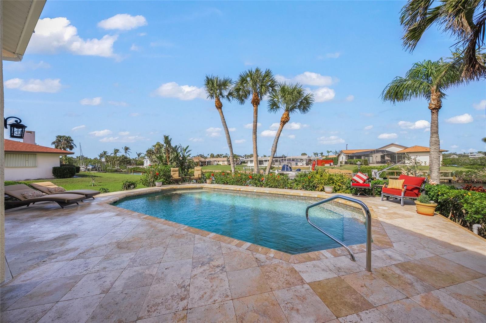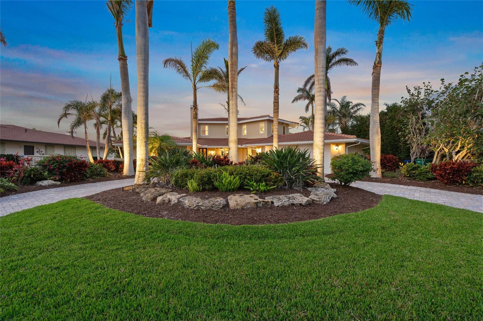 This exquisite waterfront residence offers a dreamlike lifestyle with expansive views of the canal and bay, making it a gem in Sorrento Shores. Boaters dream, 10,000-pound lift in your backyard, 20 minutes to Venice Inlet with access to the turquoise waters of The Gulf. On a prime cul-de-sac lot, the home boasts a stunning circular driveway adorned with majestic Royal Palms, enhancing its curb appeal. As you step inside, you're greeted by breathtaking views that set the tone for tranquil living. The great room, featuring a cozy gas fireplace, serves as the heart of the home, seamlessly connecting to a well-appointed kitchen. This kitchen is a chef's delight, equipped with a center island, granite countertops and stainless steel appliances, all while offering a picturesque view from the sink. The outdoor space is equally impressive, showcasing a large 28-by-15-foot heated pool with a depth of 8 feet, complemented by wraparound decking that invites you to soak in the sublime views. The newly added summer kitchen, complete with cabinetry, a grill, a vented hood, a beverage refrigerator and a sink, creates an ideal setting for alfresco dining and entertaining. The upper-level owner's suite is a private sanctuary, featuring a spacious new composite deck that overlooks the pool area and waterfront. It includes an oversized walk-in closet and a luxurious spa bath, providing a retreat-like experience. Main floor guest bedrooms and baths, with one being en-suite, ensure comfort for visitors. With practical upgrades such as impact windows and doors for peace of mind and a new roof installed in 2024, this home is as functional as it is beautiful. The property spans over one-third of an acre, featuring lush landscaping nourished by an irrigation well. Conveniently near Sarasota and Venice cultural attractions, fine dining, and stunning beaches like Siesta Key and Nokomis Beach, this home offers an enduring lifestyle in harmony with its surroundings. Nationally acclaimed Pine View School is a five-minute drive away. Whether you're observing dolphins and manatees from your deck or enjoying the vibrant local arts scene, this residence embodies the waterfront frame for an exceptional life.