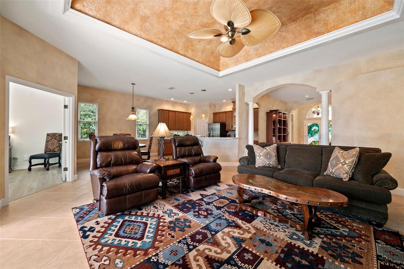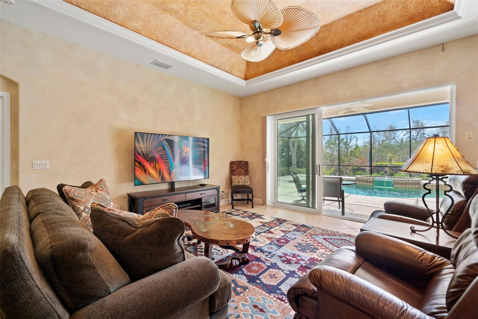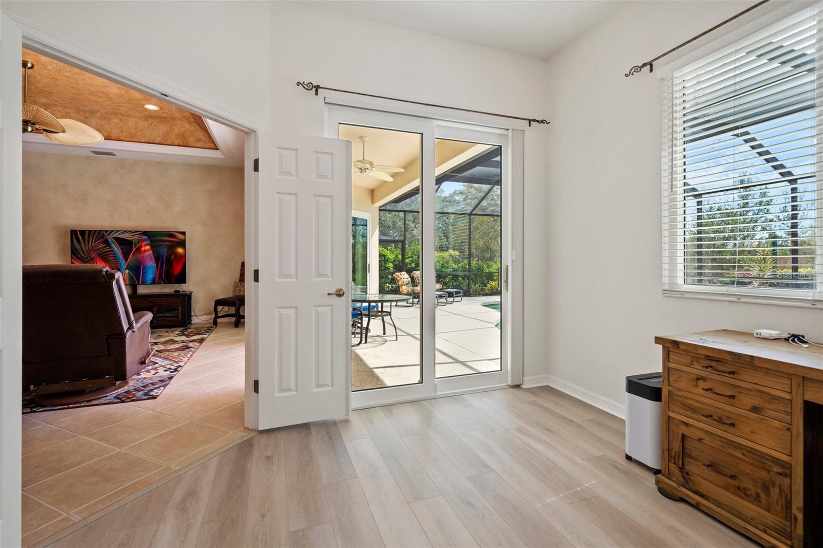 Immerse yourself in the blissful lifestyle located in the Woodlands of Rivendell, where this beautifully appointed home awaits. Situated within a community renowned for its expansive green spaces, parks, 24 shimmering lakes, proximity to Oscar Scherer State Park, heated community pool and nearby Pine View School, this residence offers a truly exceptional living experience. This enchanting residence is poised ideally bordering a sparkling lake to the front and a wetland preserve to the rear of the home. The curb appeal begins with tropical landscaping and paver driveway. Upon arrival, the custom artesian stained-glass double doors invite you into a meticulously crafted interior. The entry hall, with its dual sconce lighting and built-in wall unit, sets the tone for the home’s refined elegance. Tray ceilings, adorned with crown molding and rope lighting, enhance the spaciousness of the great room. From the moment you enter, the wide-open views of a tranquil preserve and sparkling pool capture a relaxed lifestyle. The kitchen, the home’s true heart, boasts stainless steel appliances, abundant counters and cabinetry with a long serving area, and a breakfast bar illuminated by pendant lighting. The split floor plan ensures privacy, with guest bedrooms and bath to the front and a luxurious owner’s suite + den/office overlooking the rear beauty. Owner’s suite featuring a coffered ceiling, sitting area, and dual custom-outfitted closets. Bath with separated dual sinks, Quartz countertops, vanity, walk in shower and jetted tub. Newly installed PGT Impact sliding doors and windows throughout the home (2024). Lanai newly painted and rescreened with 20/20 (2024). Pocket sliders seamlessly connect the interior to an expansive outdoor oasis, showcasing an uncommonly large 14x31 heated saltwater pool and hot tub. Surrounded in pro-tile concrete with a covered lanai overlooking a serene preserve. It’s always about the view and you will enjoy the private preserve featuring Florida-friendly butterfly-pollinator plantings. Nothing captures the mood better than serene living with a menagerie of birds and wildlife. This Osprey location provides convenient access to the Legacy Trail, pristine beaches, and the vibrant cultural scenes of Sarasota and Venice.