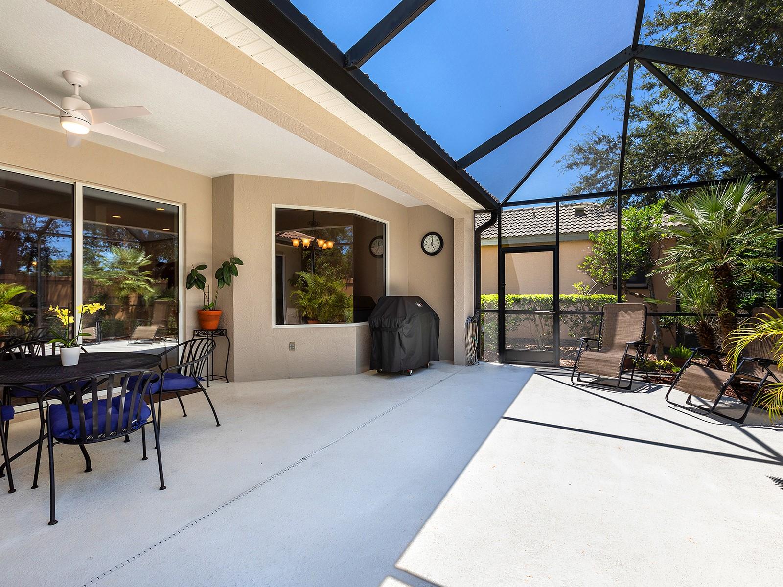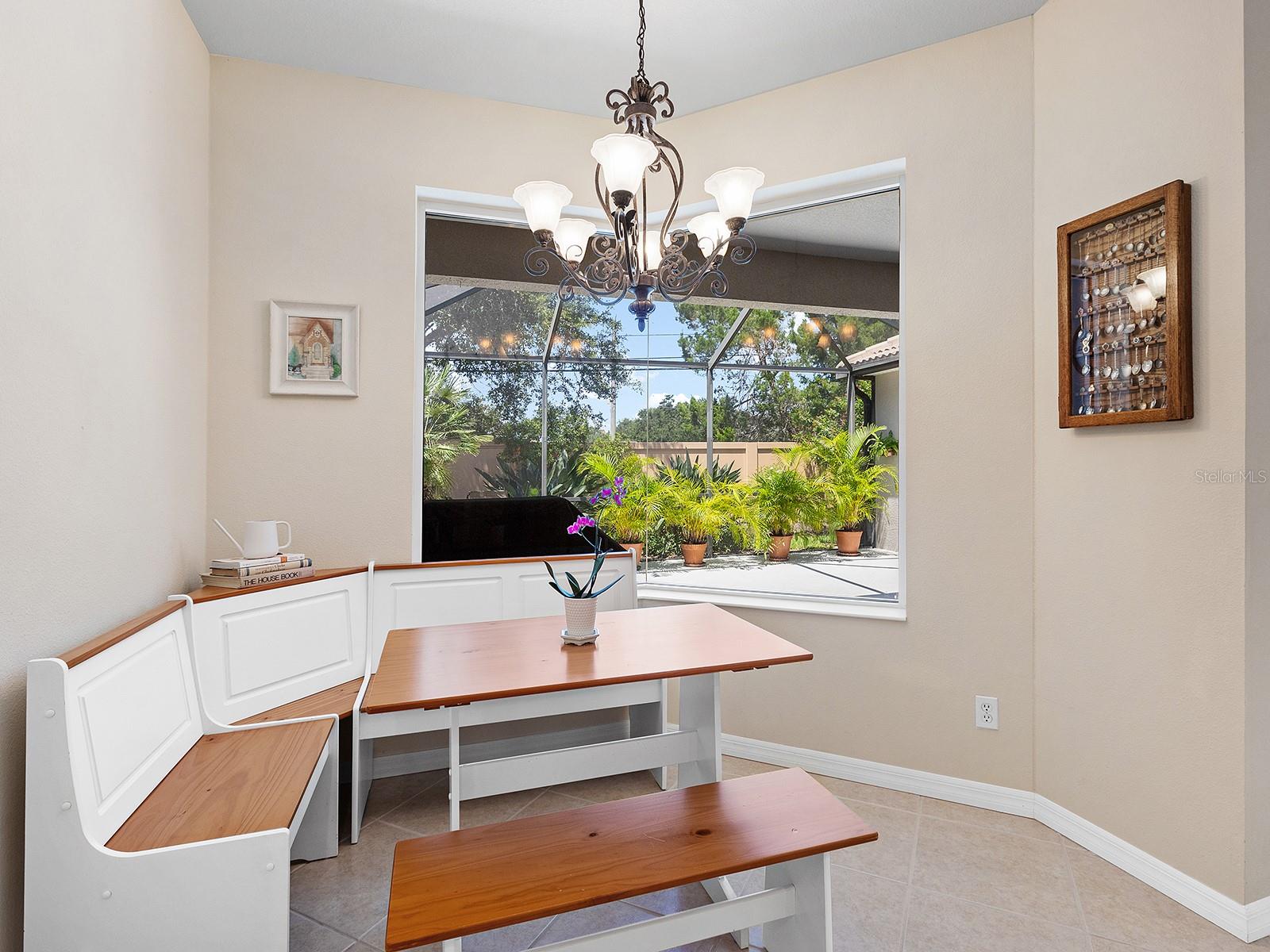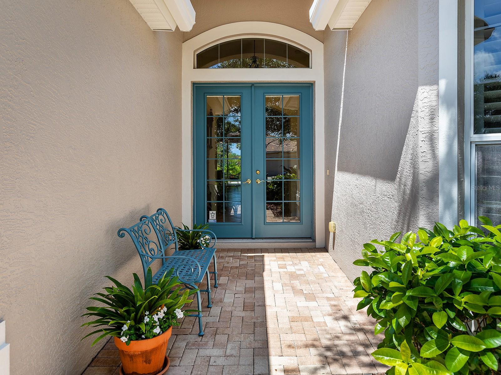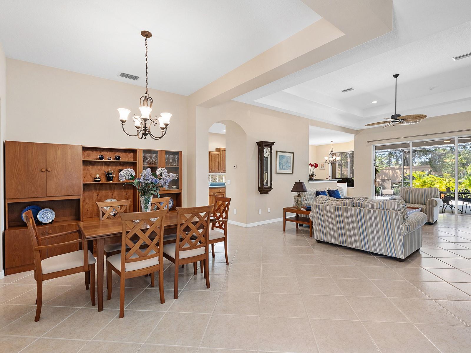 Welcome to a beautiful residence where comfort, privacy, and functionality come together seamlessly. A paver driveway, tile roof, mature landscaping, and a charming paver walkway set the tone as you arrive, leading to an inviting French door entry framed by a transom window. Inside, tile floors stretch through the main living areas, beginning with a light-filled foyer adorned with a chandelier. Flowing effortlessly into the heart of the home, the dining area offers an elegant setting for entertaining, complete with a chandelier and a niche perfectly sized for a buffet or credenza. The adjacent great room impresses with a wall of sliding glass doors, double tray ceilings, recessed lighting, a ceiling fan, and a built-in media niche, creating a bright and open space ideal for everyday living. The kitchen is both stylish and practical, featuring warm wood cabinetry, solid surface countertops, a glass block window in the backsplash for additional natural light, and an eat-in area with a picturesque aquarium window. A breakfast bar provides casual seating, and two closet pantries offer ample storage. The kitchen is outfitted with LG stainless steel appliances, including a range, microwave, dishwasher, and refrigerator. Tucked privately at the back of the home, the spacious primary suite offers a serene retreat with a tray ceiling, multiple windows, and a cozy sitting area with sliders opening to the lanai. Two walk-in closets provide generous storage, while the en-suite bathroom includes a large vanity with two sinks and a makeup area, a soaking tub, walk-in shower with bench seating, a framed mirror, water closet, and a glass block transom window that brightens the space. Just off the foyer, a pocket door leads to a private guest wing that includes a full bathroom with a tub/shower combo, vanity, and tile flooring, as well as a spacious guest bedroom featuring plush carpet, plantation shutters, and a generous closet. The second guest bedroom, located just across the foyer with double doors, is currently set up as a home office but offers flexibility as a guest room, complete with its own closet and a large window. Additional highlights include a well-appointed laundry room with a sink, cabinet workspace, shelving, storage closet, and central vacuum system, plus a tile floor and pocket door for added convenience. Step outside to a covered lanai with sitting and dining areas, ceiling fan, and plenty of room to relax or entertain, all surrounded by lush, mature landscaping for enhanced privacy and tranquility. Willowbend is a maintenance-free neighborhood rich in amenities, including a clubhouse with fitness center, playground, pickleball courts, and a large, heated pool available to all homeowners. All this plus lawn maintenance (including weeding, trimming, sprinklers and irrigation), cable TV, and internet. This fantastic location is ideally near downtown Venice, Sarasota, Siesta Key, Casey Key and Nokomis Beach—offering easy access to beaches, cultural attractions, shopping, and dining. Also nearby is the Legacy Trail, Oscar Scherer State Park, Pine View School, and award-winning Gulf beaches.