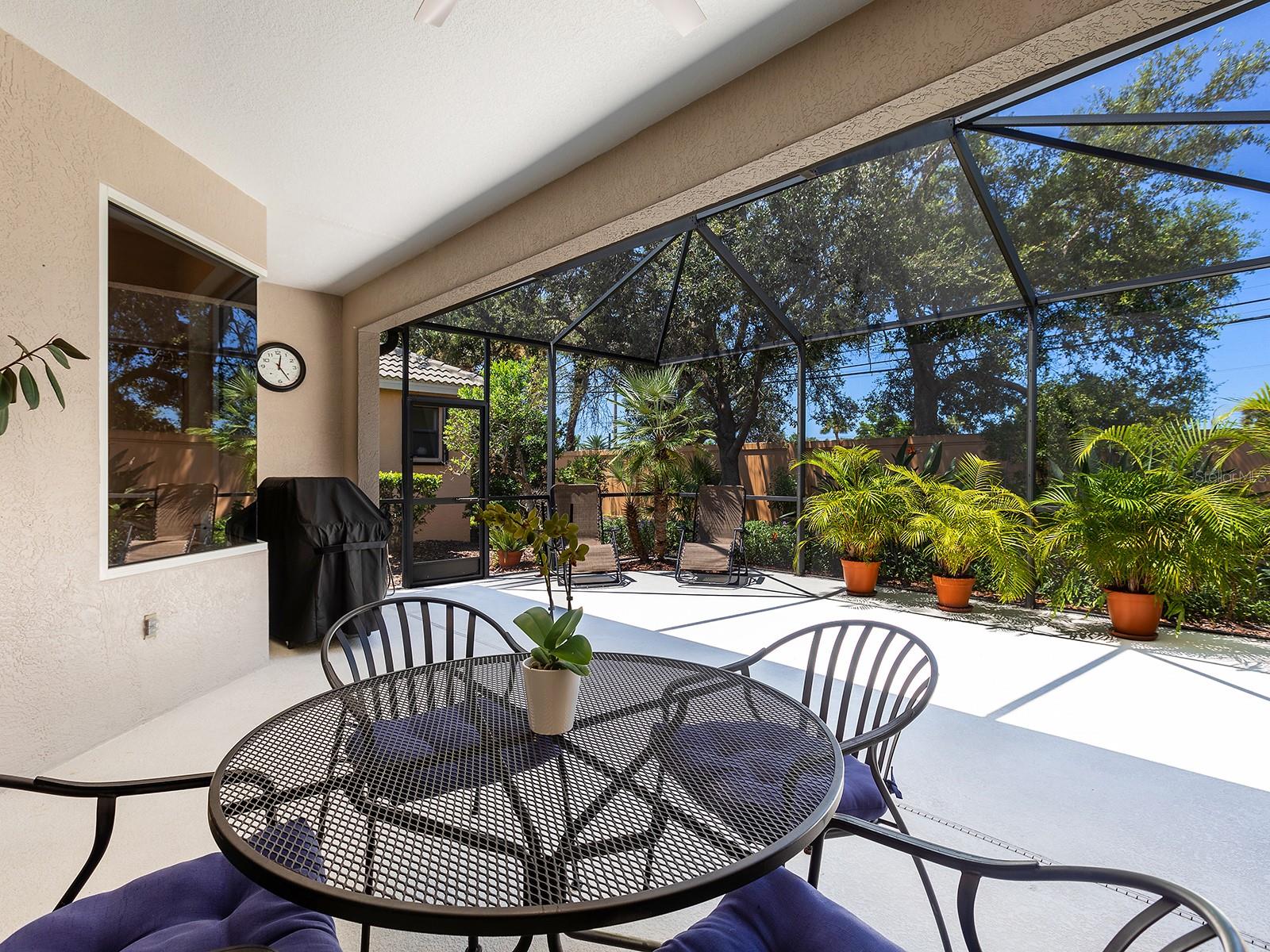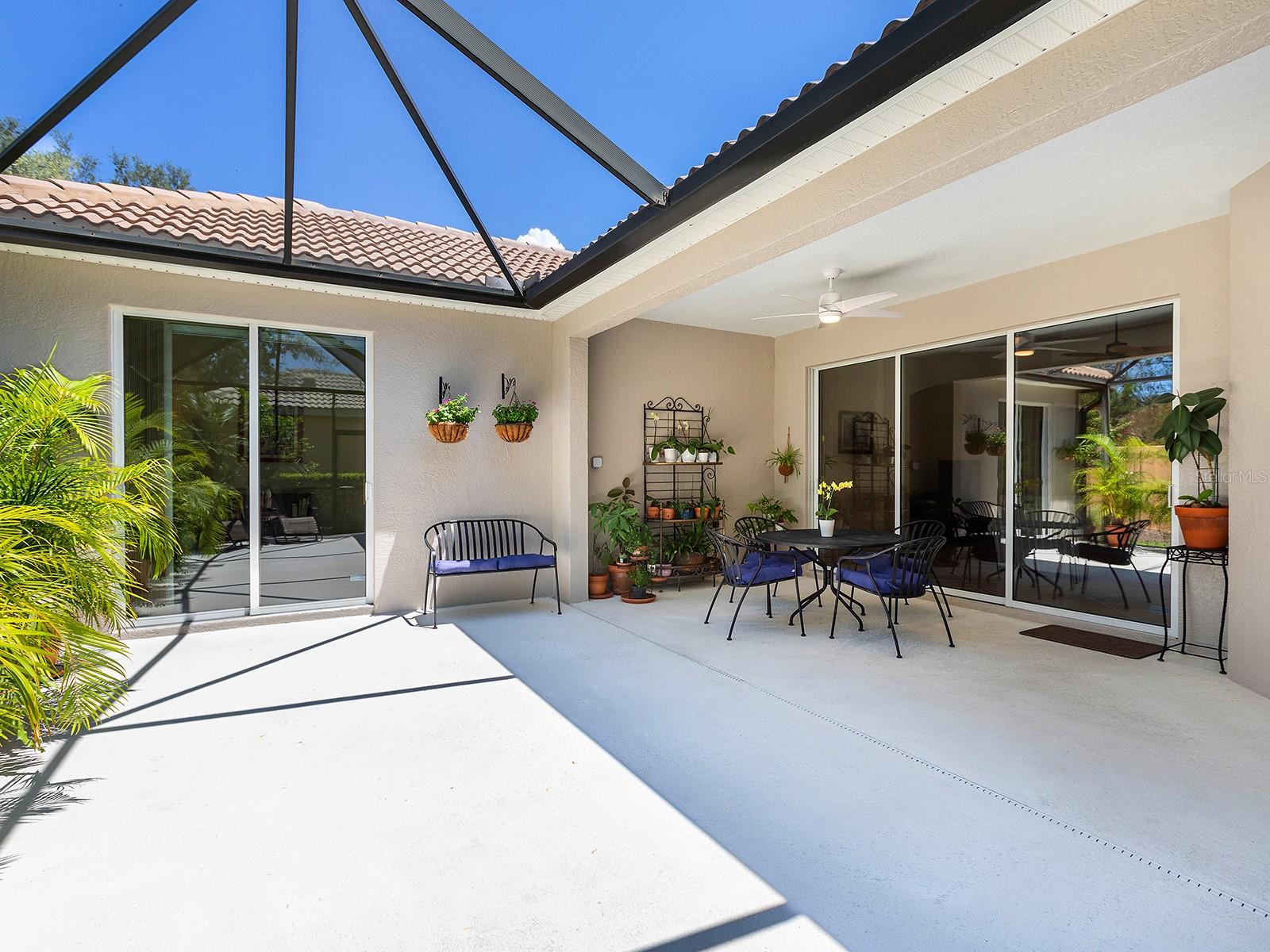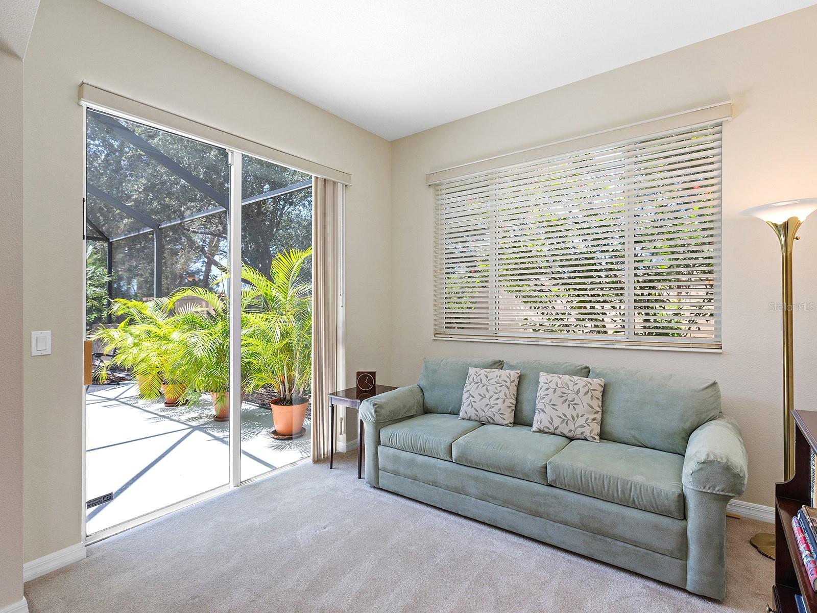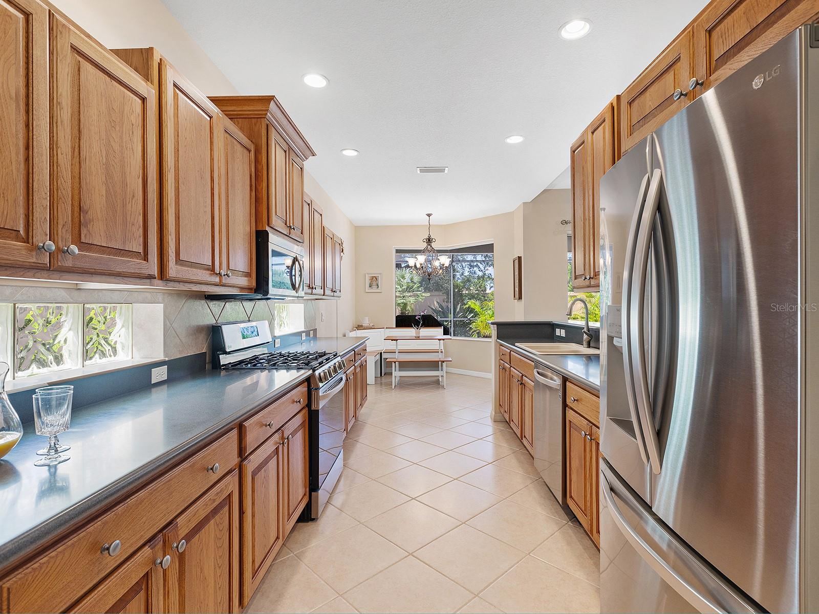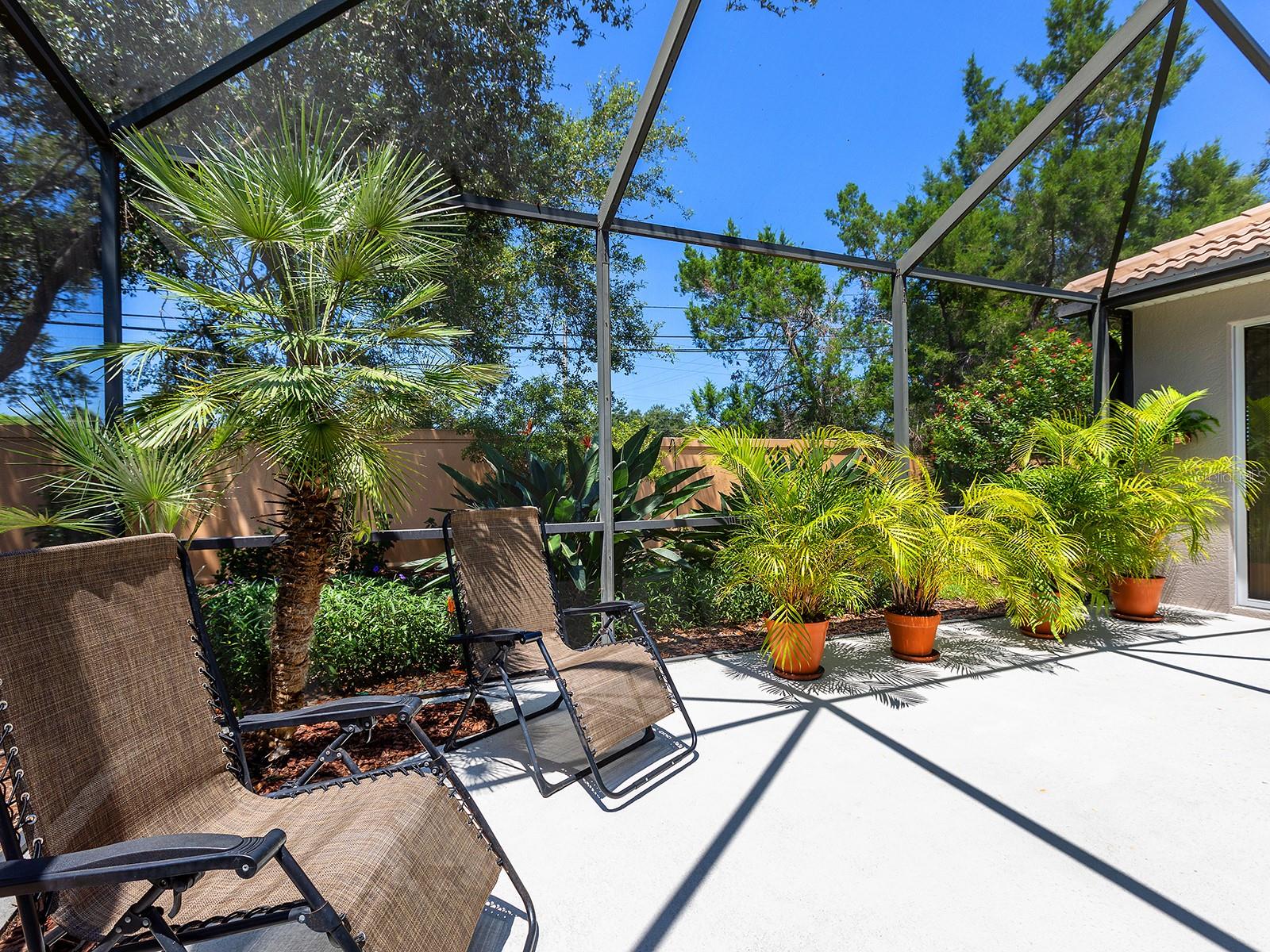 Welcome to a beautiful residence where comfort, privacy, and functionality come together seamlessly. A paver driveway, tile roof, mature landscaping, and a charming paver walkway set the tone as you arrive, leading to an inviting French door entry framed by a transom window. Inside, tile floors stretch through the main living areas, beginning with a light-filled foyer adorned with a chandelier. Flowing effortlessly into the heart of the home, the dining area offers an elegant setting for entertaining, complete with a chandelier and a niche perfectly sized for a buffet or credenza. The adjacent great room impresses with a wall of sliding glass doors, double tray ceilings, recessed lighting, a ceiling fan, and a built-in media niche, creating a bright and open space ideal for everyday living. The kitchen is both stylish and practical, featuring warm wood cabinetry, solid surface countertops, a glass block window in the backsplash for additional natural light, and an eat-in area with a picturesque aquarium window. A breakfast bar provides casual seating, and two closet pantries offer ample storage. The kitchen is outfitted with LG stainless steel appliances, including a range, microwave, dishwasher, and refrigerator. Tucked privately at the back of the home, the spacious primary suite offers a serene retreat with a tray ceiling, multiple windows, and a cozy sitting area with sliders opening to the lanai. Two walk-in closets provide generous storage, while the en-suite bathroom includes a large vanity with two sinks and a makeup area, a soaking tub, walk-in shower with bench seating, a framed mirror, water closet, and a glass block transom window that brightens the space. Just off the foyer, a pocket door leads to a private guest wing that includes a full bathroom with a tub/shower combo, vanity, and tile flooring, as well as a spacious guest bedroom featuring plush carpet, plantation shutters, and a generous closet. The second guest bedroom, located just across the foyer with double doors, is currently set up as a home office but offers flexibility as a guest room, complete with its own closet and a large window. Additional highlights include a well-appointed laundry room with a sink, cabinet workspace, shelving, storage closet, and central vacuum system, plus a tile floor and pocket door for added convenience. Step outside to a covered lanai with sitting and dining areas, ceiling fan, and plenty of room to relax or entertain, all surrounded by lush, mature landscaping for enhanced privacy and tranquility. Willowbend is a maintenance-free neighborhood rich in amenities, including a clubhouse with fitness center, playground, pickleball courts, and a large, heated pool available to all homeowners. All this plus lawn maintenance (including weeding, trimming, sprinklers and irrigation), cable TV, and internet. This fantastic location is ideally near downtown Venice, Sarasota, Siesta Key, Casey Key and Nokomis Beach—offering easy access to beaches, cultural attractions, shopping, and dining. Also nearby is the Legacy Trail, Oscar Scherer State Park, Pine View School, and award-winning Gulf beaches.