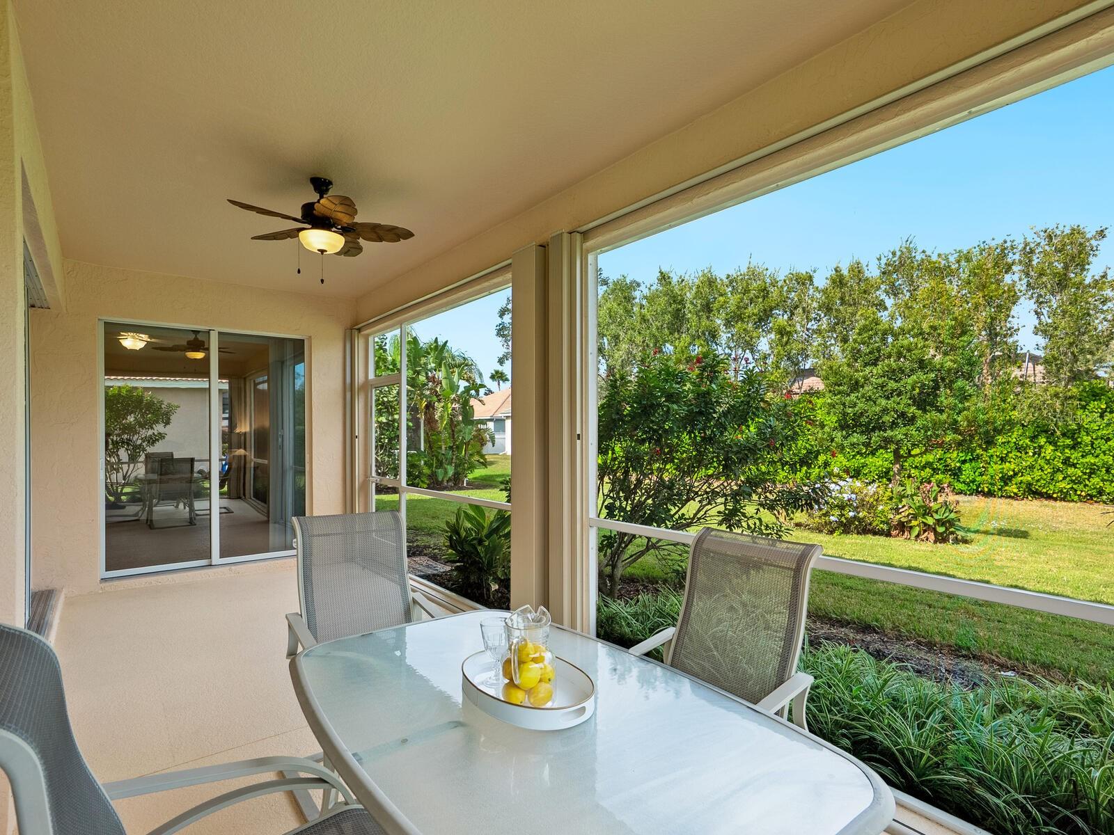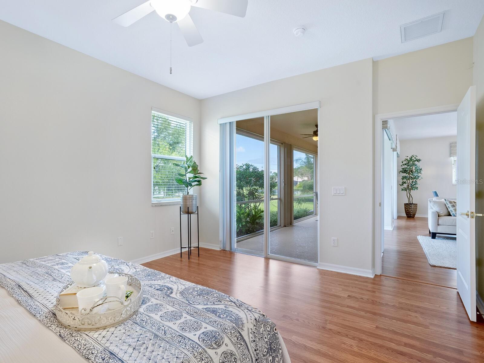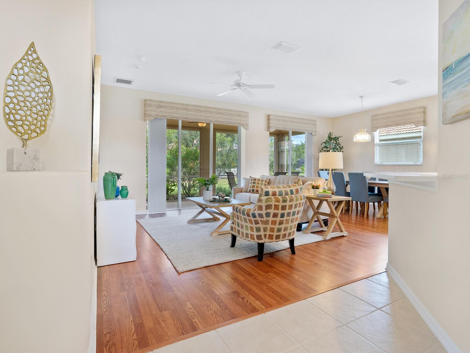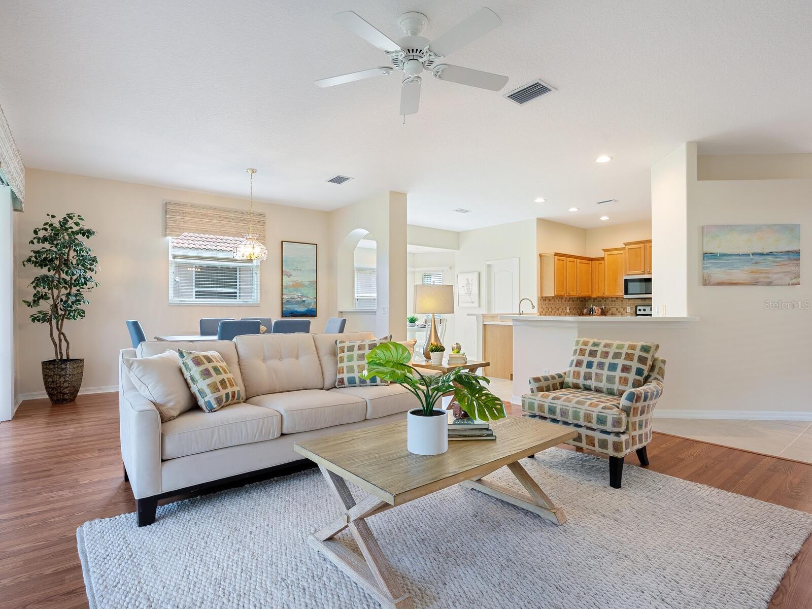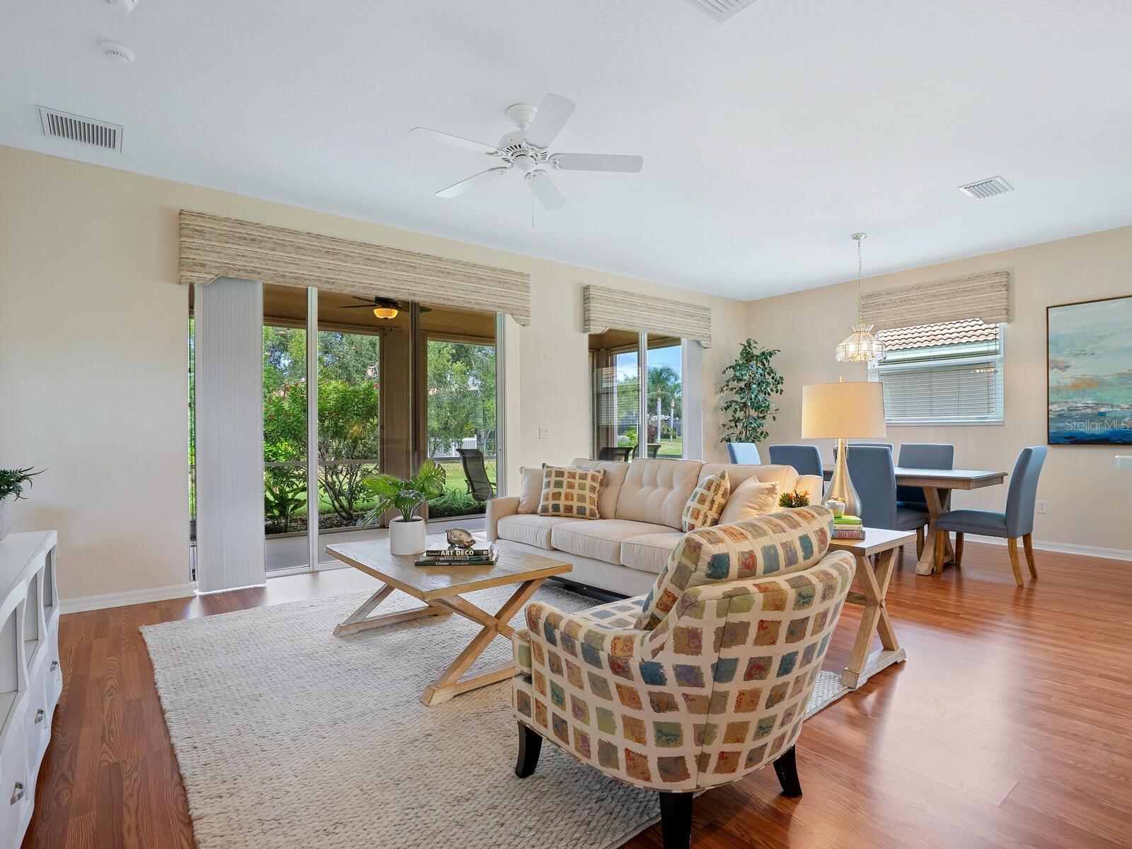 Experience the perfect blend of charm and comfort in this meticulously maintained home located in the highly desirable Rivendell community. Featuring a new tile roof installed in 2024, Weather Tite impact windows, and a Category 5 hurricane-rated garage door, this residence offers peace of mind in addition to its aesthetic appeal. The striking architecture of the US Home-built Inverness floor plan makes it a favorite, set against a backdrop of wide greenbelt views for tranquil patio living. Step inside to discover a serene atmosphere with an open Great Room floor plan that enhances the timelessness of this two-bedroom, two-bath + den home. Spacious kitchen with inviting adjacent breakfast room, and double pantry. The owner's suite serves as a true sanctuary, featuring two walk-in closets and a luxurious bath complete with dual sinks, a walk-in shower, a soaker tub, and convenient slider access to the lanai. The guest suite boasts lovely views of Ibis Lake across the street, providing a picturesque park-like setting. Practical conveniences abound, including a full-size laundry room there is also a laundry tub in the garage. This exceptional residence is a blank canvas for an extraordinary lifestyle, equipped with a Culligan whole-home water filtration system, an Artesian irrigation well, and a home that has been re-piped with a new hot water heater installed in 2025.Conveniently located near downtown Venice and Sarasota, this home is close to beautiful beaches, the top-rated Pine View School, and the Legacy Trail. With no CDD fees and situated in a preferred X flood zone, the low community fees cover ground maintenance, and access to a community pool. Enjoy the benefits of living near Bay Street Dog Park and an array of shopping, dining, and recreational options, including kayaking and boating. With cultural hubs like downtown Sarasota and charming Venice just moments away, along with access to the stunning Gulf beaches, this home truly offers the best of both worlds