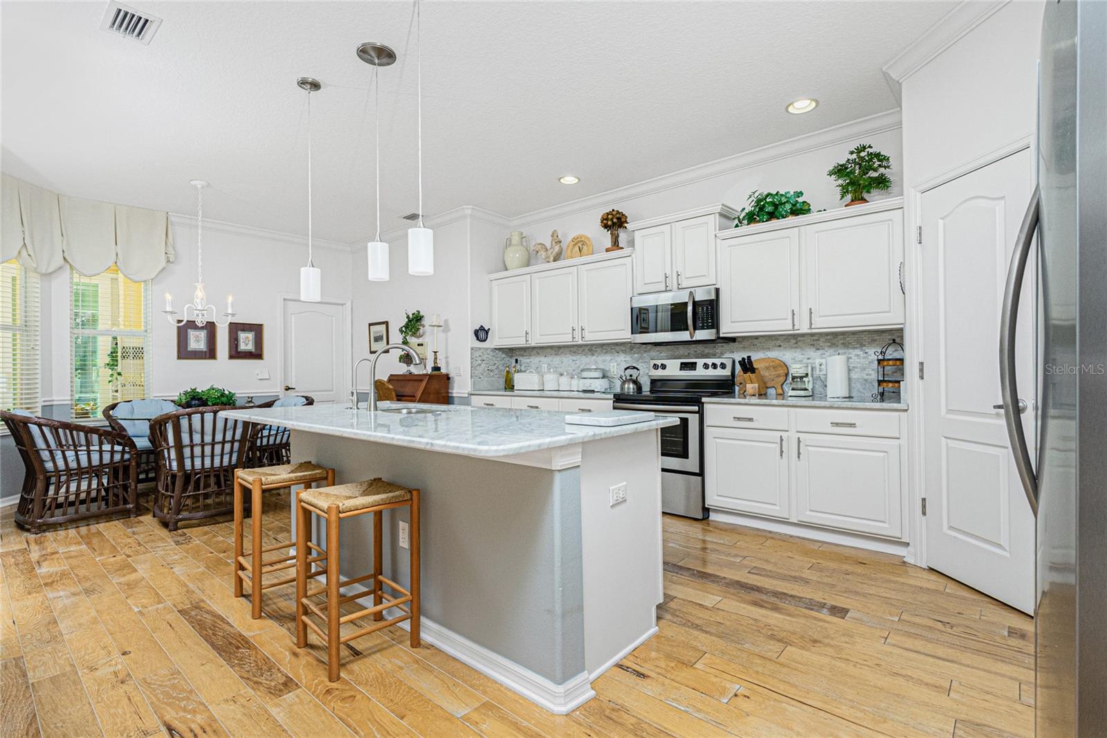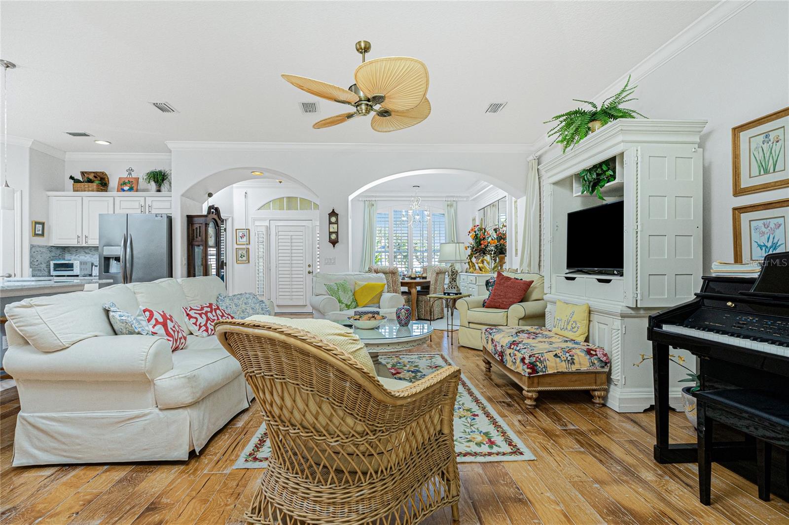 Immaculate and truly move-in ready! This turnkey-furnished, spacious 2-bedroom + den, 2-bath home offers an open floor plan with gorgeous wood flooring throughout the living areas and den. The kitchen features marble countertops, an oversized island, large pantry, and quality finishes, while additional highlights include crown molding, plantation shutters, a private heated pool, and automatic push-button hurricane shutters for added peace of mind. Recent upgrades include a new A/C (2022), roof replaced in 2022, and a brand-new pool cage in 2024, along with a reverse-osmosis water filtration system serving the kitchen sink and refrigerator. Located in Rivendell, one of Sarasota County’s most cherished communities spanning over 400 acres of protected nature preserves, residents enjoy scenic walking and biking trails, a heated community pool, and a peaceful, park-like atmosphere. Ideally situated just 2 miles from Oscar Scherer State Park, 2.5 miles from the Legacy Trail, 5 miles to Nokomis Beach, and under 7 miles to world-famous Siesta Key Beach. The home is approximately 1.4 miles (walkable and bikeable) to Pine View School for the Gifted (grades 2–12), consistently ranked among the top public schools in the nation. With no CDD fees and a low HOA, this home offers an exceptional combination of comfort, location, and long-term value in one of Osprey’s most desirable neighborhoods.