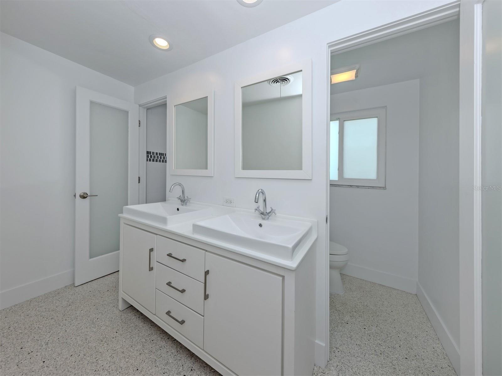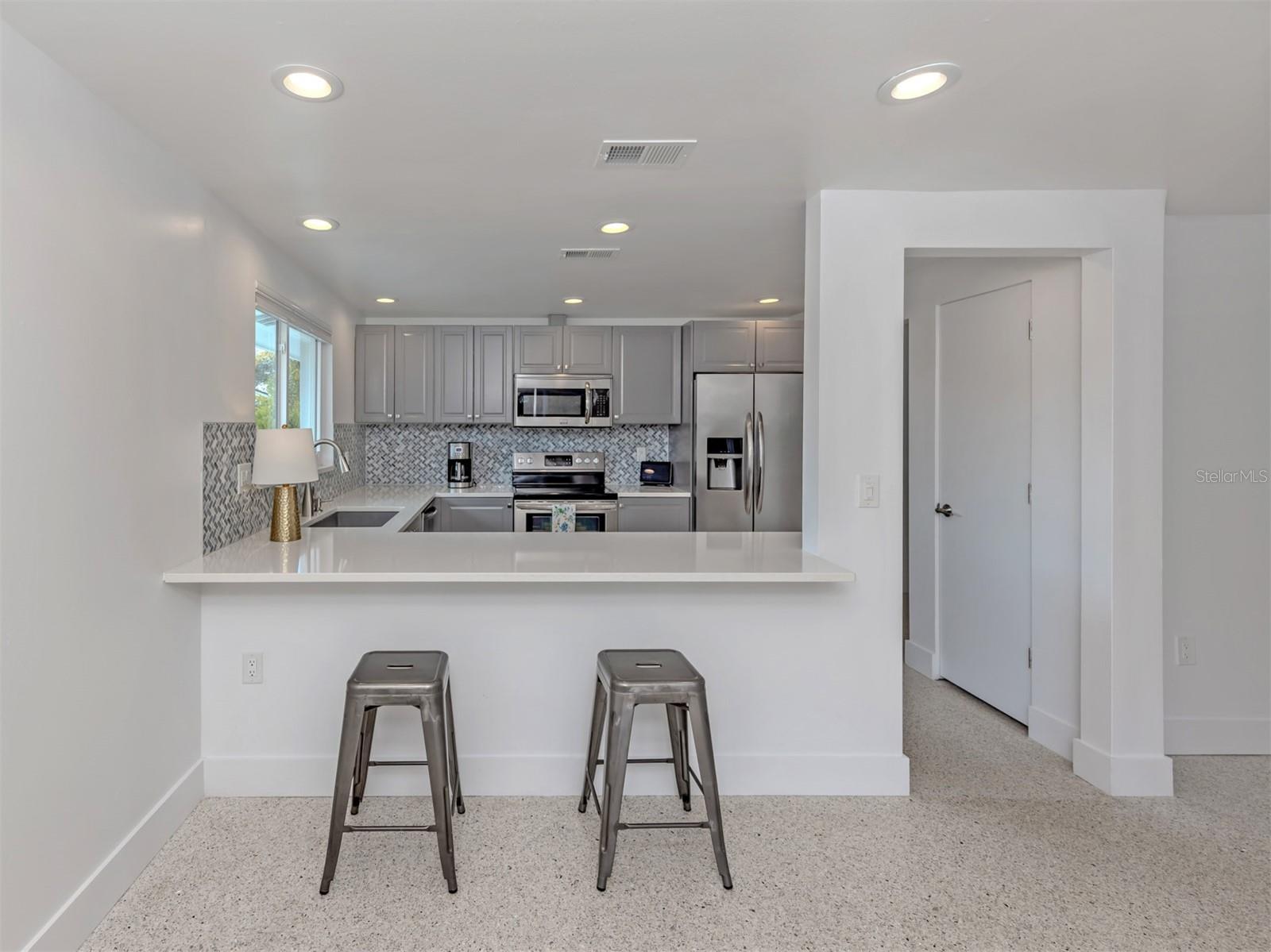 This beautifully updated, 1,284 square foot, mid-century home sits on over one-third of an acre and has been thoughtfully renovated with distinctive Sarasota modern flair by HGTV Design team. Step through the vibrant turquoise door into a light-filled interior featuring gleaming terrazzo floors and clean mid-century lines. Sliding walls of glass create seamless indoor-outdoor living, opening from the living room, dining room, kitchen, and primary bedroom to a spacious screened porch that overlooks a scenic pond and expansive yard. Whether entertaining guests or enjoying a quiet morning coffee, the outdoor living space extends your home beautifully. The kitchen is both stylish and functional, offering gently used stainless KitchenAid Gallery appliances, space-saving self-closing cabinetry, and a generous open breakfast bar perfect for casual dining and gathering. Bathrooms have been tastefully modernized with updated cabinets, countertops, fixtures, and lighting. Major improvements provide peace of mind, including 2025 sewer pipes relined, a 2022 A/C system, 2015 re-roof, 2015 hurricane-impact windows, 2015 gutters, plus interior and exterior paint and refreshed landscaping. Additional highlights include a two-car attached garage, dedicated workshop space, and access to boat docks (first-come, first-served for vessels up to 26 feet). Ideally located west of the Trail between Sarasota and Venice, with convenient access to Highway 681 and Interstate 75, this home places you close to everything. Top-rated schools nearby include Pine View School for gifted and Venice High School, known for strong sports and arts programs. Outdoor enthusiasts will love being just 5 to 10 minutes from Nokomis Beach, Blackburn Point Park kayak and boat launch, Oscar Scherer State Park, offering hiking, camping, cycling, kayaking, boating, and fishing and the Legacy Trail which is perfect for biking with the family or friends. Dining options abound, including waterfront favorites nearby. This is Florida living at its finest modern design, natural beauty, boating access, and an unbeatable location.