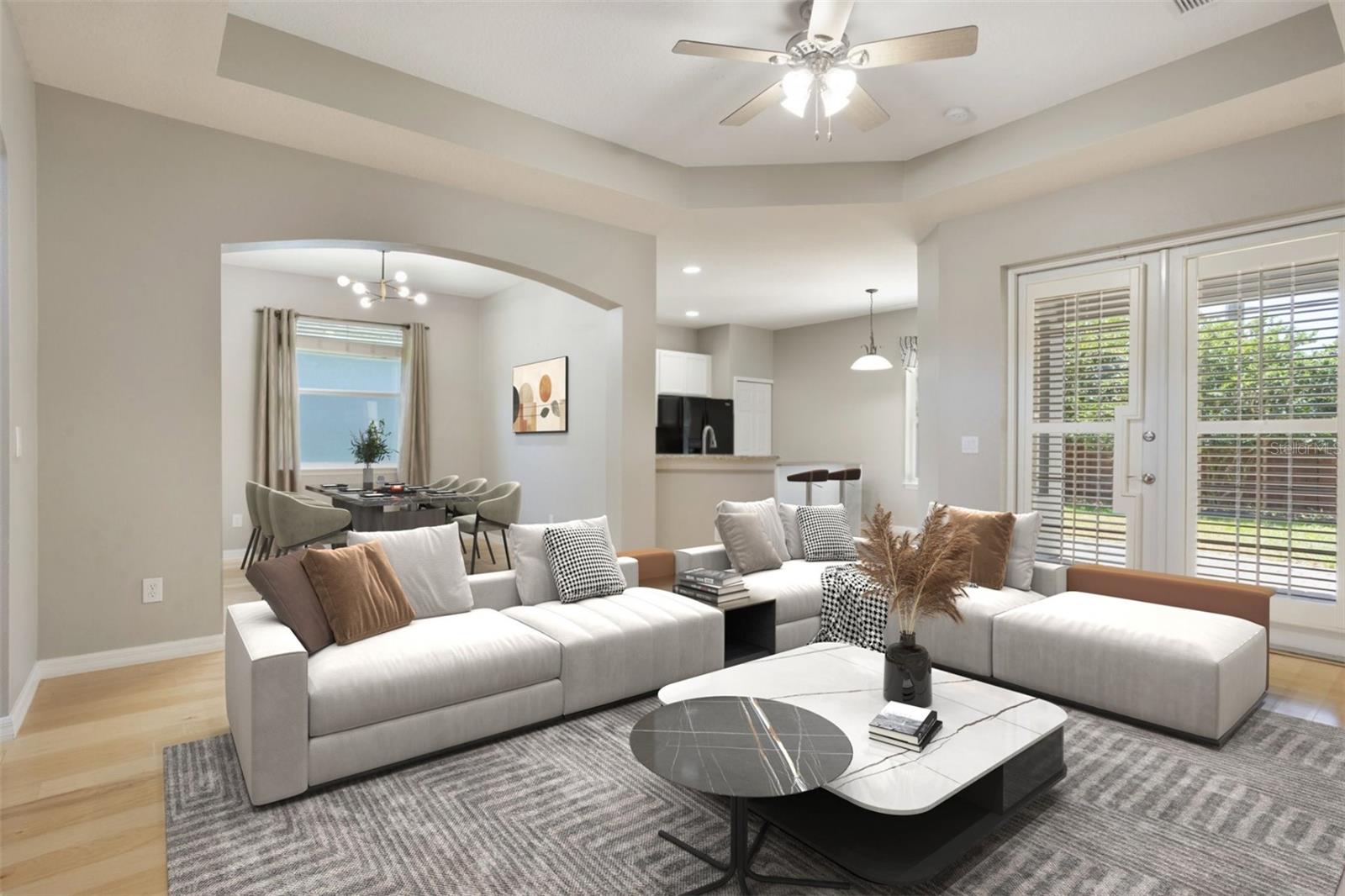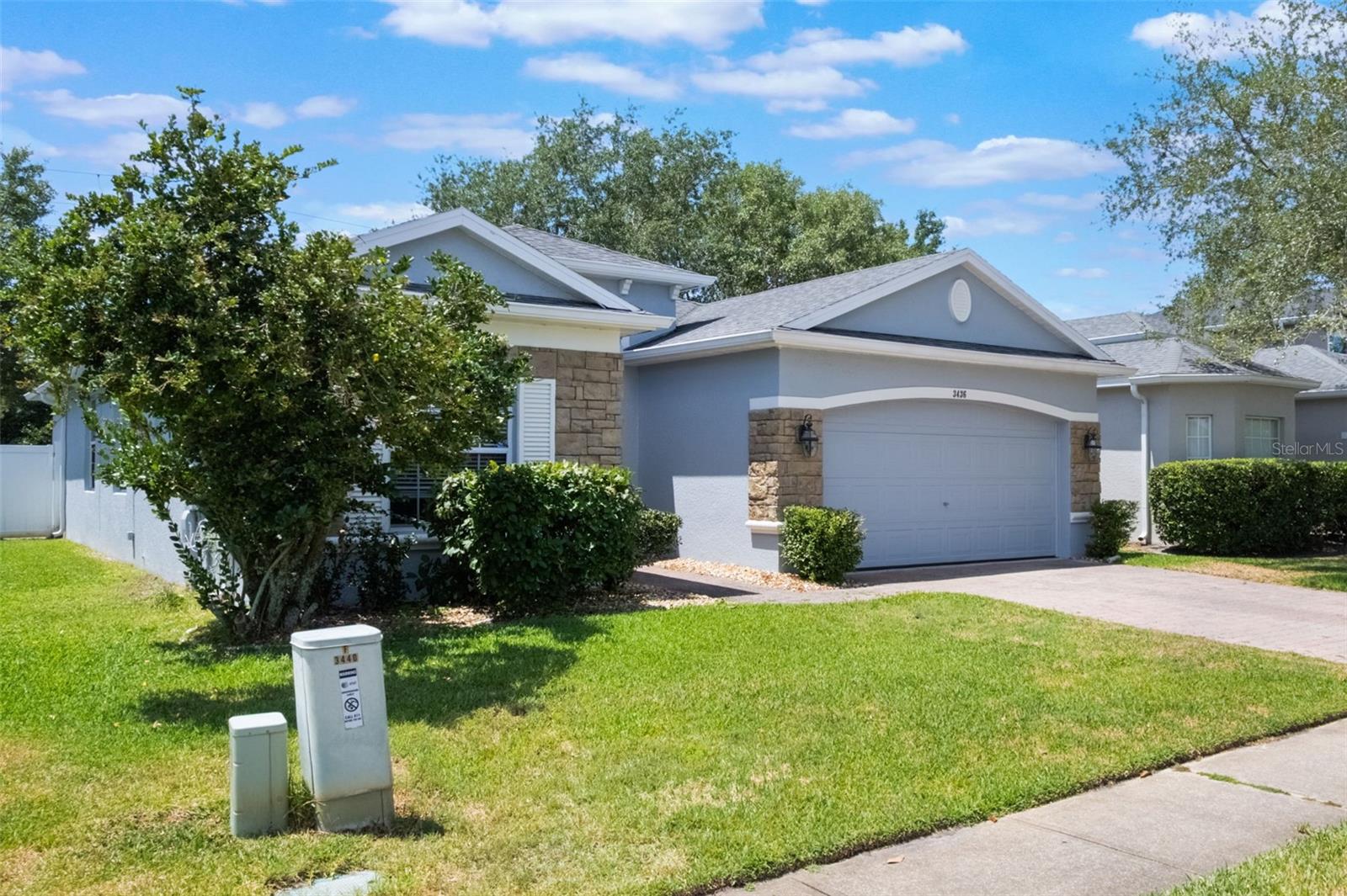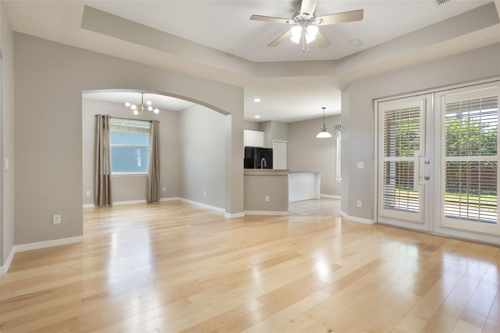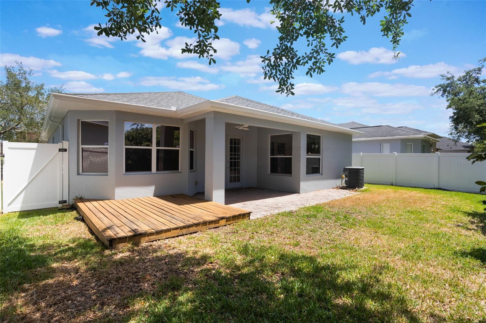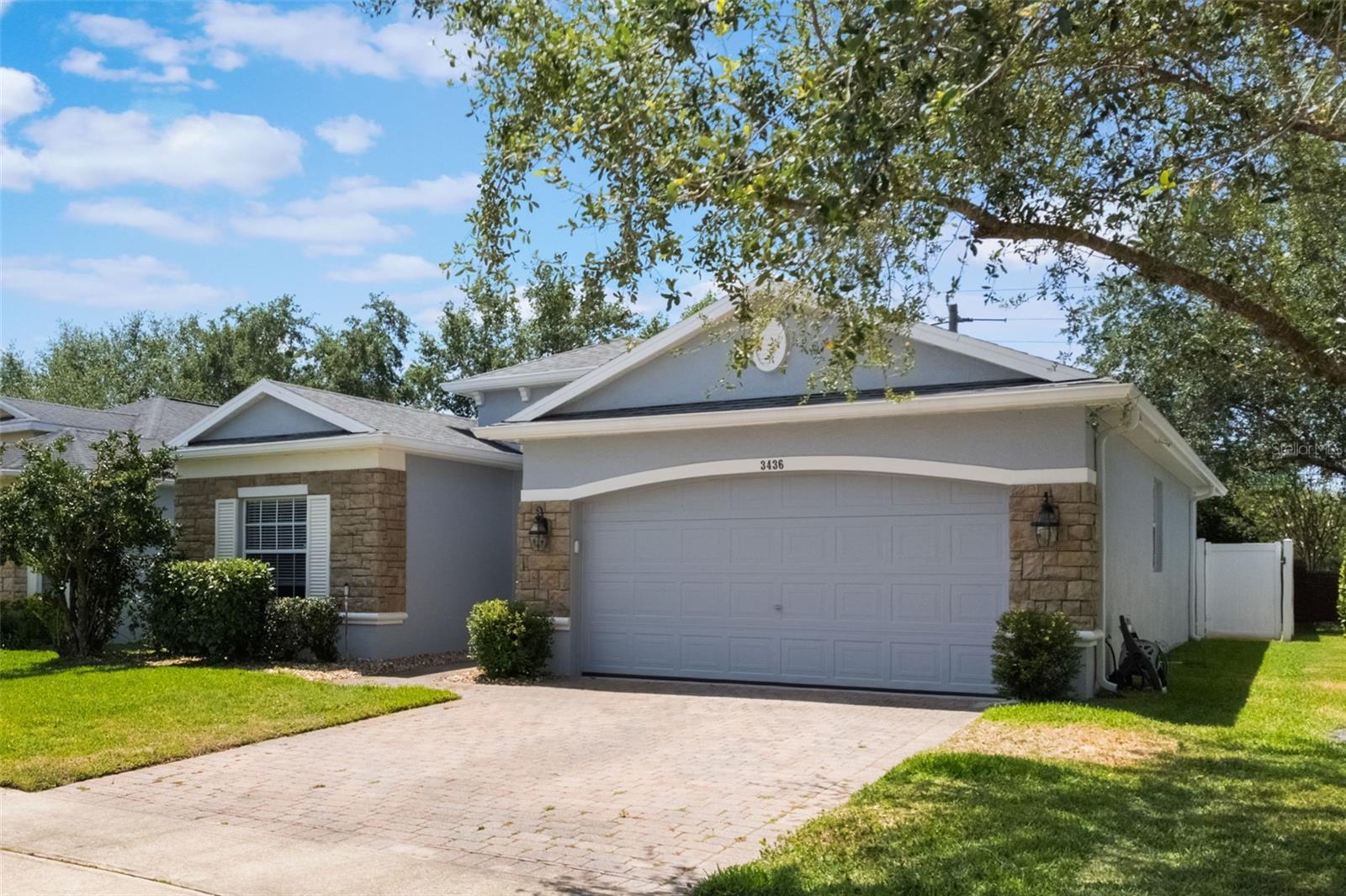 One or more photo(s) has been virtually staged. Welcome home to 3436 Gerber Daisy Lane, a cozy single family residence nestled in the highly sought-after community of The Sanctuary in the heart of Oviedo, FL. This charming home offers 1,549 square feet of thoughtfully designed living space, is a perfect blend of style and functionality. Walking up, you’ll notice a paver brick driveway and homey covered porch. Inside, you'll be greeted by a warm and welcoming foyer with 12 foot ceilings leading to an open living area and separate formal dining room with hardwood maple flooring throughout. The spacious eat-in kitchen, perfect for cooking and hosting, is complete with a pantry, breakfast bar and optional kitchen island. Large picture windows overlook the pretty brick fence and garden greenery of the backyard. The home boasts two ancillary bedrooms outfitted with new luxury vinyl plank flooring along with a full bathroom with bathtub for little ones. The primary suite offers a spacious retreat featuring tray ceilings and maple hardwood flooring. Picture windows to the backyard allow golden afternoon light while dual closets leave ample room for clothing and storage. The primary suite also features dual vanities, a garden tub and separate shower stall. The allure of this home extends beyond its interiors. Step outside to enjoy your private outdoor space on the covered patio with new ceiling fan to stay cool during hot Florida summers. Unwind and enjoy some al fresco dining on the wooden deck ideal for entertaining. This property features a fully fenced in back yard with picturesque brick wall along the back of the property. Residents also have access to a range of community amenities, including a pool, clubhouse with meeting rooms, tennis court, basketball court, volleyball court, fitness center, and playground, ensuring activities for everyone. Additional features include new exterior paint (2024) and new gutters (2024.) AC recently serviced with dehumidifier added (2025.) Roof 2016. Washer & Dryer, window treatments and kitchen island convey with the property.