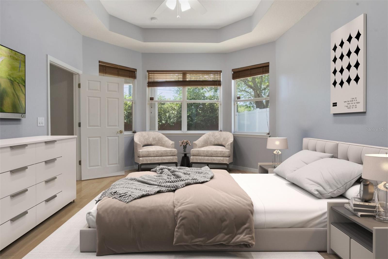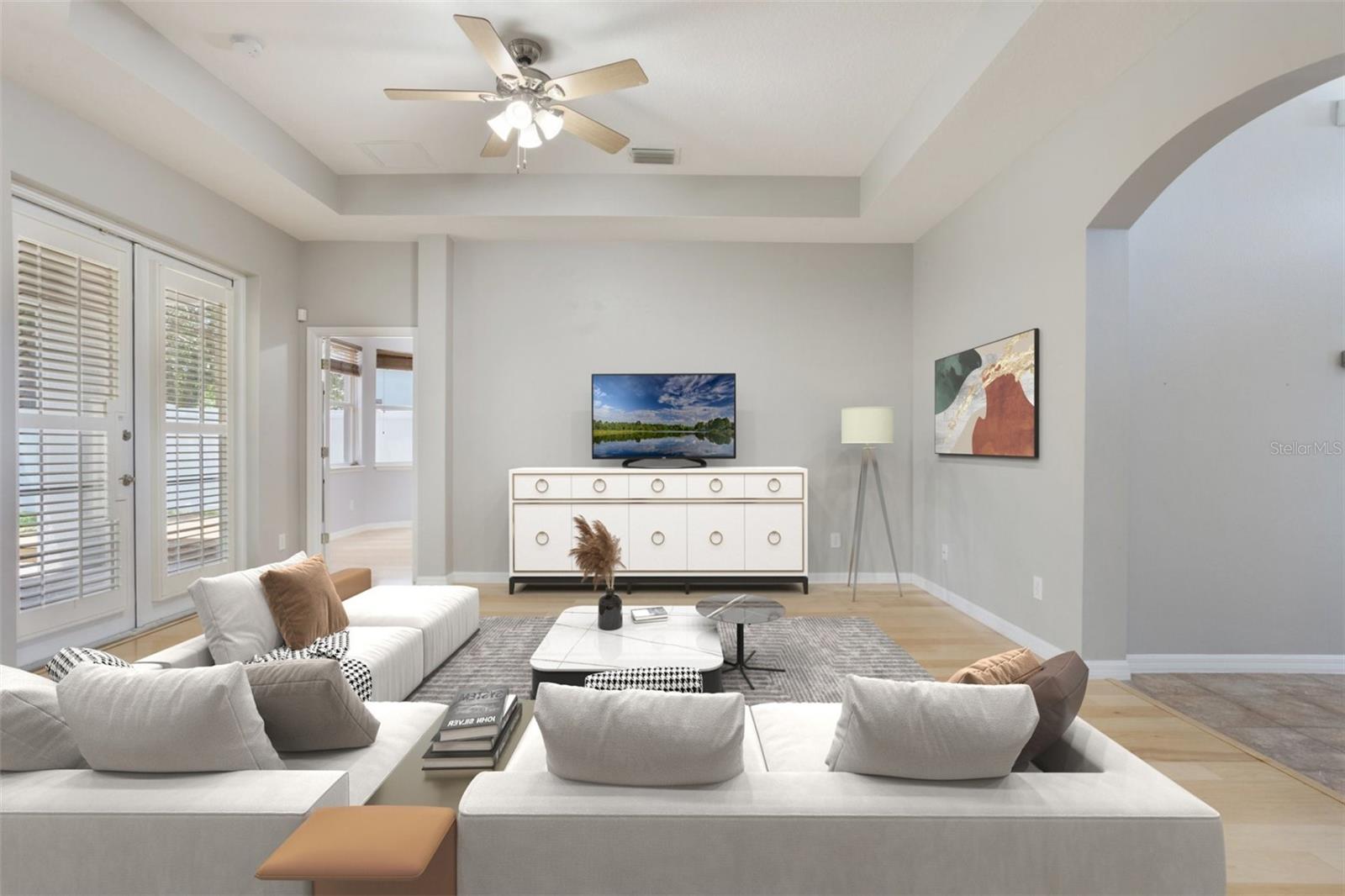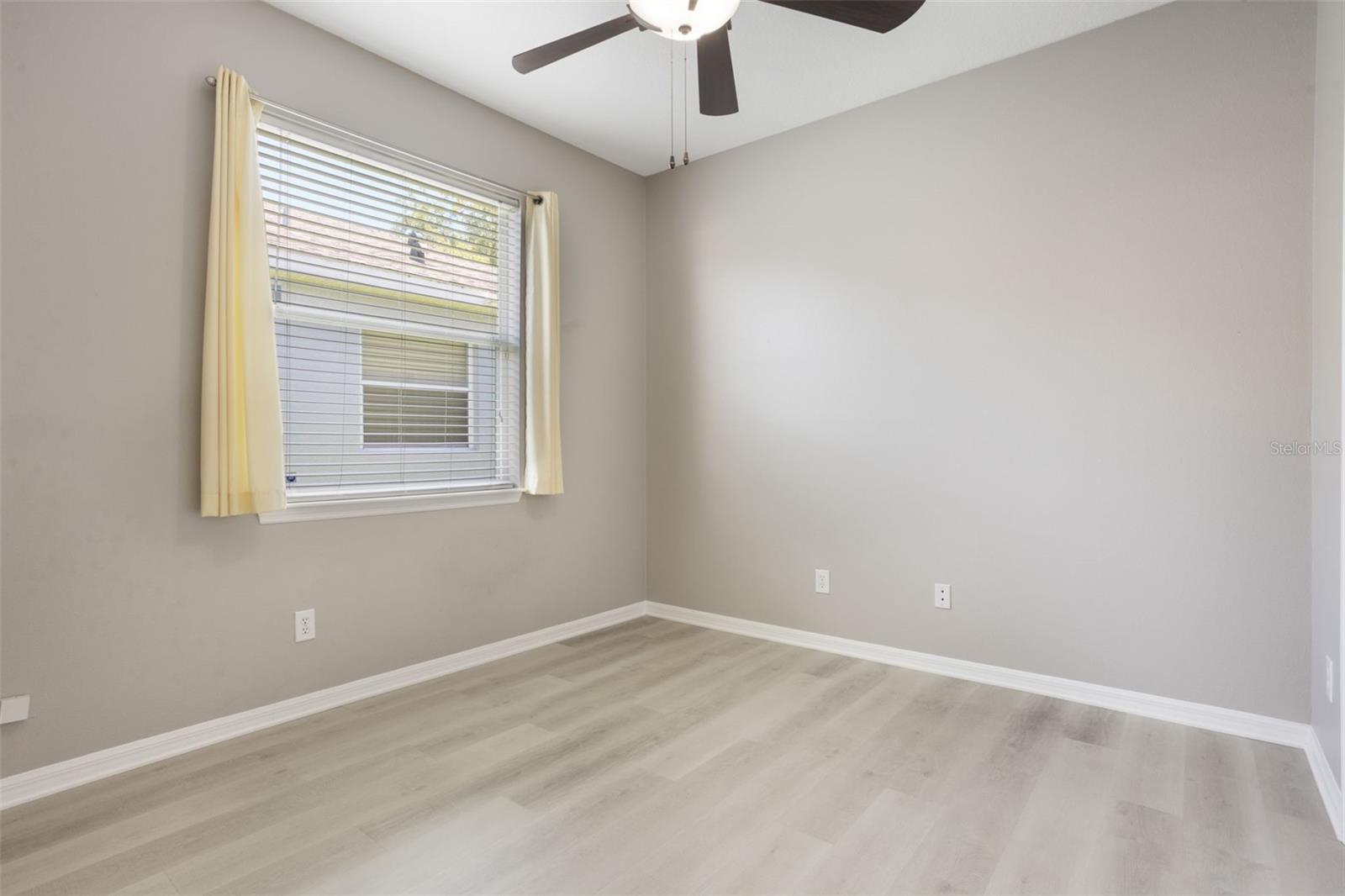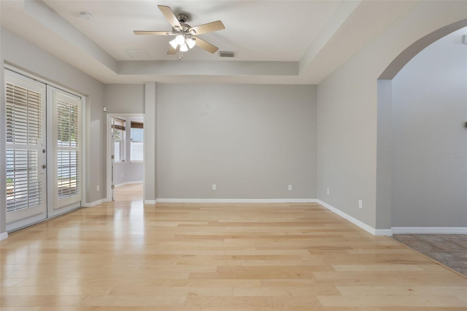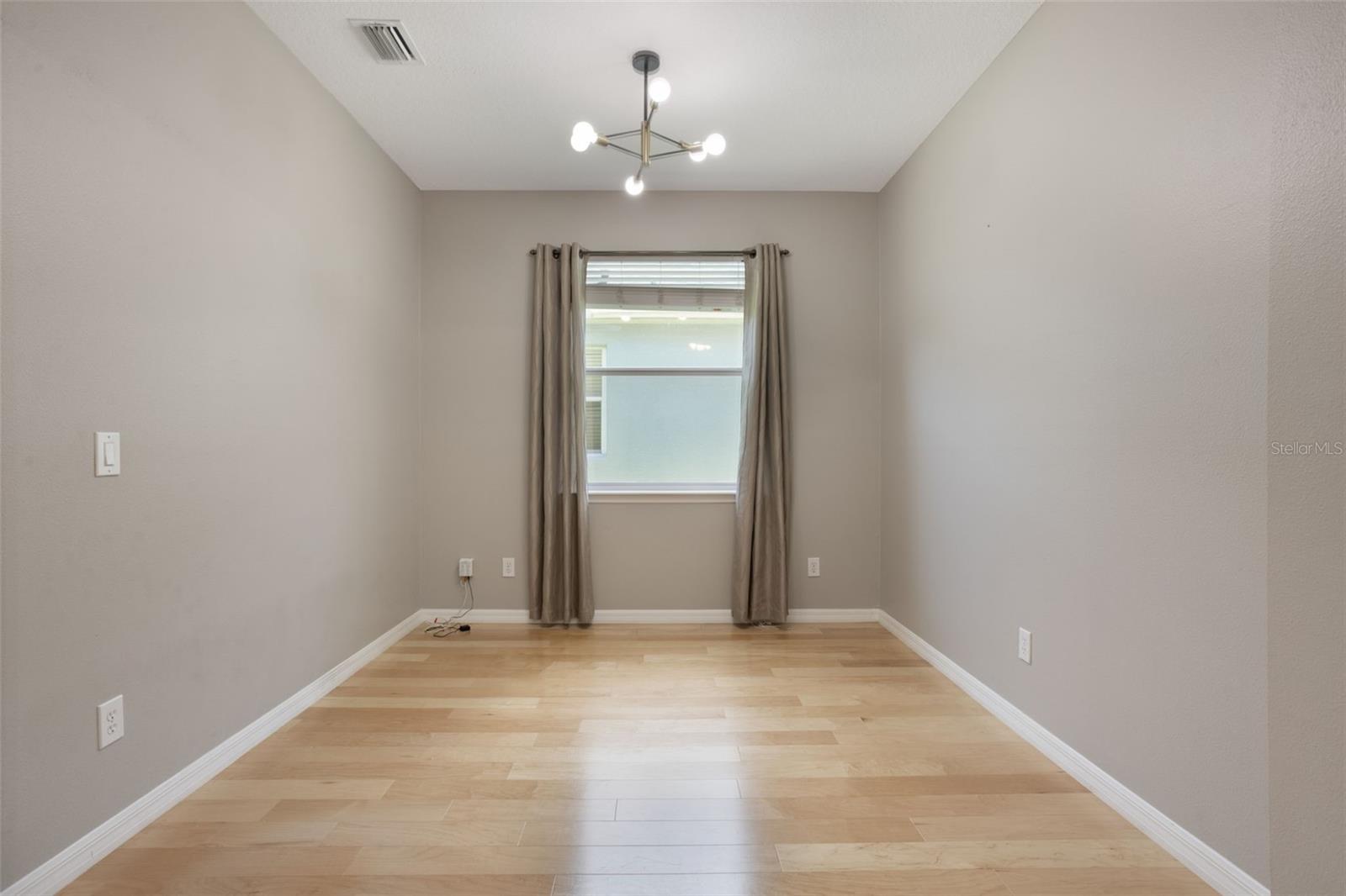 One or more photo(s) has been virtually staged. Welcome home to 3436 Gerber Daisy Lane, a cozy single family residence nestled in the highly sought-after community of The Sanctuary in the heart of Oviedo, FL. This charming home offers 1,549 square feet of thoughtfully designed living space, is a perfect blend of style and functionality. Walking up, you’ll notice a paver brick driveway and homey covered porch. Inside, you'll be greeted by a warm and welcoming foyer with 12 foot ceilings leading to an open living area and separate formal dining room with hardwood maple flooring throughout. The spacious eat-in kitchen, perfect for cooking and hosting, is complete with a pantry, breakfast bar and optional kitchen island. Large picture windows overlook the pretty brick fence and garden greenery of the backyard. The home boasts two ancillary bedrooms outfitted with new luxury vinyl plank flooring along with a full bathroom with bathtub for little ones. The primary suite offers a spacious retreat featuring tray ceilings and maple hardwood flooring. Picture windows to the backyard allow golden afternoon light while dual closets leave ample room for clothing and storage. The primary suite also features dual vanities, a garden tub and separate shower stall. The allure of this home extends beyond its interiors. Step outside to enjoy your private outdoor space on the covered patio with new ceiling fan to stay cool during hot Florida summers. Unwind and enjoy some al fresco dining on the wooden deck ideal for entertaining. This property features a fully fenced in back yard with picturesque brick wall along the back of the property. Residents also have access to a range of community amenities, including a pool, clubhouse with meeting rooms, tennis court, basketball court, volleyball court, fitness center, and playground, ensuring activities for everyone. Additional features include new exterior paint (2024) and new gutters (2024.) AC recently serviced with dehumidifier added (2025.) Roof 2016. Washer & Dryer, window treatments and kitchen island convey with the property.