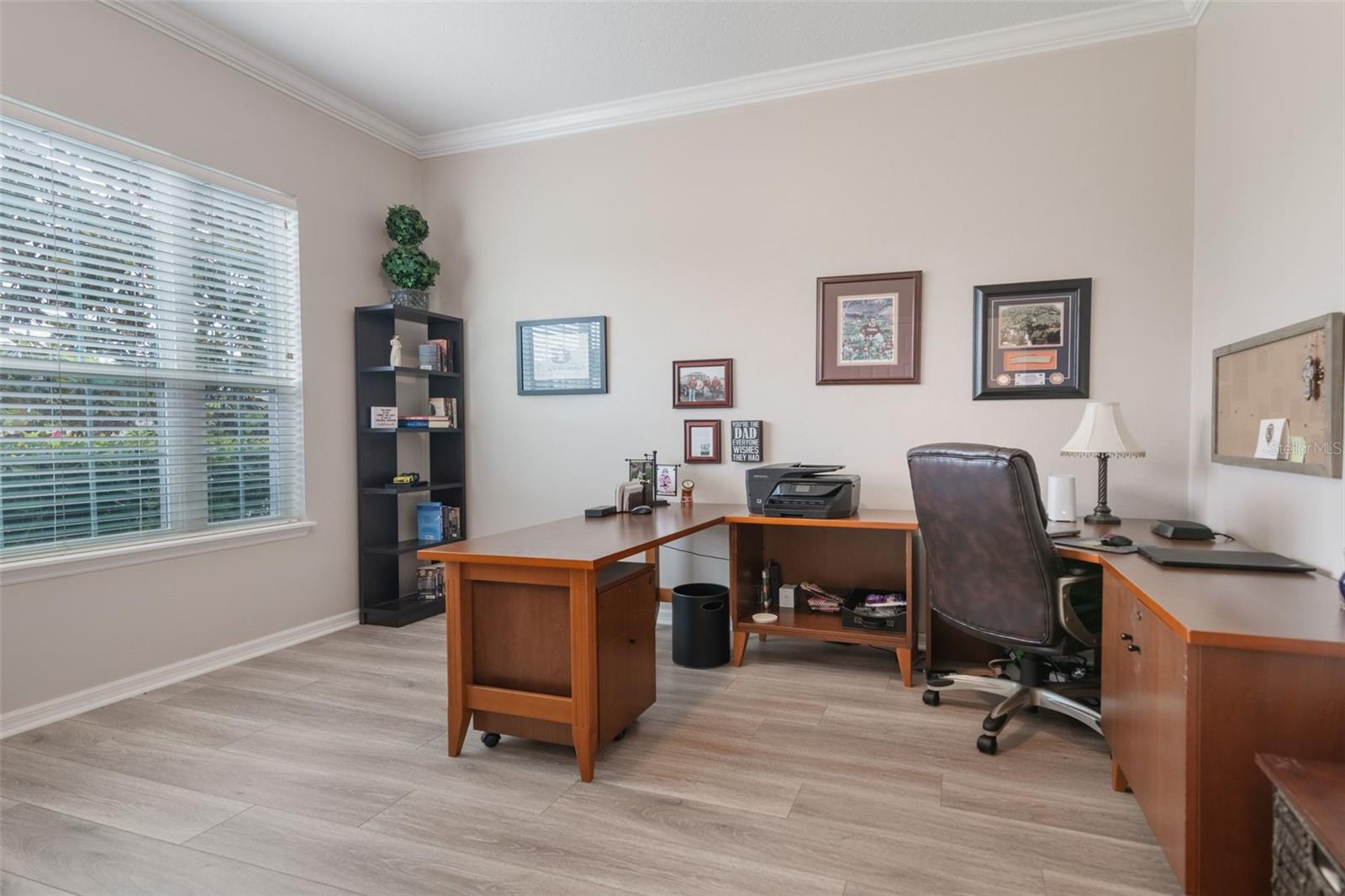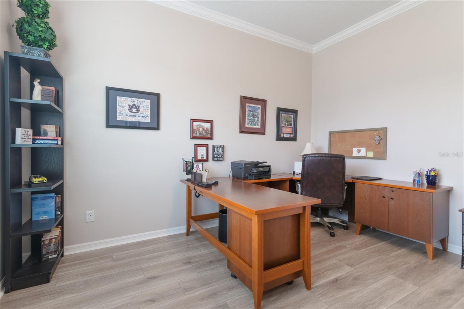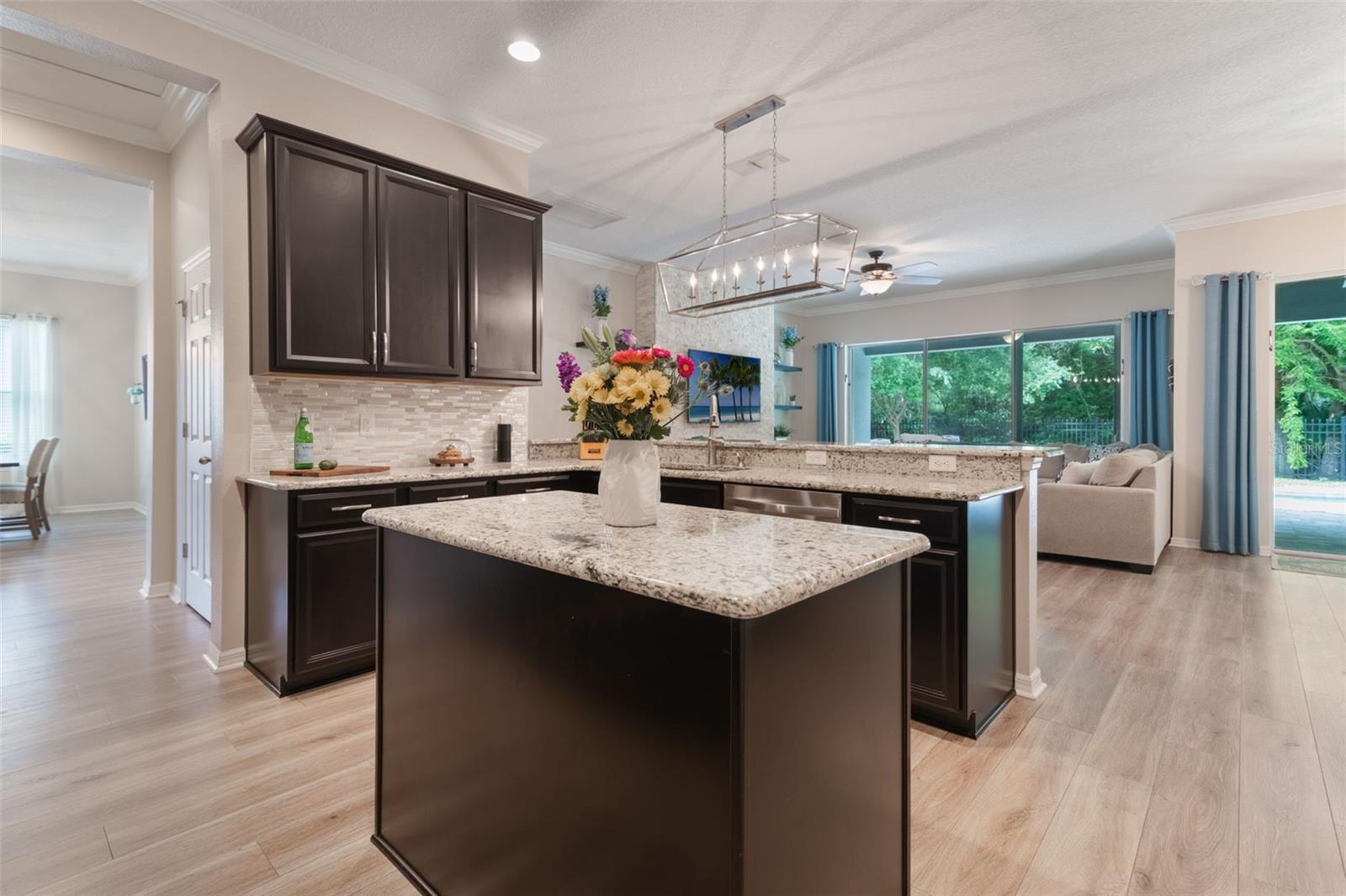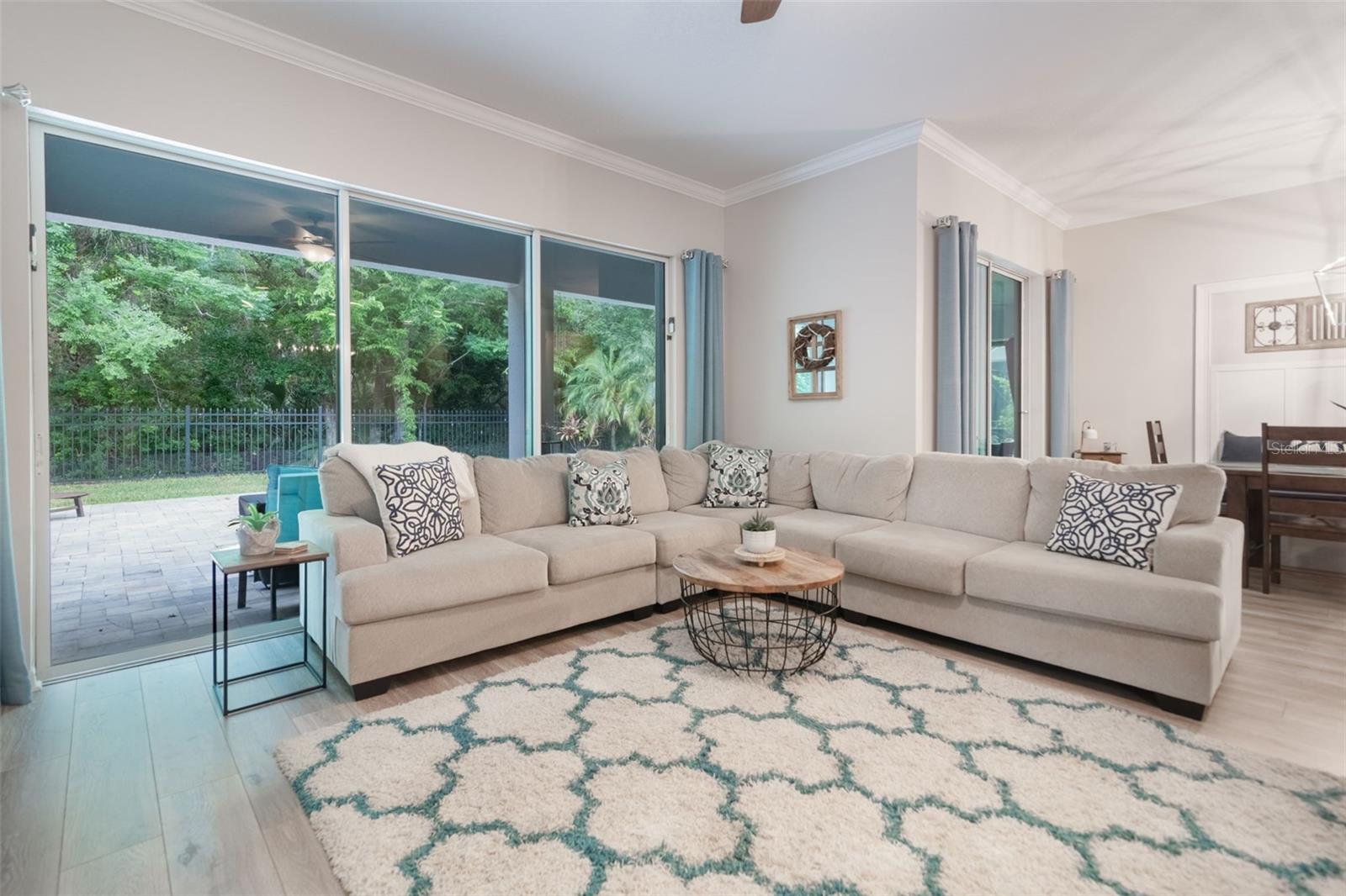 Under contract-accepting backup offers. Welcome to the Florida lifestyle you’ve been waiting for—this impeccably maintained, single-story pool home in the gated community of Oviedo Garden offers the perfect blend of comfort, sophistication, and functionality. Privately positioned at the end of a quiet cul-de-sac with serene conservation views, this 4-bedroom, 3-bath home with a dedicated office and over 3,000 square feet exudes model-home quality from the moment you arrive. High ceilings, crown molding, and luxury vinyl plank flooring throughout set a refined tone, while the open-concept layout provides seamless flow for everyday living and entertaining. The gourmet kitchen features stainless steel appliances, double ovens, an oversized center island, and a built-in breakfast nook—all connected to the formal dining and living areas by a convenient butler’s pantry. The family room is anchored by custom built-ins and a sleek electric fireplace, with two sets of doors leading to the extended lanai and private pool featuring a tranquil waterfall and optional saltwater system. A thoughtful split-bedroom layout ensures privacy for guests and family alike, while the serene primary suite opens directly to the lanai and offers a spa-inspired bath with soaking tub, dual vanities, a large walk-in shower, and an expansive walk-in closet. Additional highlights include a 3-car garage, full security system with Ring cameras, mature landscaping, and a fully fenced backyard. For peace of mind during storm season, the home is equipped with a built-in partial-home generator, ensuring the basic necessities are handled when power outages occur. Zoned for top-rated Seminole County schools and just minutes from parks, shopping, dining, and UCF, this move-in-ready gem captures the essence of upscale Florida living.