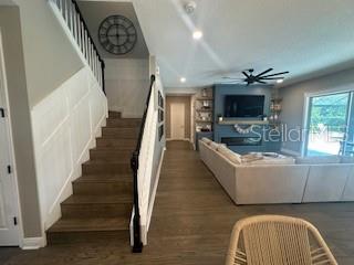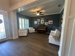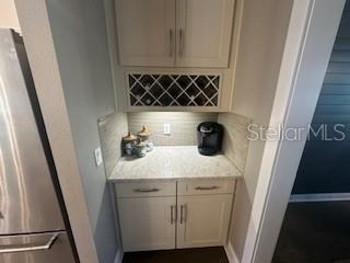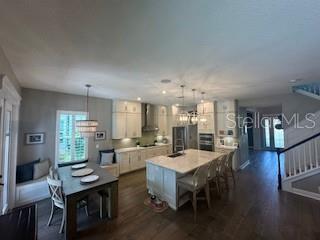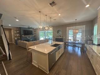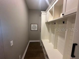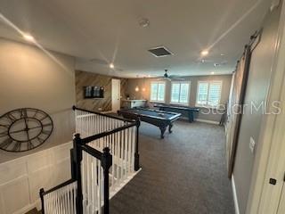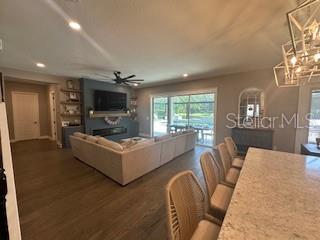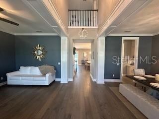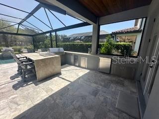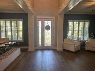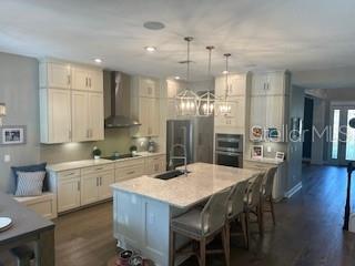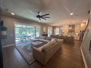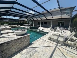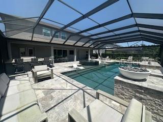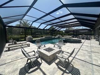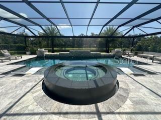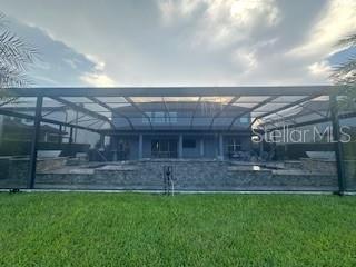 Welcome to a luxurious haven where elegance meets comfort and every detail has been meticulously curated to inspire awe. Nestled within an exclusive gated community, this stunning two-story home, built in 2017, spans an impressive 4,246 square feet, boasting 5 spacious bedrooms, 4 full bathrooms, and a host of upgraded features designed for unparalleled living. From the moment you step through the grand 8-foot doors, the impeccable craftsmanship and luxurious finishes catch your eye. The first floor, adorned with rich hardwood flooring and distinguished by 6-inch baseboards, seamlessly flows from the formal sitting room into an inviting family room, providing ample space for both grand entertaining and intimate gatherings. Nearby, a dedicated formal dining room sets the stage for elegant dinners and memorable celebrations. The heart of this home is undoubtedly its magnificent oversized kitchen, a culinary dream appointed with premium stainless steel appliances, pristine quartz countertops, and custom cabinetry stretching elegantly to the ceiling. Adjacent, a wet bar area makes hosting effortless, ensuring every gathering is memorable. Ascend to the second floor and discover an expansive loft area, perfect for entertainment and leisure activities like pool or shuffleboard, complete with its own stylish bar featuring a sink, refrigerator, and abundant cabinetry. The second floor hosts the sumptuous master suite, a tranquil escape featuring a lavish ensuite bath and an enormous walk-in closet. All bedrooms throughout the home have walk-in closets, ensuring ample storage and space for relaxation. Movie nights reach new heights in your private movie room, providing the ultimate cinematic experience without leaving home. Practicality meets luxury with a conveniently situated second-floor laundry room near the master suite. Step outside through magnificent triple sliding doors from the living room to discover a resort-style backyard paradise. An expansive, fully panoramic-screened travertine deck embraces a luxurious custom pool, featuring an oversized spa, mesmerizing fire and water bowls, and a beautifully crafted built-in fire pit—fully automated with both gas heating and an electric heat pump. Culinary enthusiasts will adore the custom outdoor kitchen, complete with a 42-inch grill, flat-top grill, sink, refrigerator, trash disposal, and ample storage. Evenings are transformed with enchanting Nebula lighting, illuminating the screen enclosure for memorable nighttime gatherings. Enhanced privacy is provided by meticulously landscaped grounds, lush palm trees, and oversized hedges along the property line, complemented by a full irrigation system. Upgraded touches like energy-efficient Meritage windows, elegant plantation shutters throughout, custom millwork, and woodwork detailing further elevate the home's aesthetic charm. Additional features include dual air conditioning units, a buried propane tank for outdoor features, a custom-stained tongue and groove patio ceiling, and an in-ceiling stereo system that spans both living and patio areas. With no rear neighbors and serene pond views offering ultimate privacy, this home exemplifies luxury living at its finest. Completely move-in ready, this is more than just a home—it's your next masterpiece awaiting discovery.