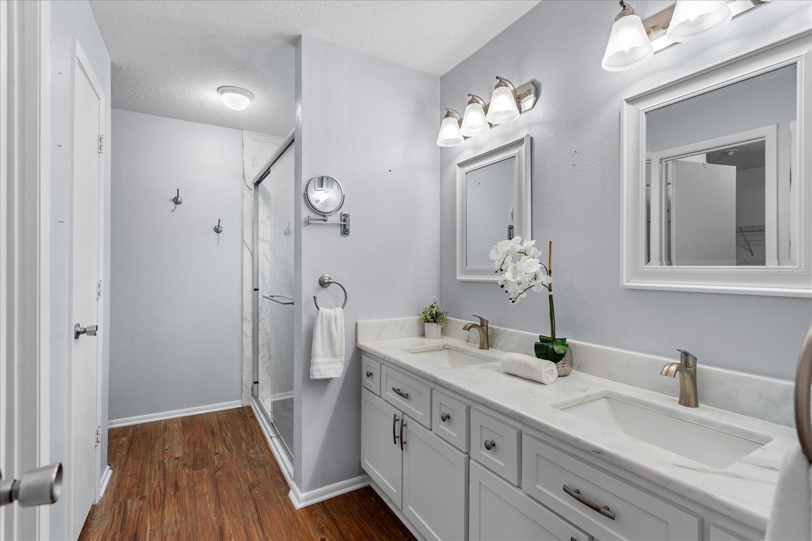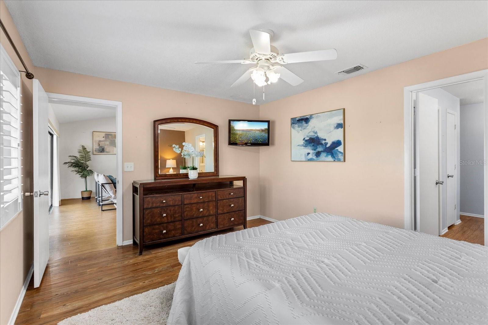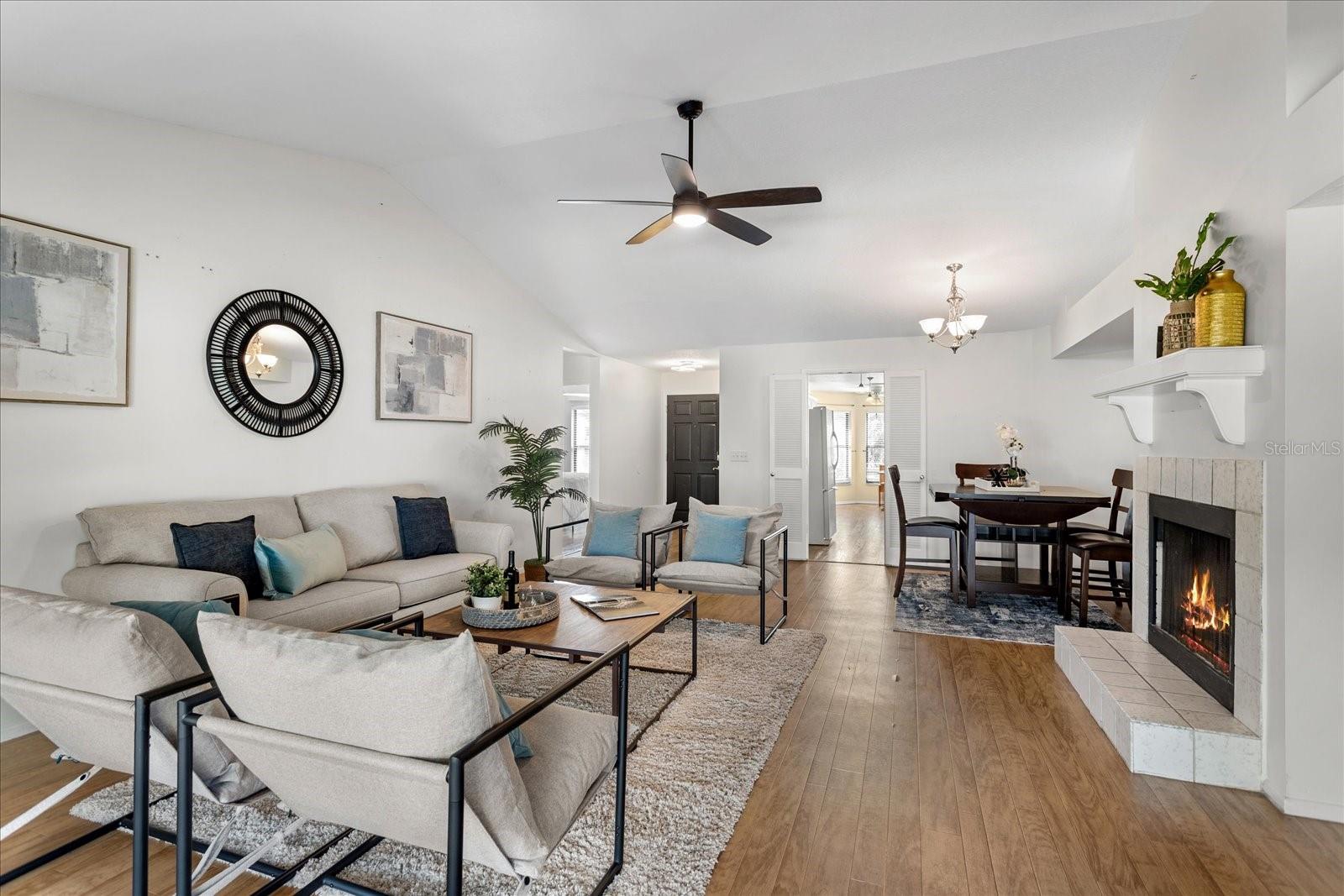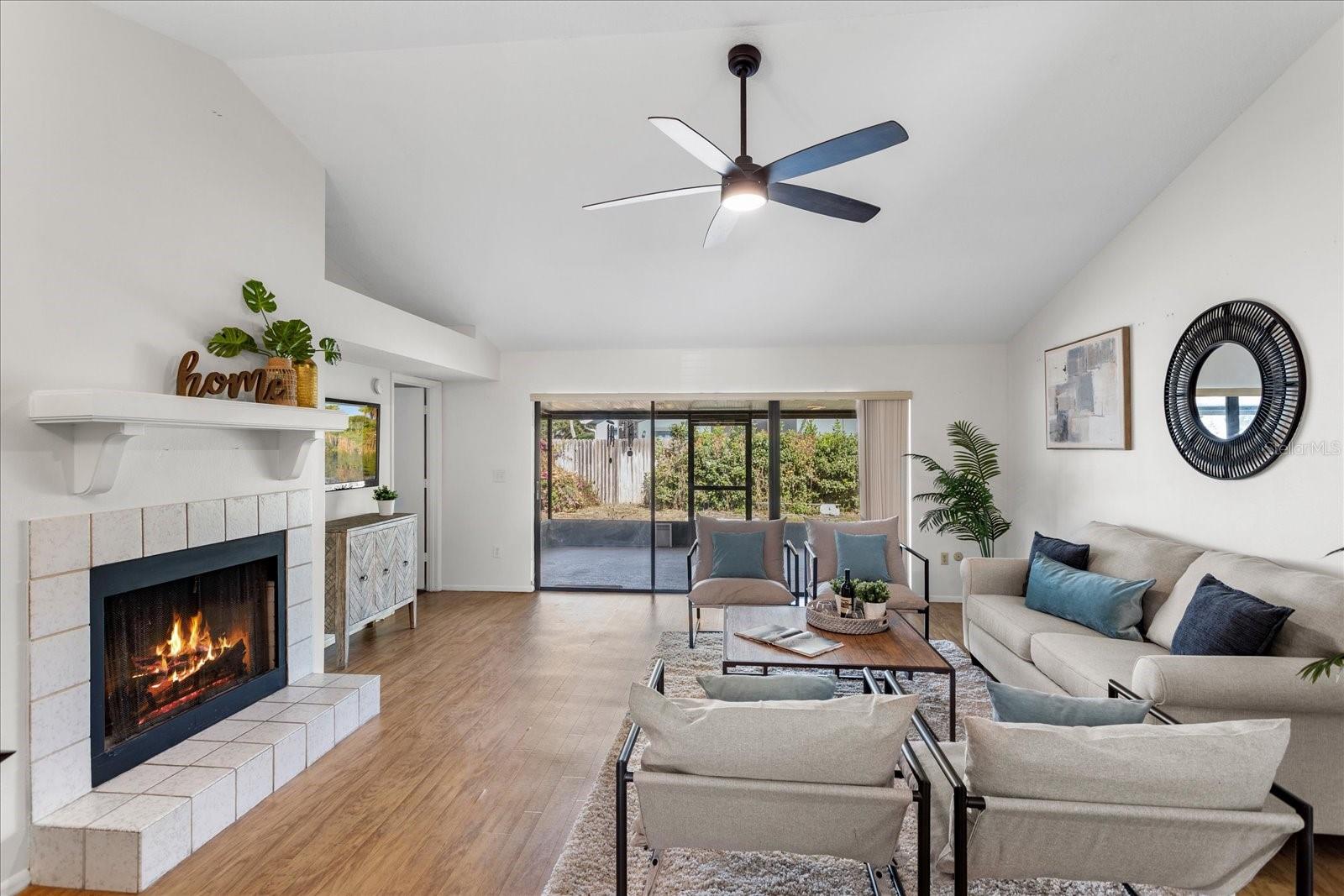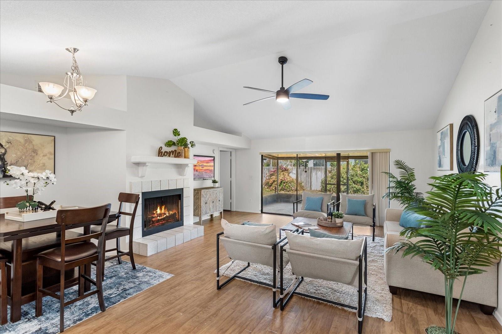 Welcome to this beautifully updated home where style, comfort, and functionality come together effortlessly. The expansive open-concept living and dining area creates an ideal space for both everyday living and entertaining, highlighted by rich wood flooring throughout and a cozy fireplace anchoring the generous living room. The updated kitchen is a true chef’s dream, featuring modern finishes, ample workspace, and a charming eat-in breakfast nook—perfect for casual mornings or gathering with family and friends. Retreat to the serene owner’s suite, a gorgeous haven designed for relaxation. The updated ensuite bathroom offers double vanities, stunning tilework, and a spa-like feel. Two additional bedrooms are generously sized, providing comfort and flexibility for family, guests, or a home office. Ideally located, this home also offers a private backyard oasis with a covered lanai—an inviting space to unwind, entertain, or enjoy peaceful weekends outdoors. With plenty of room to relax and thoughtful updates throughout, this home truly has it all.