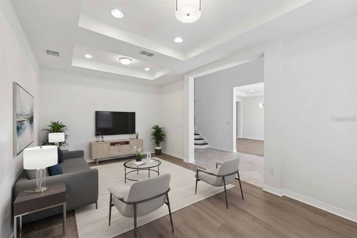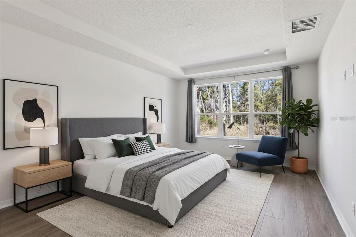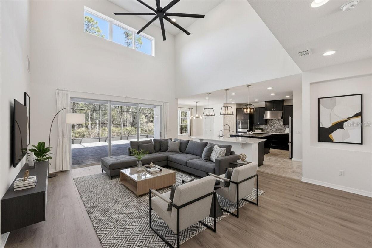 One or more photo(s) has been virtually staged. Located in the gated Whitetail Run community of Oviedo, this residence offers 4,235 square feet of thoughtfully designed living space on a premium homesite backing to conservation with a peaceful pond view to the side. With six bedrooms, three and a half baths, a loft and a dedicated media room, the layout provides both scale and flexibility. A welcoming foyer opens to formal living and dining rooms, each enhanced with luxury vinyl plank flooring that adds warmth and a modern touch to these elegant entertaining spaces. Just beyond, the dramatic two story family room with soaring ceilings anchors the home and flows seamlessly into the kitchen and dinette. The kitchen blends refined design with everyday function, featuring quartz countertops along the perimeter and at the counter height breakfast bar, while the center island offers additional cabinetry and storage topped in granite. A designer tile backsplash, stainless steel hood, built in ovens and microwave, and apron front sink create a polished look, while black metal lantern style pendant lighting and coordinating contemporary fixtures add architectural interest. A butler’s pantry with built in cabinetry connects the kitchen to the dining room, offering additional storage and prep space. The primary suite is privately situated on the first floor, offering a spacious retreat with tranquil backyard views and luxury vinyl plank flooring. The en suite bath features dual vanities plus a dedicated makeup space, a separate soaking tub and walk in shower, and two walk in closets providing abundant storage. Upstairs, a large loft and dedicated media room create versatile bonus living spaces ideal for work or gathering. Two bedrooms share a Jack and Jill bath, each with its own private vanity area, while the remaining two bedrooms share a full bath with a double sink vanity. Outdoor living includes a screened lanai and an extended paver patio overlooking conservation, creating a private setting for entertaining or relaxing. A three car tandem garage provides ample room for vehicles or storage.