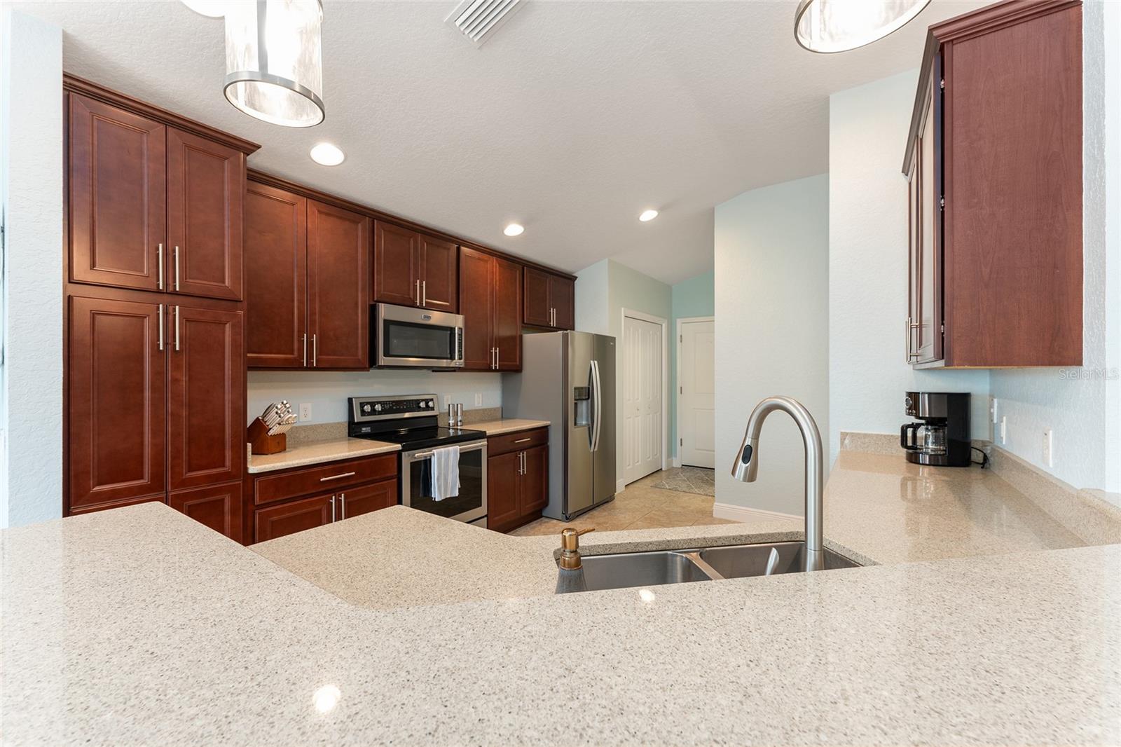 Immaculately maintained Flamingo Model home, situated in the highly sought-after Gated Community of Lakeside Landing's Enclave Subdivision which is ideally located in the area. Just a 12-minute golf cart ride to Sumter Landing, 15+ minutes to Spanish Springs, and less than 10 minutes to most of the conveniences in the area – several grocery stores, medical, dental, the new Home Depot, Lowes, and the future Costco and Target and so much more. The home welcomes you with its manicured lawn, STUCCO exterior, and PAVER driveway. Inside, you'll find an OPEN-CONCEPT, tile floors throughout the main living areas, and Luxury Vinyl Plank in the primary and the guest bedrooms. The kitchen has solid cabinets, QUARTZ COUNTERTOPS, STAINLESS STEEL APPLIANCES, and a breakfast bar that comfortably seats four, while the dining room provides additional space for hosting gatherings. The ample SPLIT GUEST ROOMS share a guest bathroom and linen closet providing privacy for you as well as your guests. The spacious primary bedroom spoils you with its luxurious en-suite bathroom with dual sinks mounted on QUARTZ COUNTERTOPS, complete with a tiled ROMAN SHOWER primary shower and TWO WALK-IN CLOSETS. Enjoy outdoor living with a private backyard in your spacious lanai that has been extended with a birdcage and HOT TUB. A separate laundry room ensures comfort and convenience, and the 2-car garage offers ample space for your golf cart and other personal vehicles. Locking garage door screen for comfort when working in the garage. If all these extras weren't already enough the HOA takes care of exterior pest treatment, lawn care, irrigation, and trash pickup, ensuring a carefree lifestyle. This is a TRULY GATED COMMUNITY featuring impressive wrought iron gates, boasting two pools including a relaxing RESORT-STYLE POOL, two in-ground Jacuzzis, a clubhouse with a library, billiard room, a FULL FITNESS CENTER, space for community events, a card room, putting greens, playground, basketball, tennis, and pickleball courts exclusively to residents. If you enjoy kayaking and sunshine you will love the access to Lake Miona. NO BOND. ROOF and HVAC 2017.