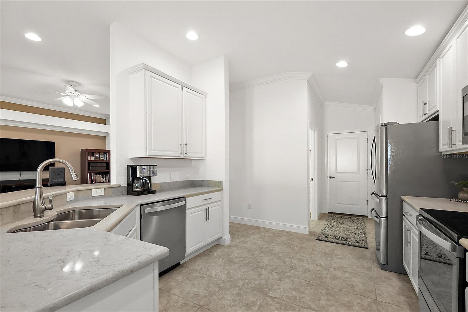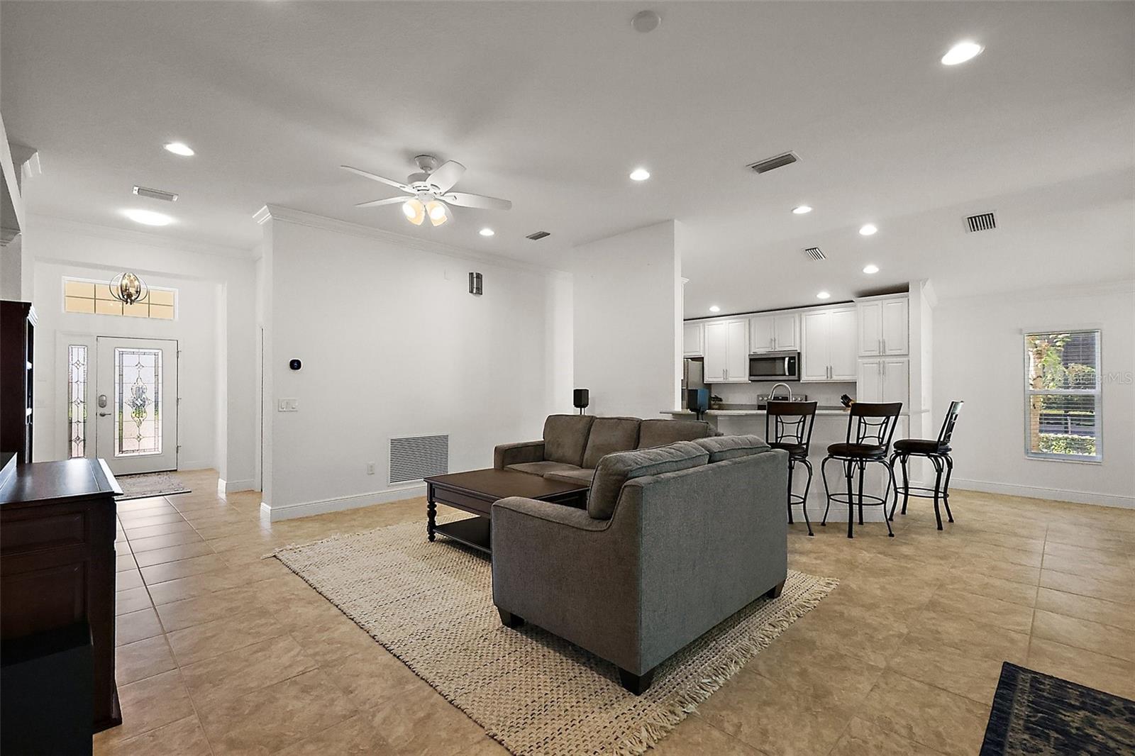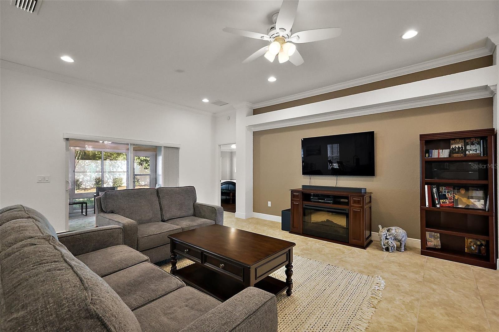 Welcome home! This beautifully updated 3/2 Flamingo, nestled on a quiet cul de sac in the charming Lakeside Landings neighborhood, is the epitome of Florida living. Enjoy COMPLETE REAR PRIVACY, modern upgrades throughout, an interior laundry room, and a spacious Florida room with everything you need for comfort and relaxation in one perfect home. Located in Lakeside Landings with NO CDD OR BOND, this community offers resort-style amenities including a pool, spa, clubhouse, fitness center, pickleball, tennis, playground, and a beach area with access to Lake Miona. As you enter the driveway you are met with an extended PAVER DRIVEWAY, lush Florida landscaping, and a CUSTOM front door with glass insert and sidelight. Upon entering the home you are greeted with an OPEN FLOOR PLAN, tile flooring, high baseboards, and CROWN MOLDING THROUGHOUT. The kitchen boasts barely used STAINLESS STEEL appliances, WHITE CABINETRY, and QUARTZ countertops. Adjacent is a large dining room with plenty of windows and backyard view. The living room has a stunning feature wall with CROWN MOLDING and built-in shelf. The sliding door gives direct access to the high R factor GLASS ENCLOSED Florida room which is the perfect entertaining space complete with an unobstructed view of the PRIVATE BACKYARD and plenty of windows to let the fresh air in. The primary suite is the true oasis with a tray ceiling, crown molding, FIVE windows, his and hers closet, and luxurious en suite bath. The bath houses a ROMAN shower with window and built-in shelving and bench and joint dual vanity. Bedrooms Two and Three both feature crown molding, peaked ceilings, and built-in closets, making them ideal for guests. The guest bathroom offers generous storage and includes a door that separates the sink area from the shower and toilet. The backyard is complete with paver landscaping and mature landscaping, making it YOUR private sanctuary. The INTERIOR laundry room has WHITE CABINETRY, utility sink, and plentiful storage. The garage has attic access, electronic garage door opener, and sliding screen door. Other upgrades include full house gutters and exterior automatic lighting. The HOA fee covers lawn mowing, trimming, mulch replacement, irrigation system maintenance, and garbage collection. Lakeside Landings is conveniently located off of CR 472 (Rainey Trail) between 301 and Buena Vista Blvd in The Villages. Community amenities include a resort-style pool (one of the largest in the area) and spa, clubhouse, exercise facilities, pickleball, tennis, playground, beach area with access to Lake Miona and more! Lakeside Landings residents will also enjoy close proximity to THE VILLAGES CHARTER SCHOOLS, shopping, restaurants, banks, and The Villages community, as well as Lake Sumter Landing Market Square in The Villages, which offers a variety of dining options, movie theaters, and nightly entertainment 365 days a year. Walmart, Fresh Market, and Publix are only minutes away on CR 466. WATCH OUR WALKTHROUGH VIDEO OF THIS BEAUTIFUL HOME and CALL TODAY to schedule your Private Showing or Virtual Tour!