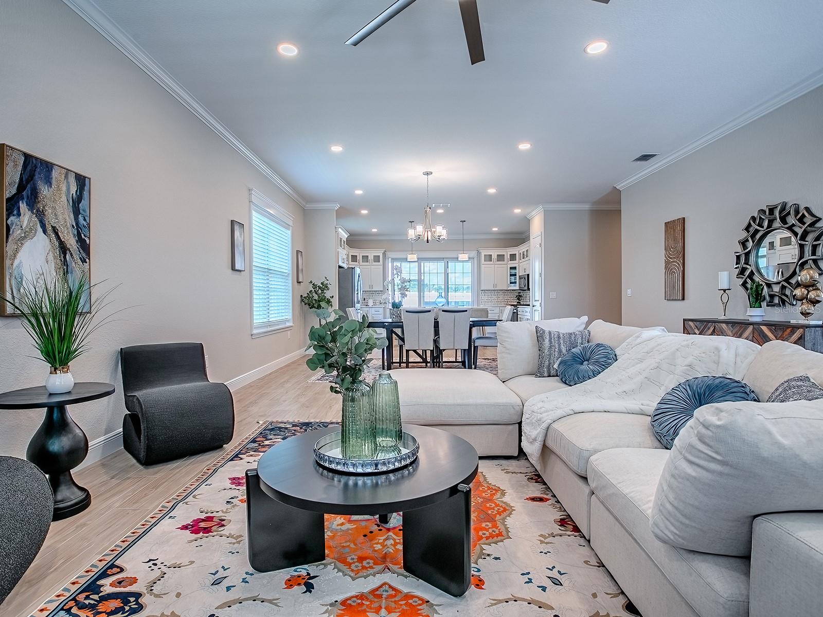 SELLER FINANCING AVAILABLE AT 3.5% RATE WITH 25% DOWN PAYMENT. Luxury Redefined in this 3 Bedroom, 2 Bath Home located in the Family Friendly Gated Community of Densan Park. You will Experience & Appreciate the Style and Functionality in this Quality Stucco Built Home. The Light, Bright & Airy Open Floor Plan is IMPRESSSIVE with FANTASTIC FINISHES & UPGRADES INCLUDING: Grand 10' Ceilings, Porcelain Wood-look Flooring, Crown Molding, Quartz Counters, Upgraded Light Fixtures & Appliances, Tankless Hot Water Heater, Nest Thermostat, Ring Door Bell, a Summer Kitchen, and so much more!! The Gourmet Style Kitchen has Modern Cabinetry with Stylish Hardware, Stainless Steel Appliances (Gas Range), Quartz Counters & Island, Pantry, Decorative Backsplash, and Recessed Lighting. The Primary Ensuite accommodates your King-size Furnishings, has a large walk-in closet, and the luxurious bath comes with Dual Sinks and a Walk-in Shower. The Secondary Bedrooms are good-size with built-in closets and there is a hall bath nearby with a Tub/Shower Combo. The Covered Lanai is complete with a Summer Kitchen equipped with a sink, mini refrigerator, and Barbecue Grill. The yard is fenced and a great place for entertaining &/or family fun! Existing Amenities and/or Amenities to come: Tennis Courts, Playground, Basketball Courts, Volleyball, Fitness Trail/Exercise Stations, Dog Park, Picnic Areas! This Gated 'Family Friendly' Community is located just minutes away from shopping, restaurants, medical, VA, The Villages Charter School and The Villages Town Squares! TRULY A PERFECT PLACE TO CALL HOME!