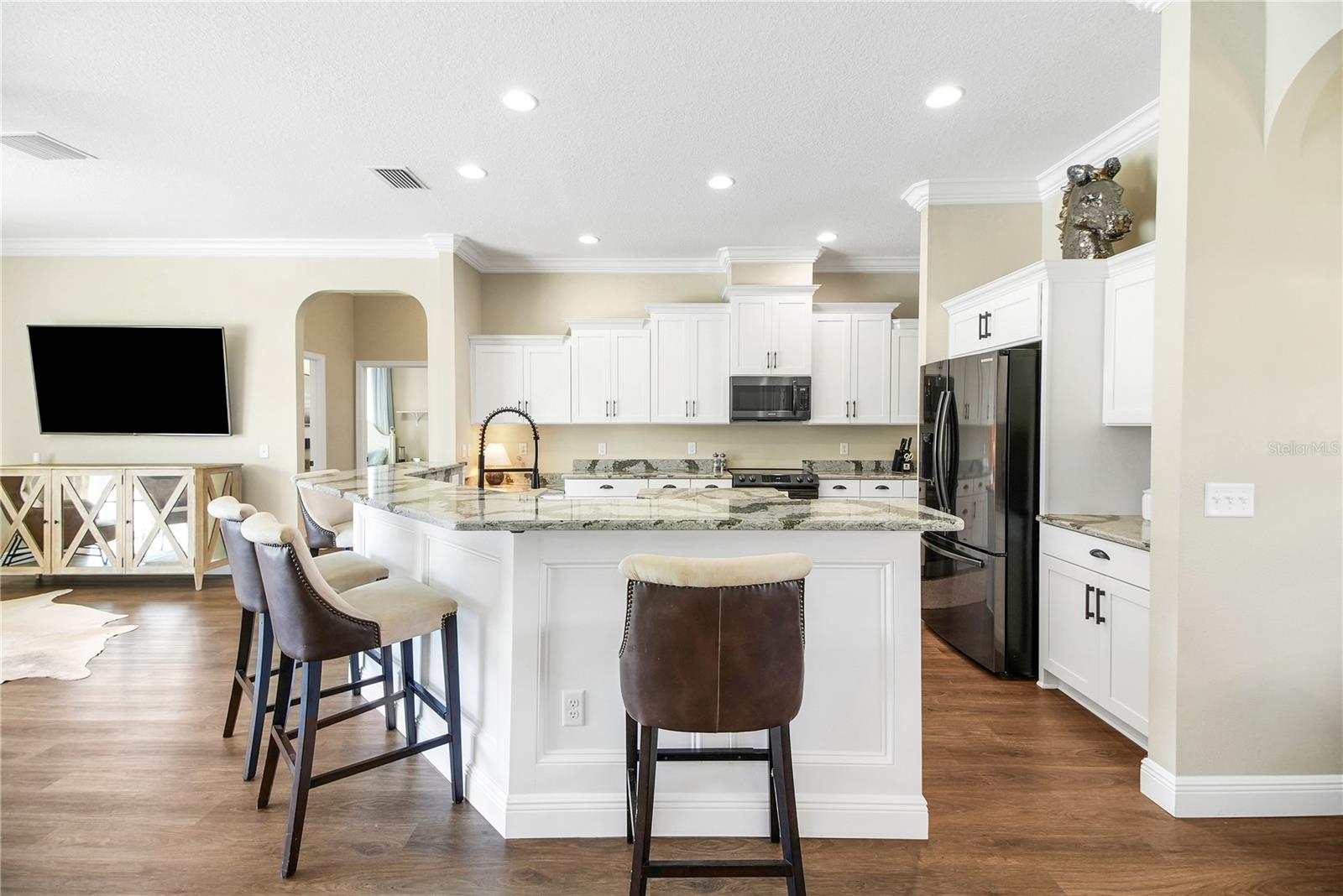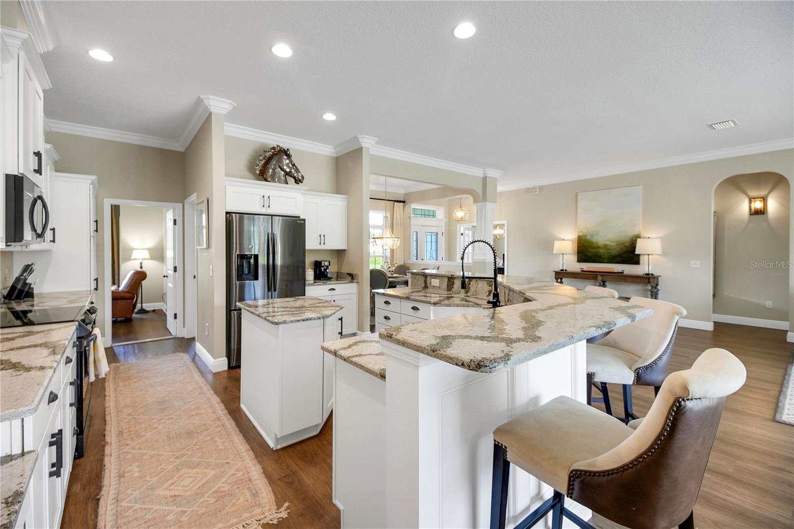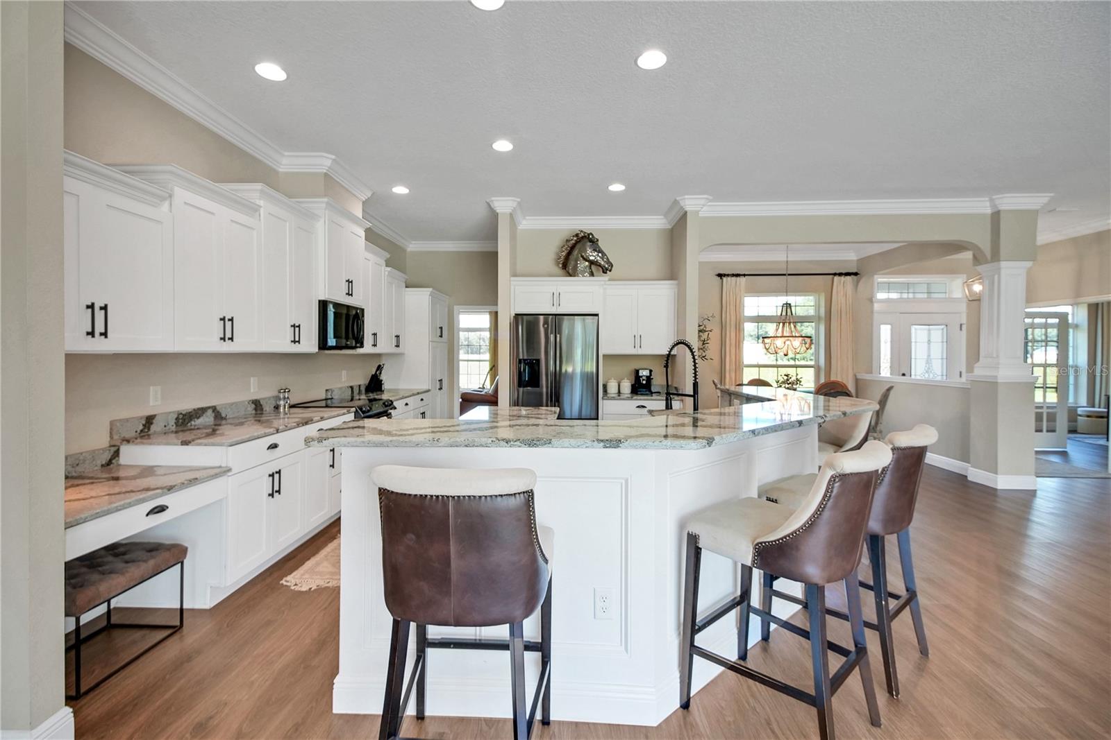 Country living at its finest! Nestled on over 10+ lush and mostly cleared acres in desirable Oxford, this custom 4-bedroom, 3-bath salt water pool home with bonus room is a true showstopper. Built in 2021 with BLOCK construction and Hardieboard siding, the home offers over 2,700 sq. ft. of thoughtfully designed living space. Step inside to find luxury vinyl flooring, crown molding, high ceilings, and 5-inch baseboards throughout the main areas. The open, split floor plan is ideal for entertaining, featuring a chef-inspired kitchen with quartz countertops, stainless steel appliances, white cabinetry, a farmhouse sink, crown accents, and a cabinet pantry. The spacious living room overlooks the sparkling saltwater pool and wide-open views beyond. The primary suite is filled with natural light and includes a spa-like bath with dual sinks, granite countertops, a corner soaking tub, and a beautifully tiled shower. The versatile bonus room includes a closet and private outdoor access—perfect as a game room, guest suite, or additional bedroom. Guest baths are equally impressive with granite counters, white cabinetry, and stylish tile shower & shower/tub combo. Step outside to your own private retreat! Enjoy the resort-style pool with sun shelf, paver decking, and plenty of space to host family and friends. With 10+ acres, there’s more than enough room for pets, toys, and the lifestyle you’ve been dreaming of.