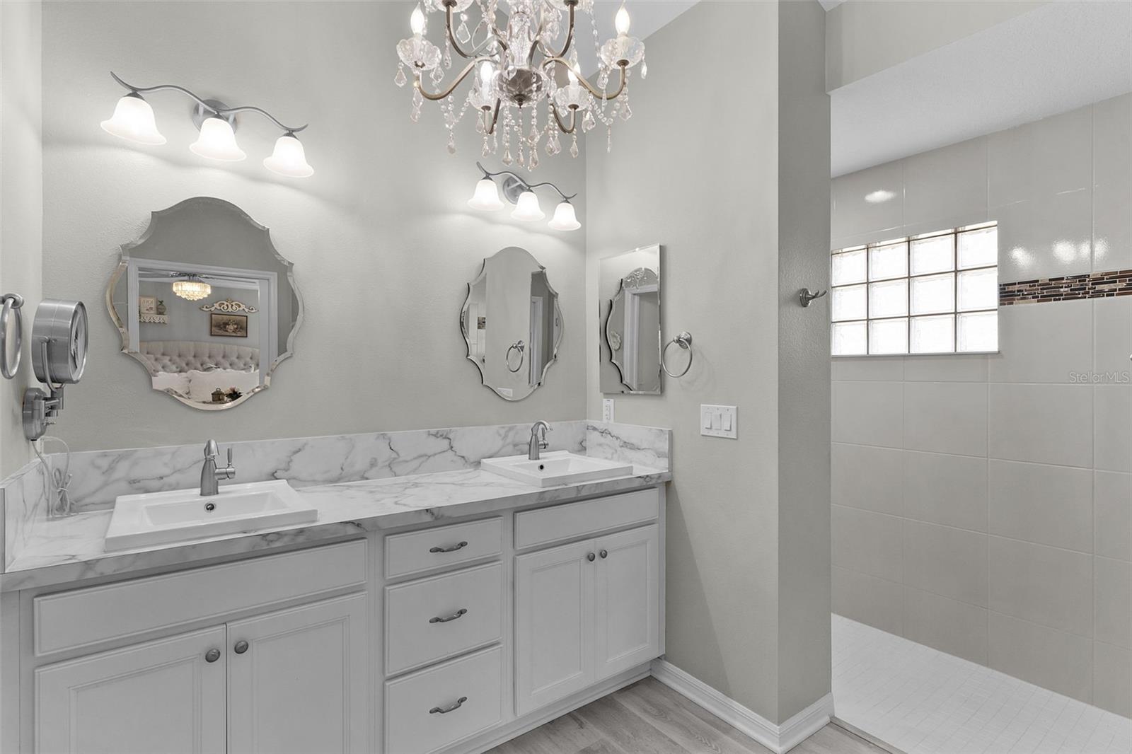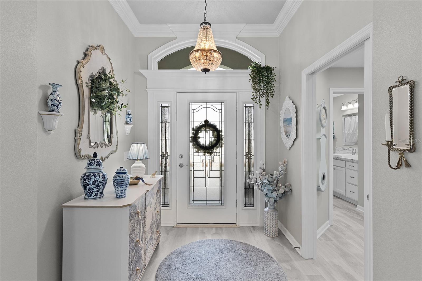 Welcome to this Stunning 4-bedroom, 2-bath Orchid floorplan, with a 2-car garage plus GOLF CART GARAGE, and SOLAR HEATED SALTWATER POOL, nestled within the VIBRANT, EXCLUSIVE, GATED ALL-AGE community of Oxford Oaks! NO BOND! Conveniently located JUST MINUTES from The Villages® Community and The Villages® Charter Schools, as well as 466 with an ABUNDANCE of shops (including the NEW COSTCO), restaurants, banks, medical and much more! Welcomed with Tropical Landscaping custom designed STACKED PAVERS, Elegant LEADED GLASS front door welcoming you into the generous Foyer of this STUNNING CONTEMPORARY OPEN CONCEPT and Views of the SALTWATER POOL and COVERED LANAI. FACTS about this house, COMPLETELY UPDATED in 2023 includes, MOHAWK LUXURY VINYL FLOORING, PAINTED Exterior Garage Door & Front Door, PAINTED ENTIRE INTERIOR, INSTALLED WHOLE HOUSE WATER FILTRATION, KITCHEN CABINETS REFACED, NEW QUARTZ COUNTERS & GRANITE SINK (kitchen), NEW QUARTZ BACKSPLASH, ALL NEW LIGHTING & CEILING FANS, BATHROOM CABINETS REFACED & COUNTERS, TUB & SHOWER REGLAZED & SEALED, TOILETS, FAUCETS & SHOWER HEADS, CUSTOM CLOSETS, IRRIGATION UPDATED & SERVICED, PLANTATION SHUTTERS & CUSTOM CORNICES, EXTERIOR PRIVACY SHADES, LAUNDRY ROOM SINK GLAZED PLUS FAUCET & CABINET REFACED, NEW SAMSUNG WASHER & DRYER. From the Living Room, CROWN MOLDING throughout, then step through SLIDING GLASS DOORS, adorned with CUSTOM CORNICES, and enjoy true Florida living in the EXPANSIVE SCREENED-IN SOLAR HEATED SALTWATER POOL, WATERFALL and COVERED LANAI. This spacious retreat offers plenty of room for lounging on the SECTIONAL SET (included), and year-round outdoor entertaining. Includes Storage CABINET WITH WINE REFRIGERATOR. (TV avail separate) PRIVACY SHADES on the Enclosure/Lanai and VINYL PRIVACY FENCE for added Privacy. Back inside, the Living Room is spacious with the beautiful MOHAWK LUXURY VINYL FLOORING throughout, CROWN MOLDING, CUSTOM CORNICES and CHANDELIER LIGHTING the perfect amount of elegancy. This is an Entertainers house with plenty of seating with a Formal Dining area and a Dinette space. The Kitchen has QUARTZ COUNTERS with room for Barstools, WINE RACK, PANTY (Pull-outs), STAINLESS STEEL APPLIANCES, GRANITE SINK, and CUSTOM RANGE HOOD. Countertop Microwave included. Entering the Primary Bedroom is a retreat in itself, featuring TRAY CEILING, CHANDELIER FAN/LIGHT. The Primary STYLISH en-suite bathroom features a CUSTOM CLOSET, SHAKER cabinetry, DOUBLE vanities, a TILED ROMAN-STYLE WALK-IN ZERO THRESHOLD shower, LINEN closet, and a separate water closet. The other Three Bedrooms, each featuring VAULTED CEILINGS, PLANTATION SHUTTERS, and a GUEST Bathroom. POCKET DOOR in hallway creating a PRIVATE GUEST WING. An INTERIOR Laundry Room, has a UTILITY SINK and Cabinets plus 2023 SAMSUNG WASHER & DRYER included. Large TWO-CAR GARAGE PLUS GOLF CART GARAGE. This Concrete Block Home also has SEAMLESS GUTTERS, and IRRIGATION. Oxford Oaks is a non-age-restricted, Golf Cart friendly community built by The Villages®. EXCLUSIVE AMENITIES INCLUDE: a large Resort-Style Pool, Pickle Ball Courts, Tennis Courts, Basketball Court, Outdoor Exercise Equipment, and a fabulous Playground! Lake Sumter Landing (5.4 miles) and Brownwood (7 miles) Squares in The Villages® various dining options, and nightly entertainment 365 days a year. DON'T MISS YOUR OPPORTUNITY! Private Showing or Virtual Tour!