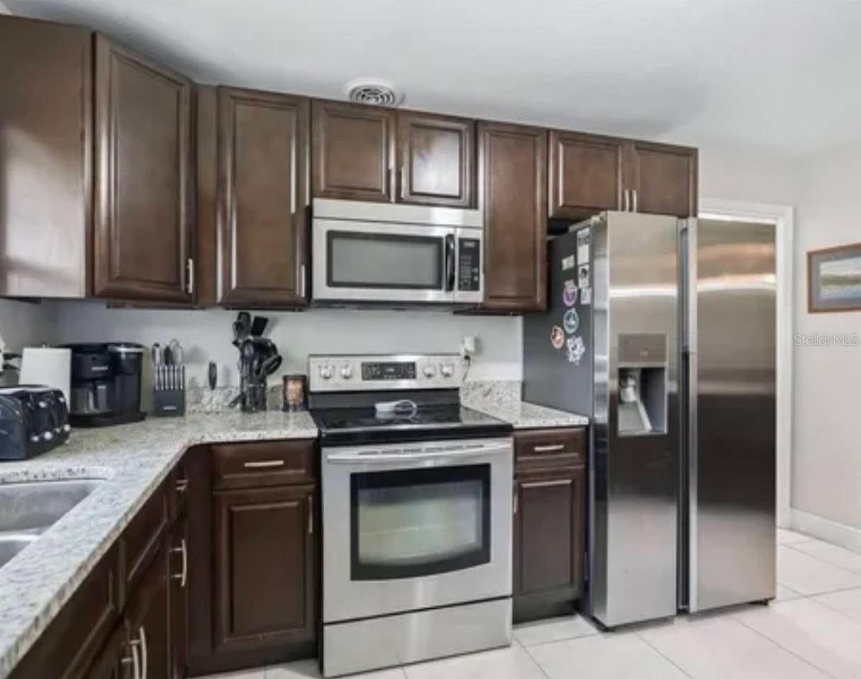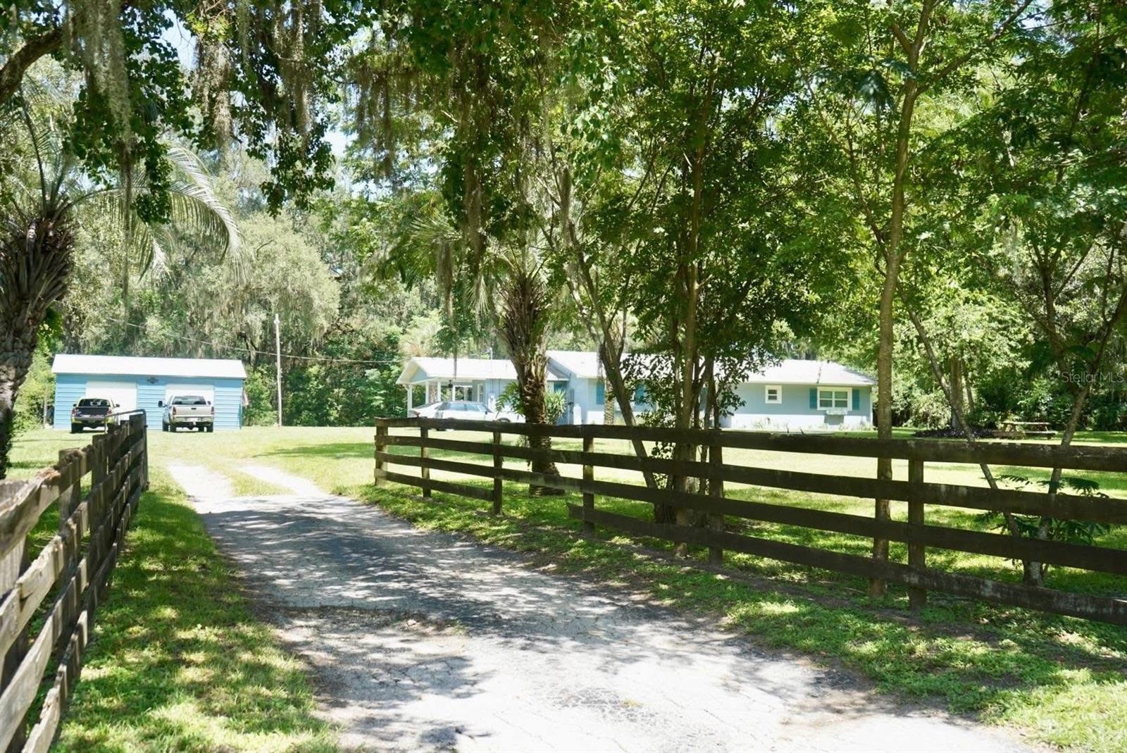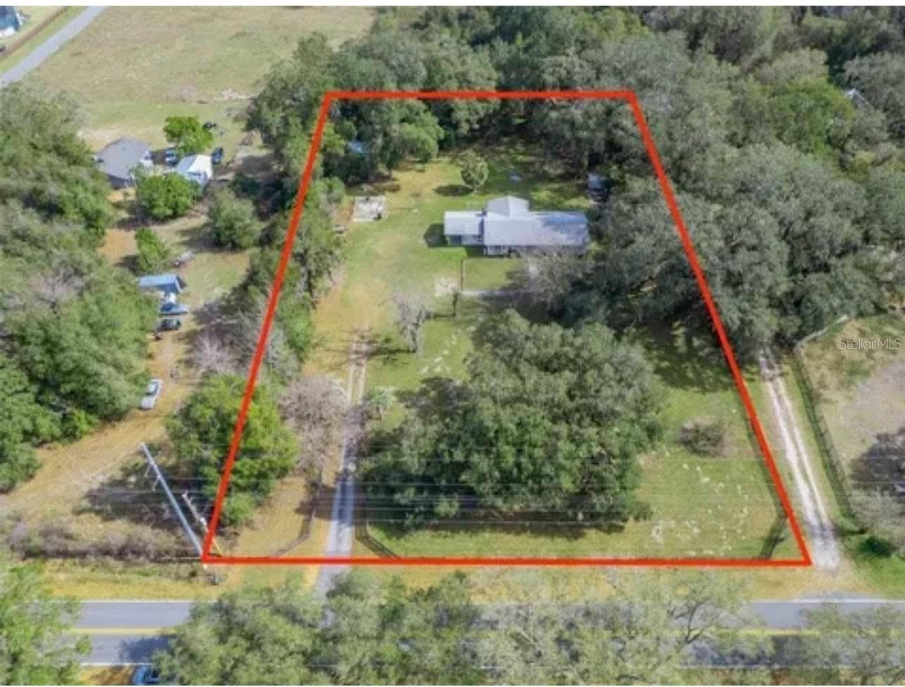Nestled on over 2 acres in a tranquil country setting, this concrete block home offers serene privacy while still being just minutes from shopping, dining, and The Villages Charter Schools. Tucked back off the road behind a stately oak tree, the property presents classic rural charm. Step inside to discover a renovated interior with an open-concept layout, including a spacious great room anchored by a cozy fireplace, a dining area, and a light-filled kitchen. The kitchen features tile flooring, stainless steel appliances, granite countertops, beautiful cabinetry, a large sink beneath a picture window, and a breakfast bar with pendant lighting—perfect for casual meals and entertaining. Throughout the home, warm wood laminate flooring and dark cabinetry. This home comprises 4 generously sized bedrooms and 2.5 baths, including a master ensuite with a glass-and-tile walk-in shower and roomy vanity. The guest bath continues the granite theme with a square sink and tile-surround tub/shower combo. In addition, there’s a flexible bonus room ideal for use as an office, hobby space, or storage. Convenience meets smart upgrades with the indoor laundry room coupled with a half bath, offering easy access from the rear of the home. A tankless hot water heater accommodates the household’s needs efficiently. Outdoors, there’s a concrete patio and covered seating area perfect for relaxing or entertaining guests. A firepit for cooler evenings, plus a charming two-story playhouse tucked into the rear corner, add to the leisure appeal. A recently added 2-car garage, new propane tank, 4-board fencing, upgraded appliances, and a 2018 roof round out the structural and utility enhancements. Despite its peaceful, private ambiance, this home is well priced and ideally located—close to everything while maintaining a quiet, country lifestyle. Don’t miss your opportunity—schedule your private tour today!