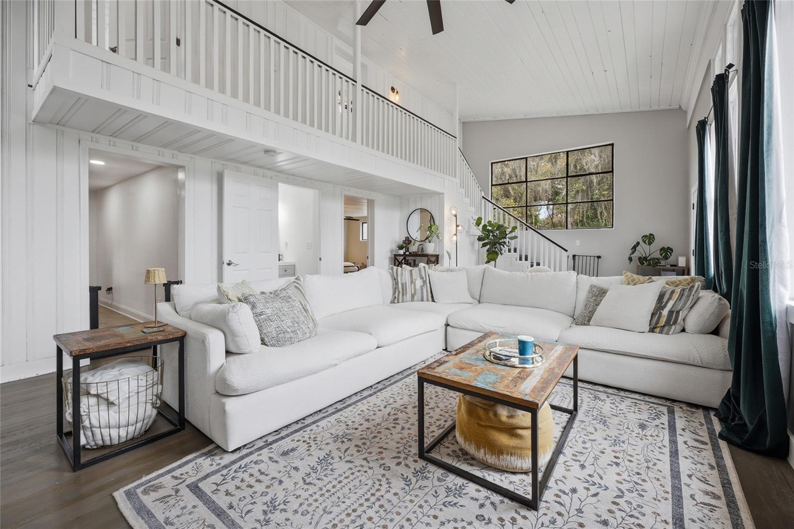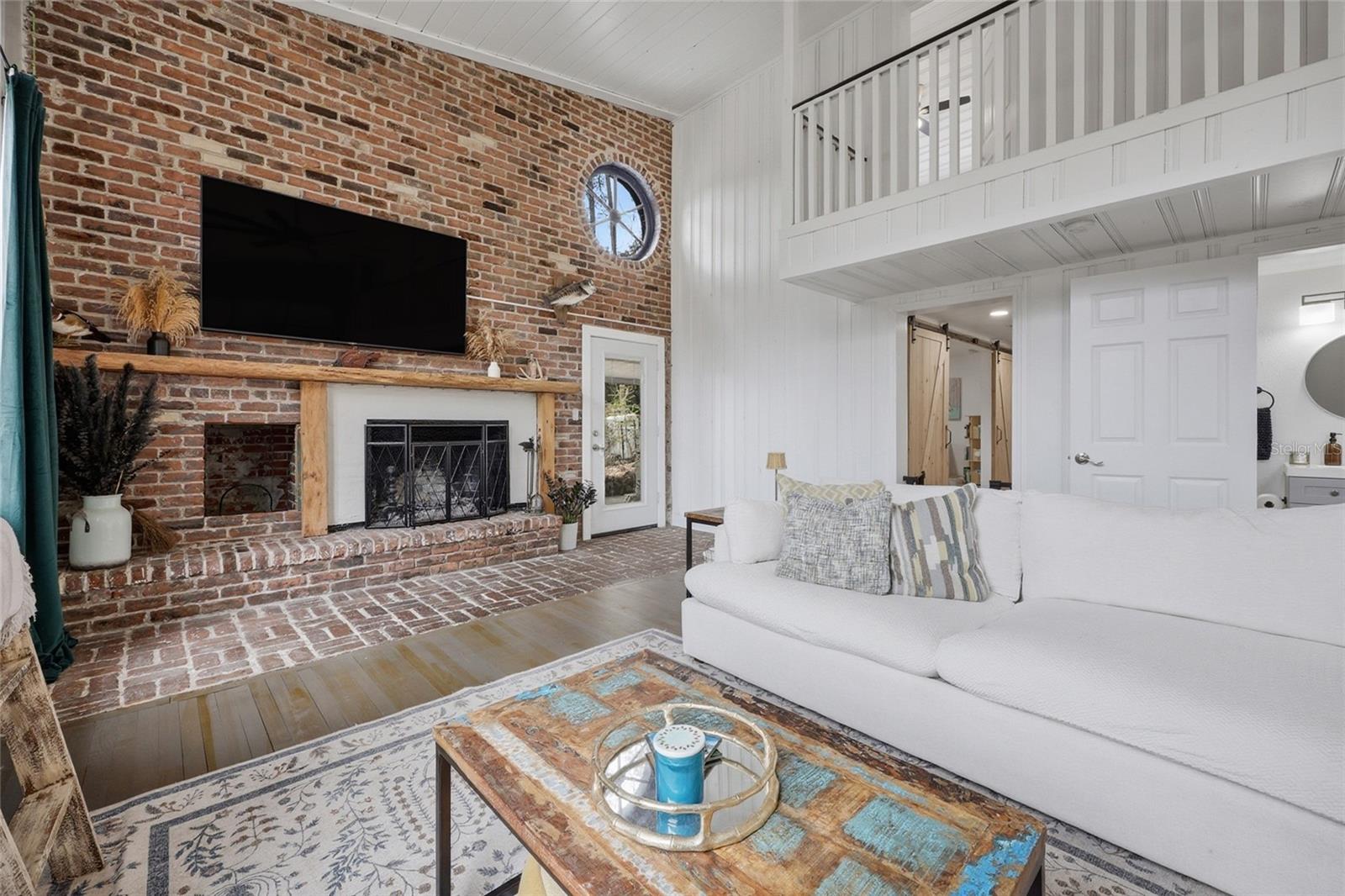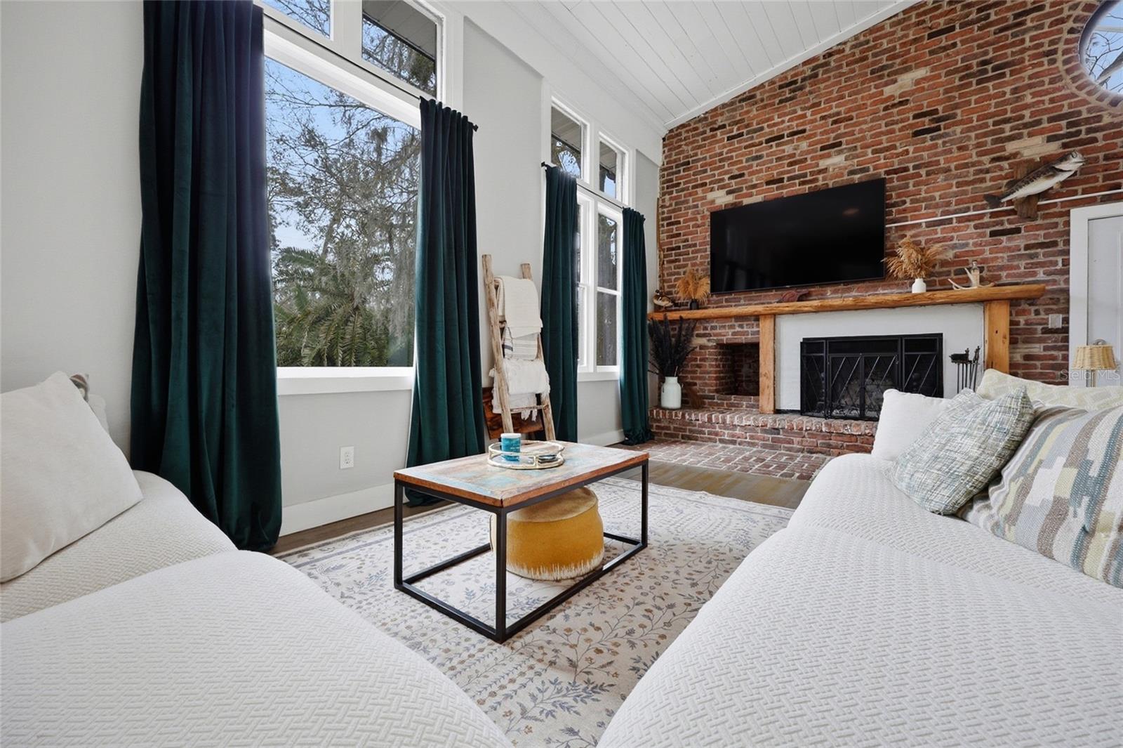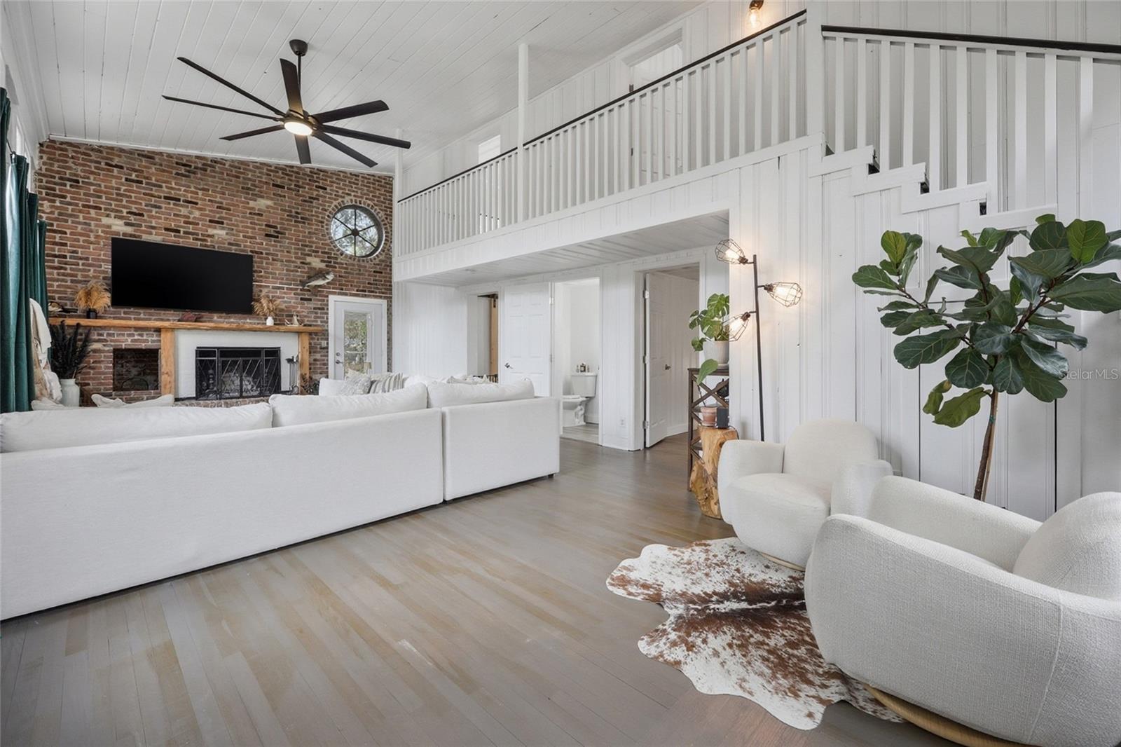 One-of-a-kind and full of character, this Mid-Century Modern-inspired home immediately commands your attention. Thoughtfully updated in 2023, with a metal roof installed in 2018 and a full re-plumb completed in 2025, this home offers the perfect blend of architectural charm and meaningful system upgrades. Drenched in natural light from oversized black-framed windows of every shape and size, the interior celebrates volume, texture, and design. The dramatic main living area features soaring 20-foot ceilings, a stunning balcony overlook, and a massive wood-burning brick fireplace--complete with a built-in wood box--creating the ultimate gathering and entertaining space, with a conveniently located half bath nearby.The primary suite is privately tucked beneath the balcony just off the main living area and features a modest yet stylish en-suite with a walk-in shower and double-sink vanity. Just down the hall, a dedicated office provides the perfect work-from-home retreat. The modern kitchen with gas range flows into a spacious dining room highlighted by a contemporary accent wall, while the walk-through laundry/mudroom adds everyday convenience. Upstairs, two large bedrooms are connected by a Jack-and-Jill bath, offering flexibility for family or guests. Outside, a wraparound concrete patio helps keep maintenance simple while extending your living and entertaining space outdoors. The covered rear patio is ideal for summer barbecues, and the spacious corner lot provides room for boats, trailers, and all your recreational toys. With well and septic service and no HOA, you'll enjoy both independence and functionality--all quietly located in the heart of Palatka just minutes from downtown, the riverfront, and Ravine Gardens State Park.