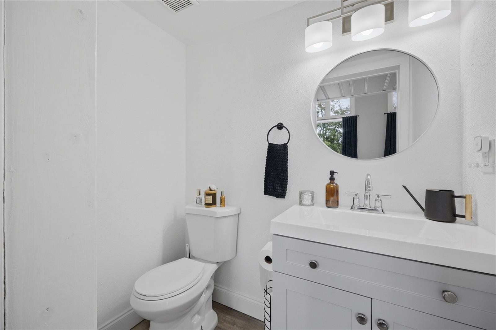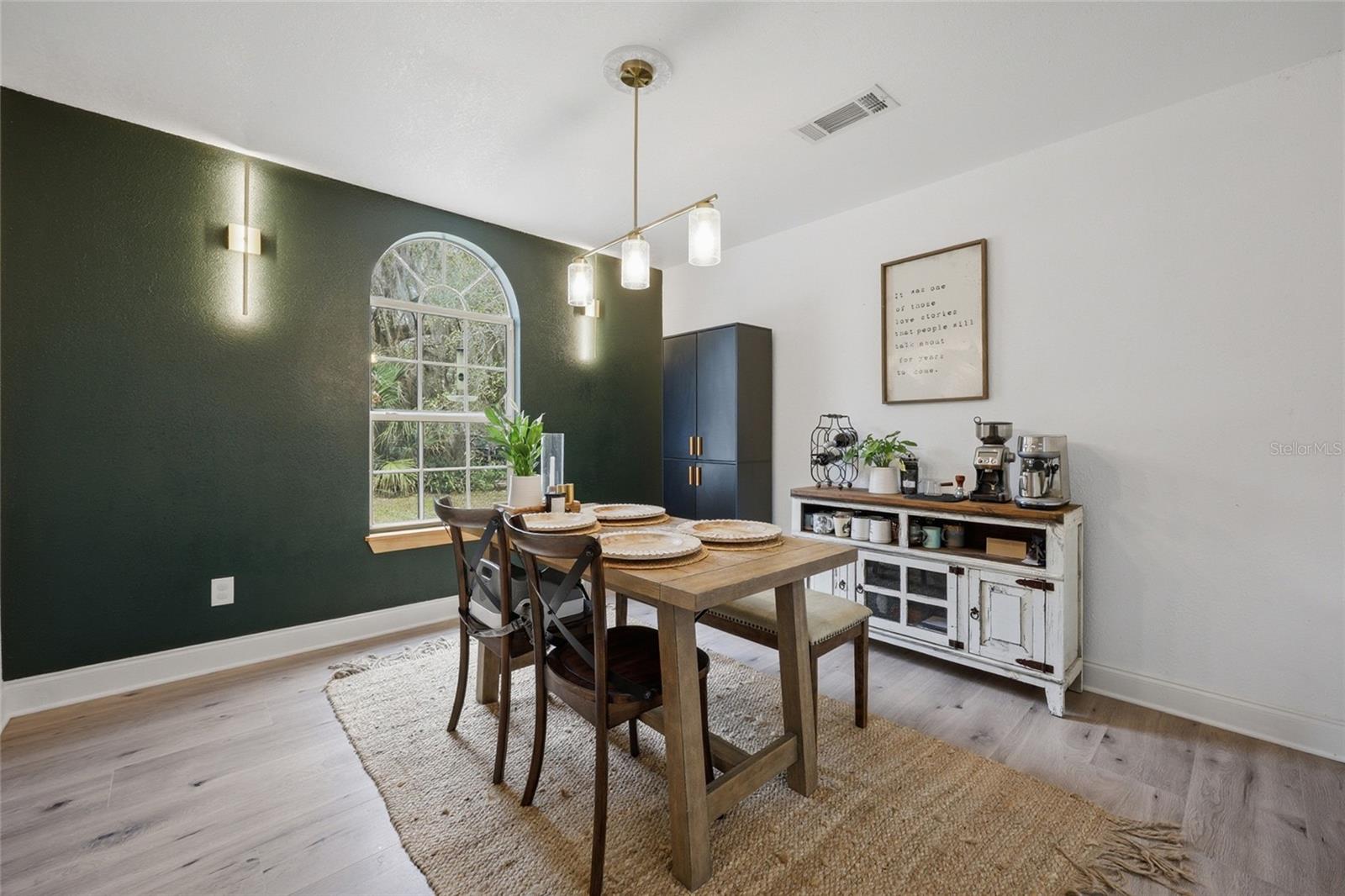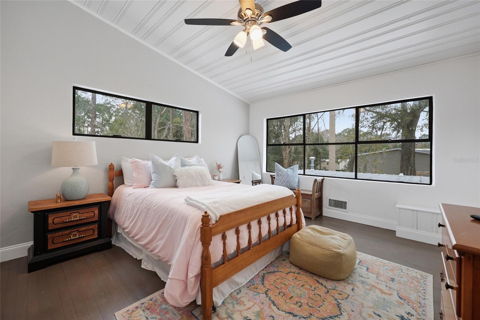 One-of-a-kind and full of character, this Mid-Century Modern-inspired home immediately commands your attention. Thoughtfully updated in 2023, with a metal roof installed in 2018 and a full re-plumb completed in 2025, this home offers the perfect blend of architectural charm and meaningful system upgrades. Drenched in natural light from oversized black-framed windows of every shape and size, the interior celebrates volume, texture, and design. The dramatic main living area features soaring 20-foot ceilings, a stunning balcony overlook, and a massive wood-burning brick fireplace--complete with a built-in wood box--creating the ultimate gathering and entertaining space, with a conveniently located half bath nearby.The primary suite is privately tucked beneath the balcony just off the main living area and features a modest yet stylish en-suite with a walk-in shower and double-sink vanity. Just down the hall, a dedicated office provides the perfect work-from-home retreat. The modern kitchen with gas range flows into a spacious dining room highlighted by a contemporary accent wall, while the walk-through laundry/mudroom adds everyday convenience. Upstairs, two large bedrooms are connected by a Jack-and-Jill bath, offering flexibility for family or guests. Outside, a wraparound concrete patio helps keep maintenance simple while extending your living and entertaining space outdoors. The covered rear patio is ideal for summer barbecues, and the spacious corner lot provides room for boats, trailers, and all your recreational toys. With well and septic service and no HOA, you'll enjoy both independence and functionality--all quietly located in the heart of Palatka just minutes from downtown, the riverfront, and Ravine Gardens State Park.