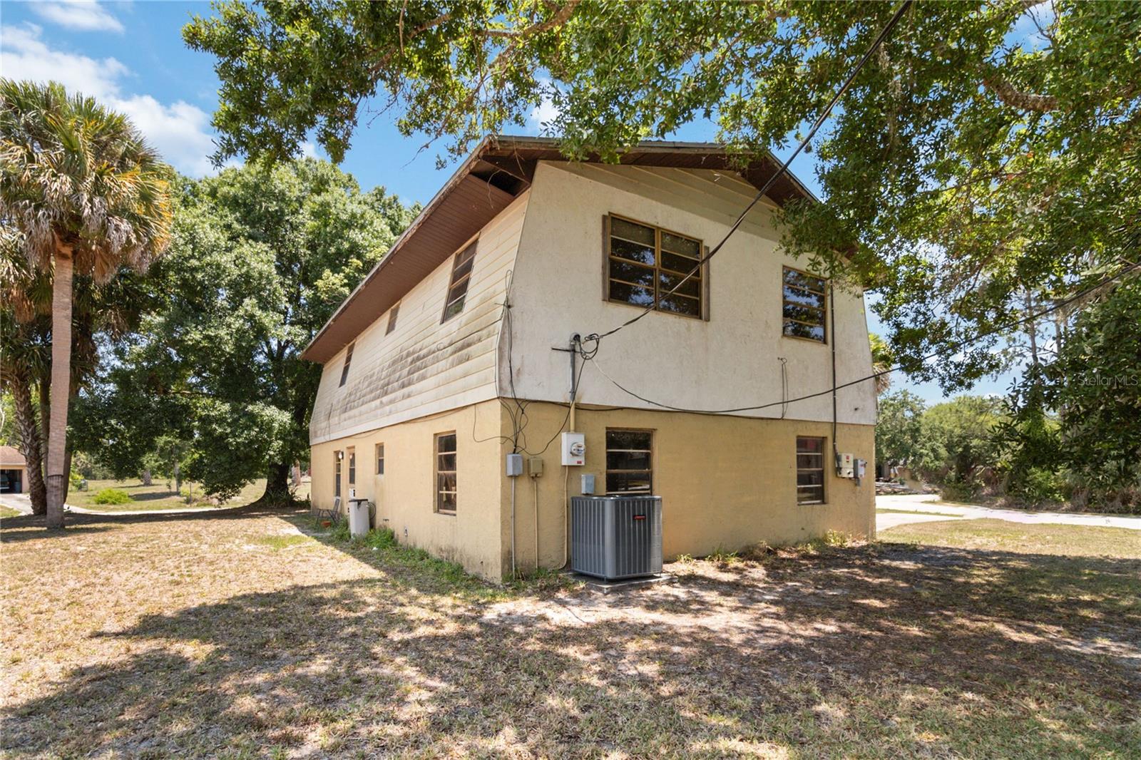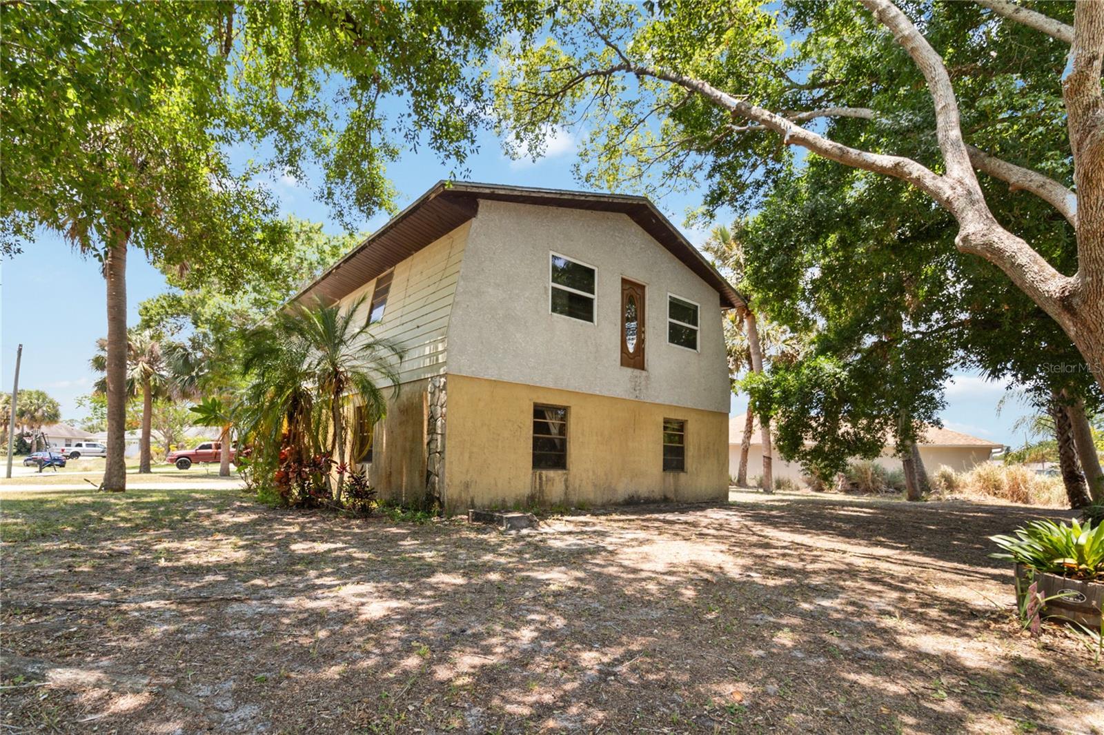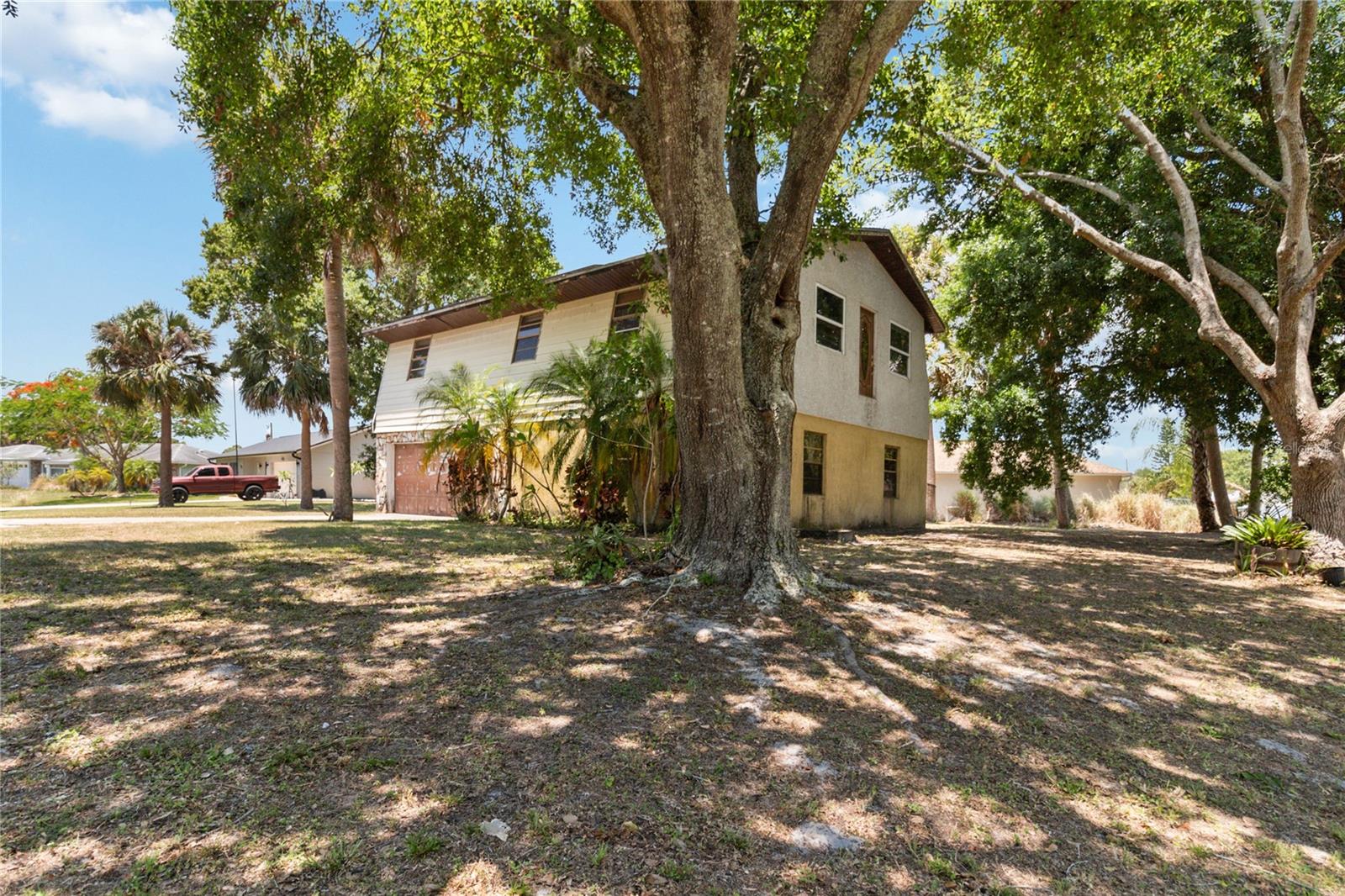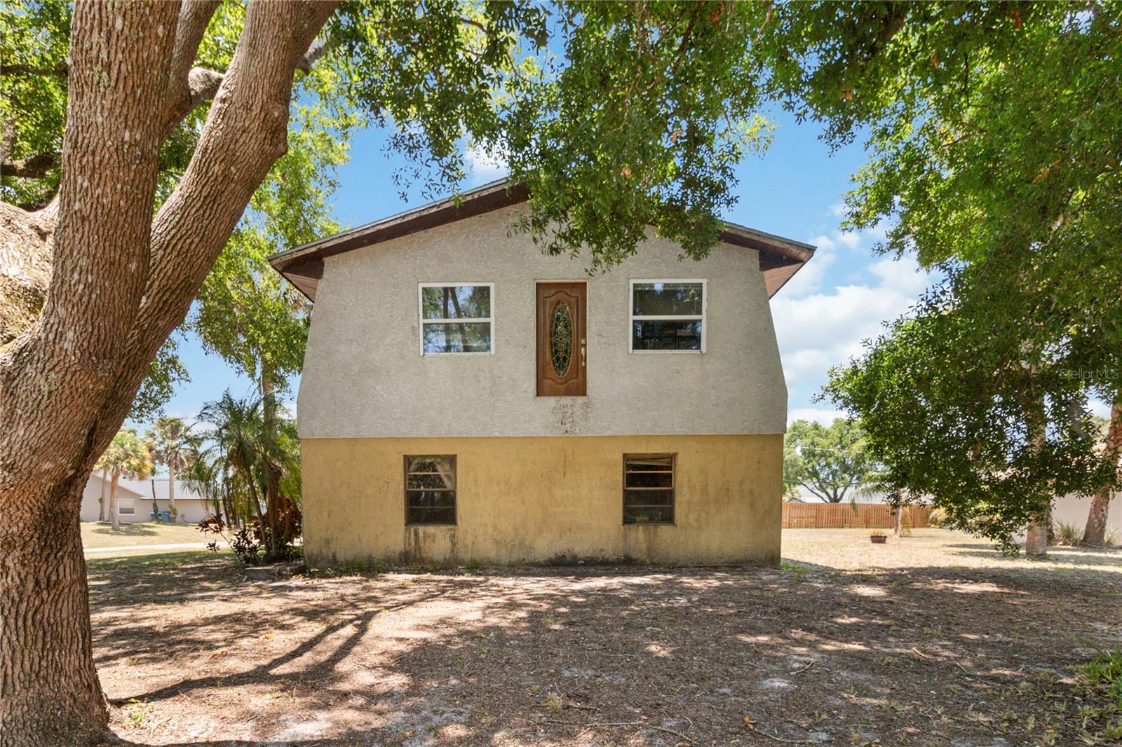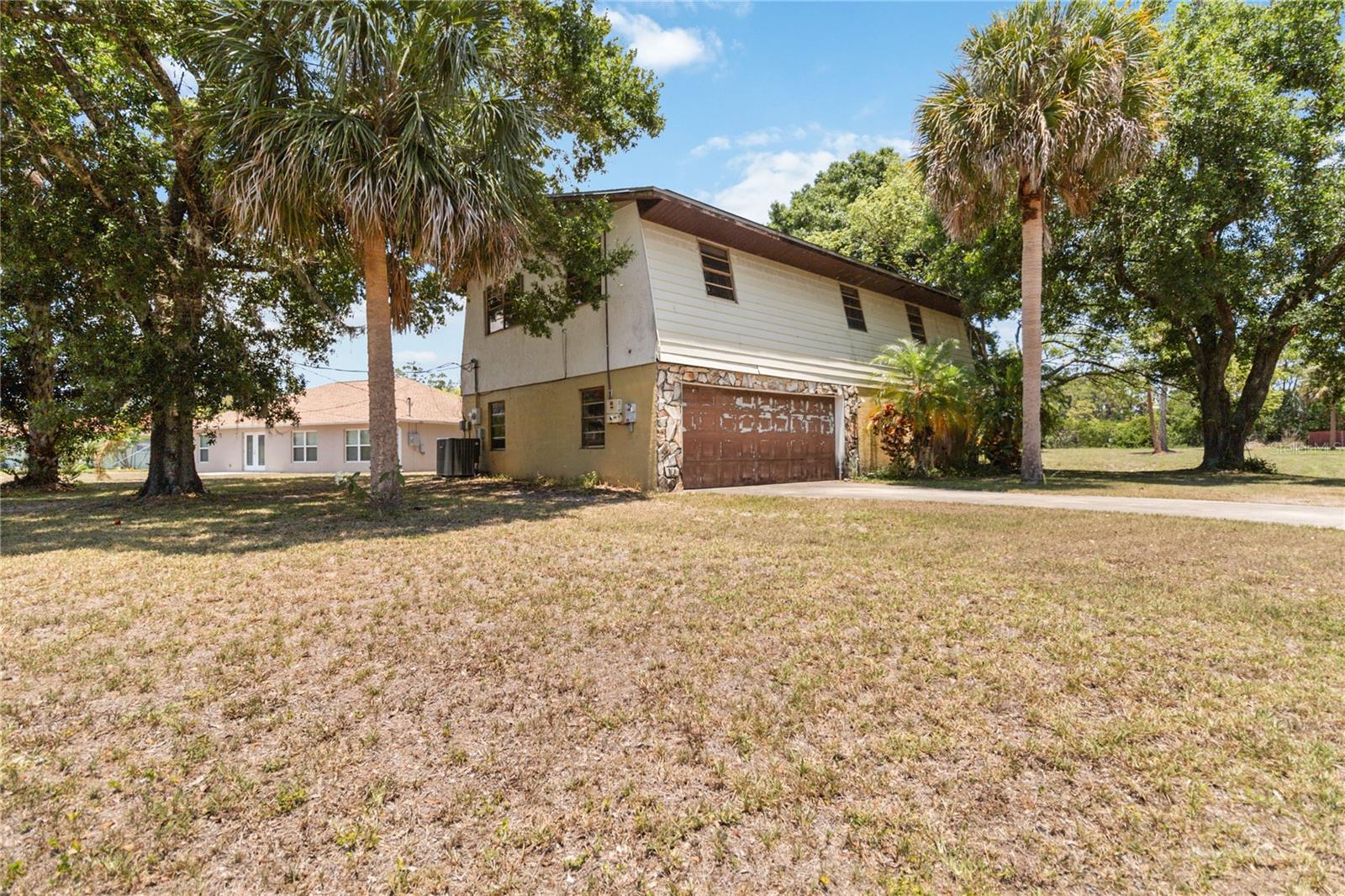 Great investment opportunity! Cash only! This unique, barn shaped 2-story home is surrounded by mature oak trees on a large corner lot and features 3 bedrooms and 2 baths. Downstairs you'll find a large family room, the owner's bedroom and full bath - could be a guest suite or rental opportunity. Upstairs boasts a full kitchen, living room with cozy wood-burning fireplace, dining area, 2 bedrooms and a full bath. AC is 2023. Water heater is 2021. Solar panels - utility bills are very reasonable! Whole home water softener and filtration system. 2 car garage. Conveniently located near shopping, dining, 20 min to Harris, 30 min to beach & Patrick Air Force Base, 50 min to Kennedy Space Center, NASA, SpaceX, Blue Origin, 60 min to Orlando airport and area attractions.
