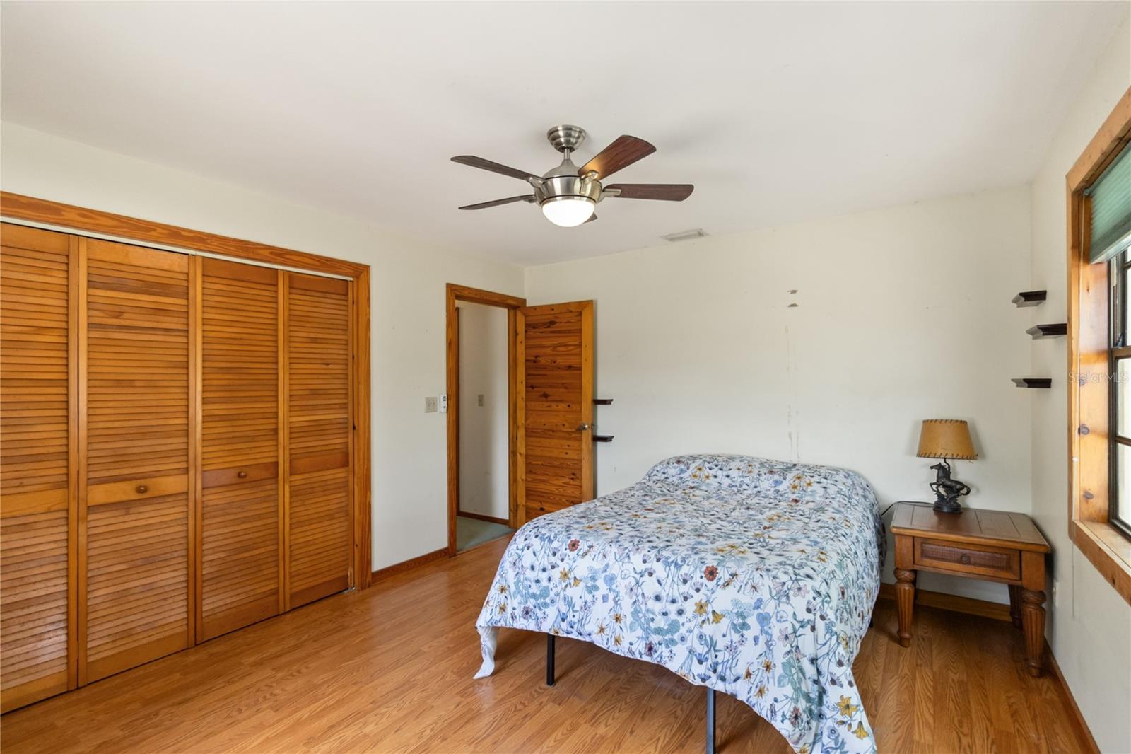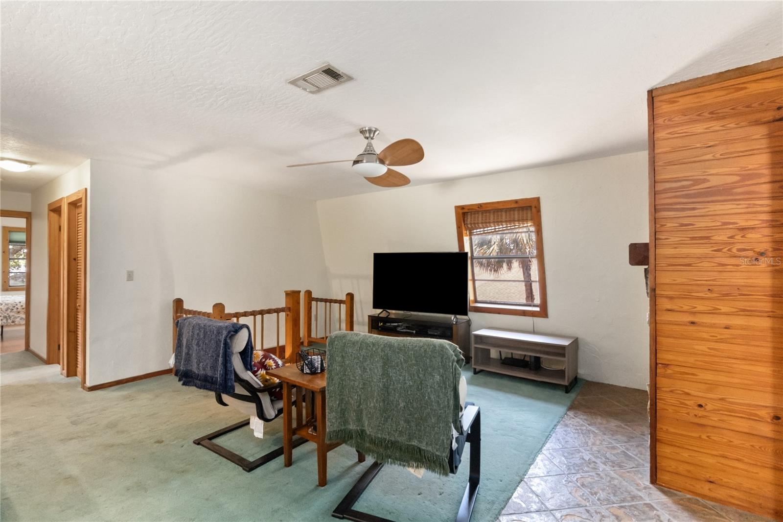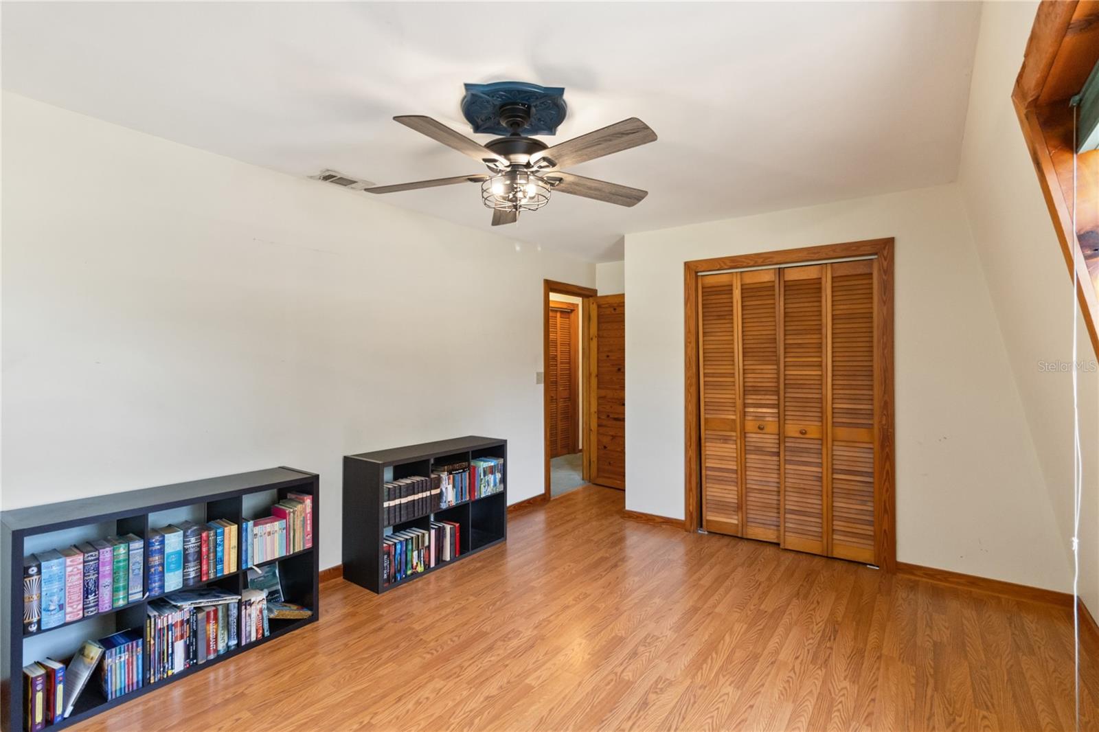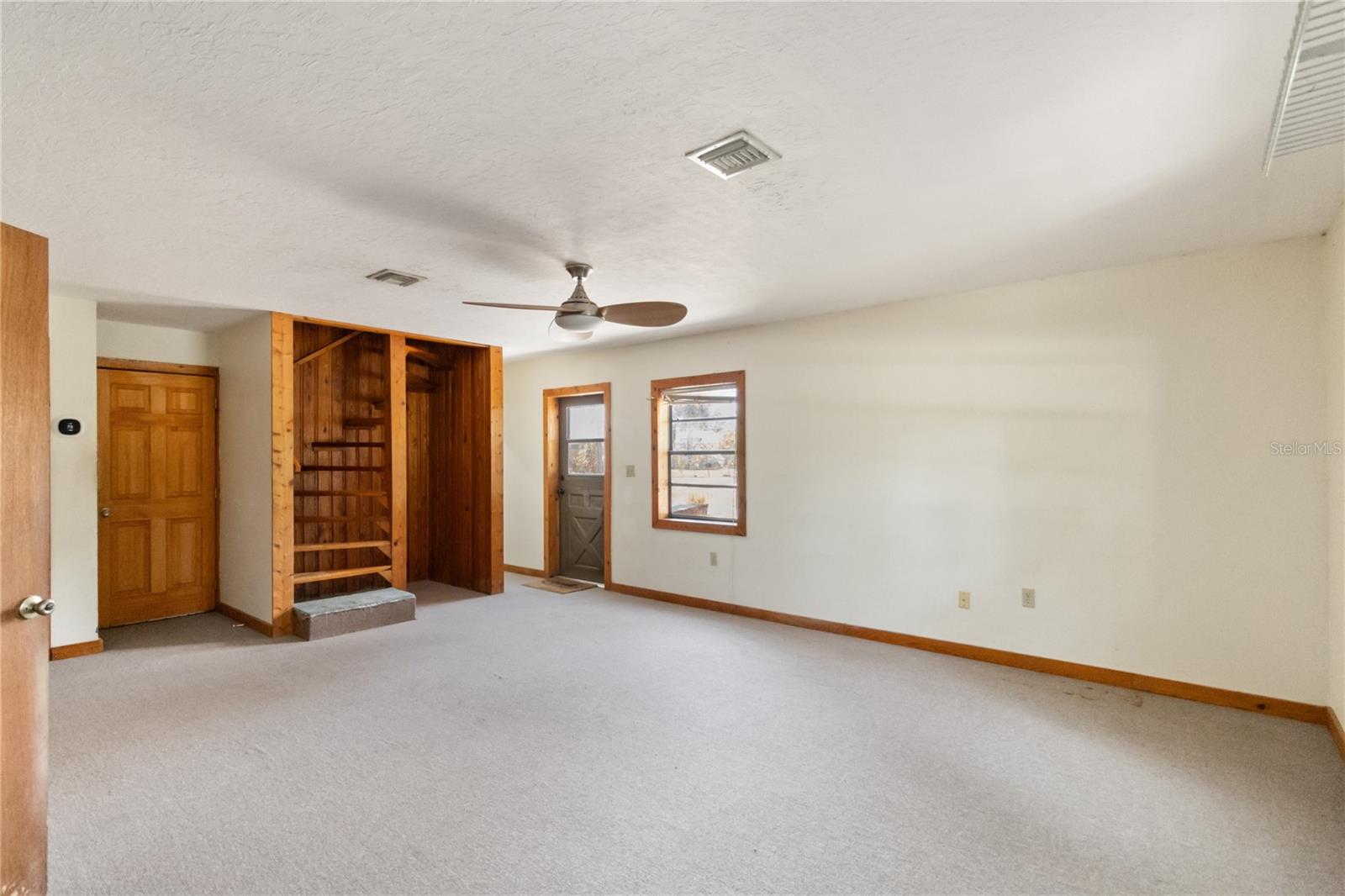 Great investment opportunity! Cash only! This unique, barn shaped 2-story home is surrounded by mature oak trees on a large corner lot and features 3 bedrooms and 2 baths. Downstairs you'll find a large family room, the owner's bedroom and full bath - could be a guest suite or rental opportunity. Upstairs boasts a full kitchen, living room with cozy wood-burning fireplace, dining area, 2 bedrooms and a full bath. AC is 2023. Water heater is 2021. Solar panels - utility bills are very reasonable! Whole home water softener and filtration system. 2 car garage. Conveniently located near shopping, dining, 20 min to Harris, 30 min to beach & Patrick Air Force Base, 50 min to Kennedy Space Center, NASA, SpaceX, Blue Origin, 60 min to Orlando airport and area attractions.