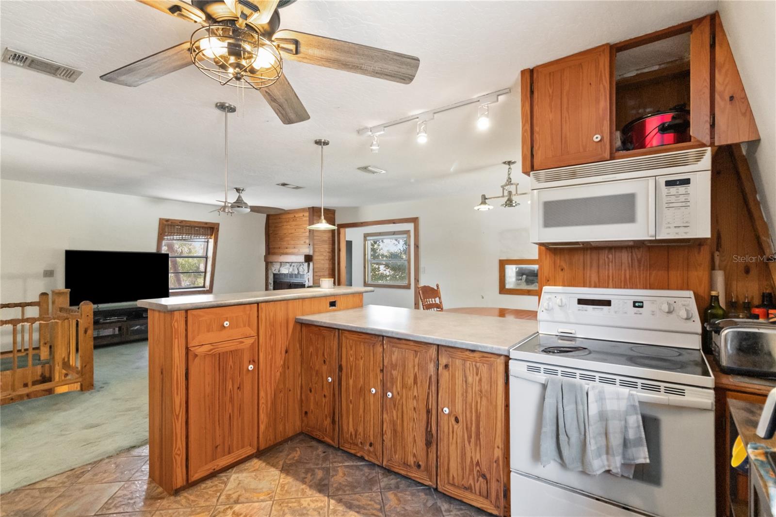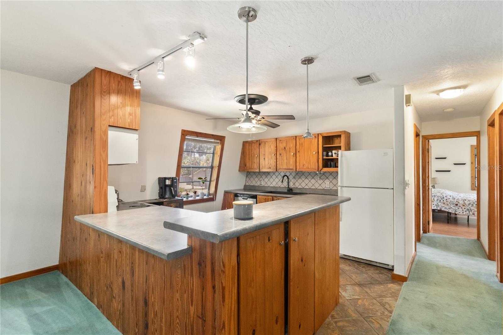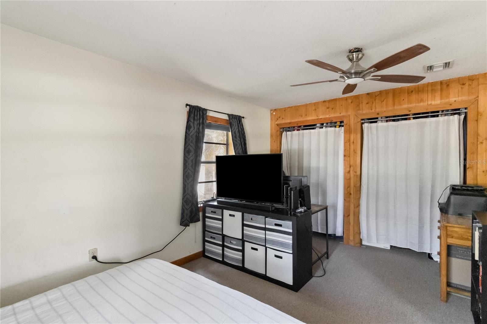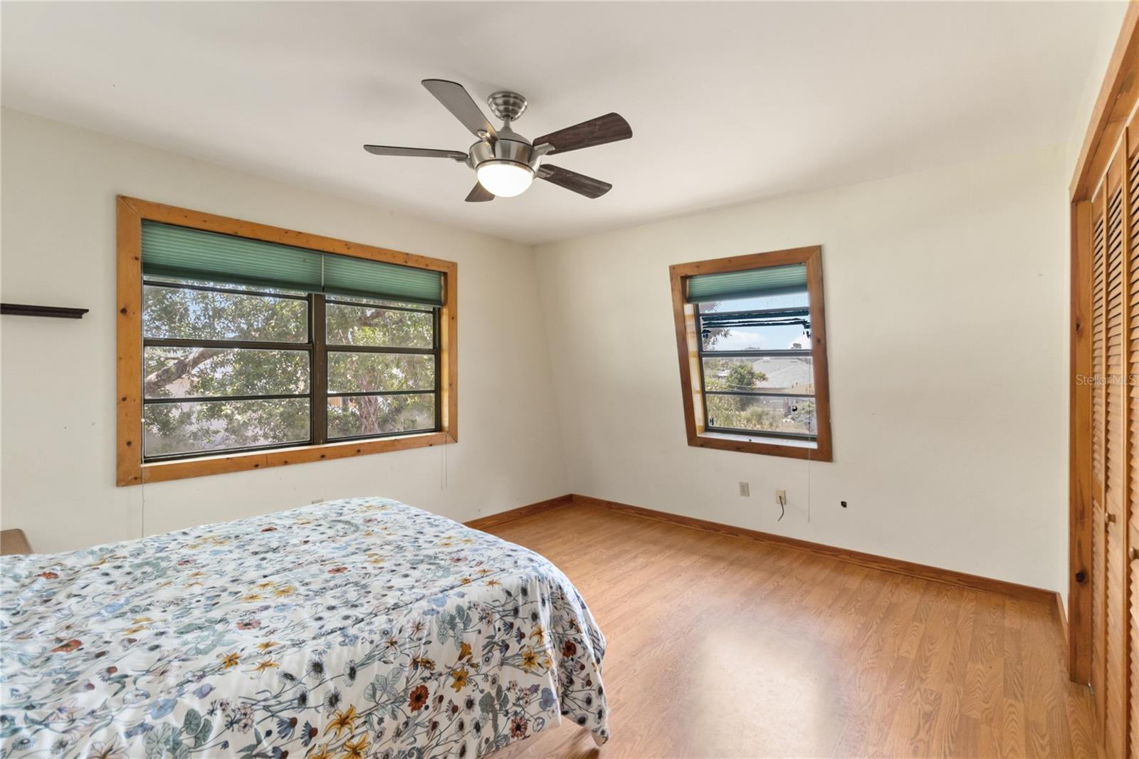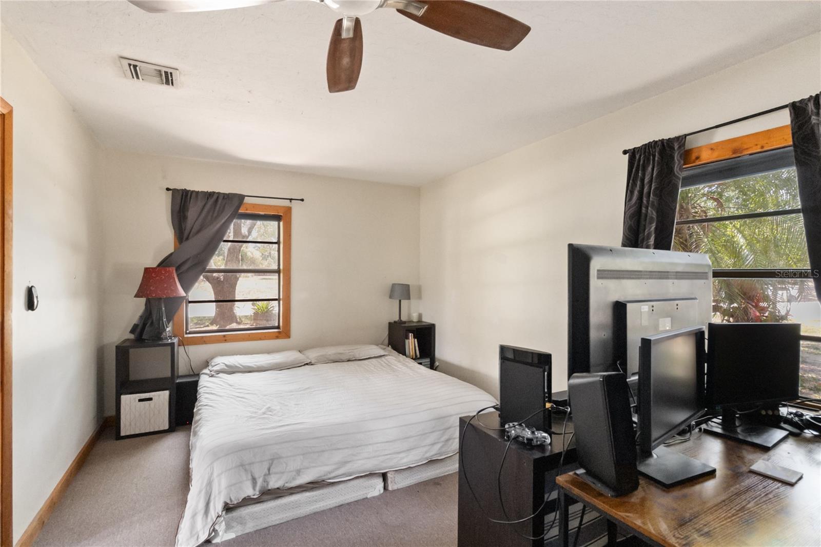 Great investment opportunity! Cash only! This unique, barn shaped 2-story home is surrounded by mature oak trees on a large corner lot and features 3 bedrooms and 2 baths. Downstairs you'll find a large family room, the owner's bedroom and full bath - could be a guest suite or rental opportunity. Upstairs boasts a full kitchen, living room with cozy wood-burning fireplace, dining area, 2 bedrooms and a full bath. AC is 2023. Water heater is 2021. Solar panels - utility bills are very reasonable! Whole home water softener and filtration system. 2 car garage. Conveniently located near shopping, dining, 20 min to Harris, 30 min to beach & Patrick Air Force Base, 50 min to Kennedy Space Center, NASA, SpaceX, Blue Origin, 60 min to Orlando airport and area attractions.