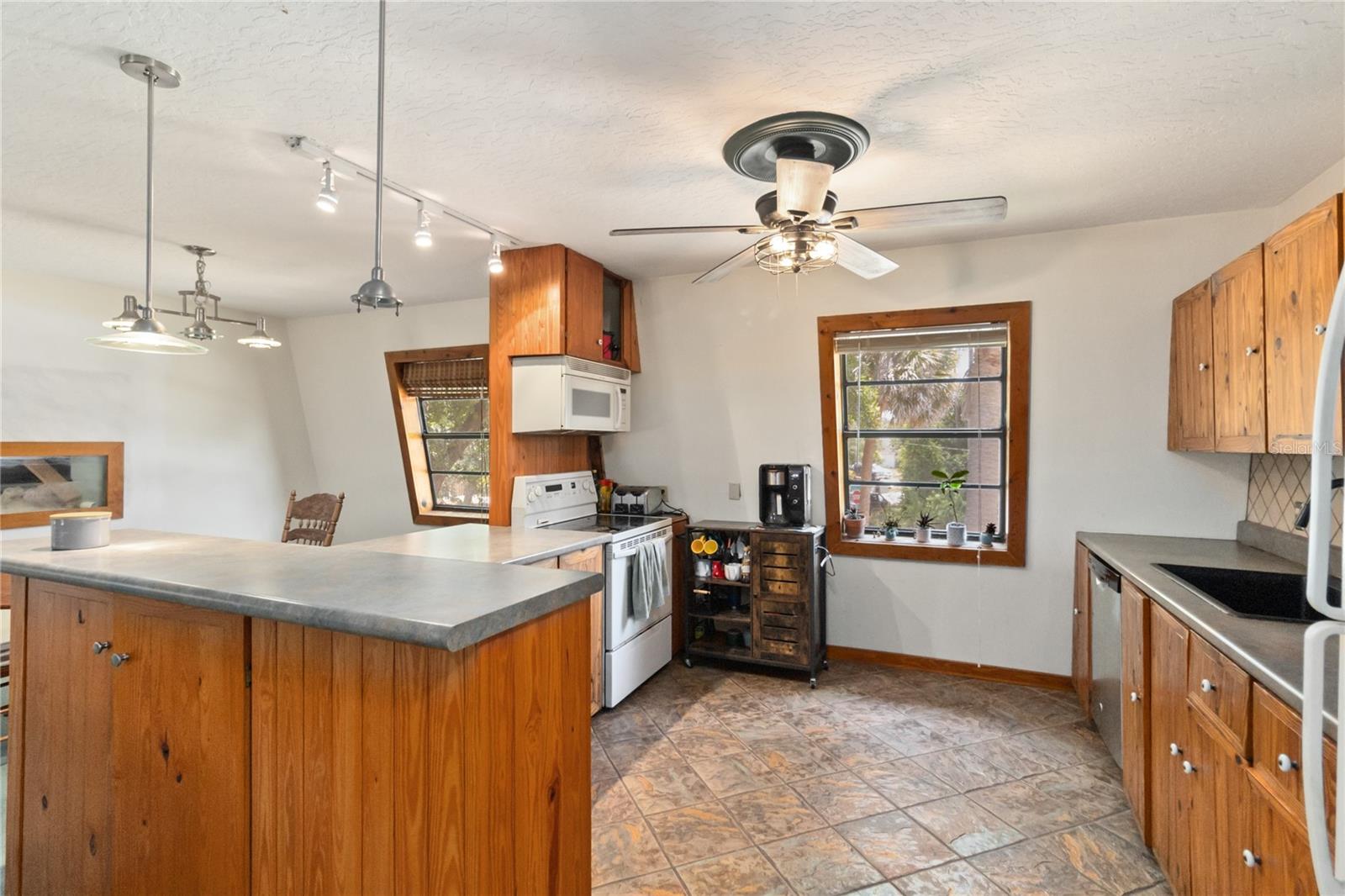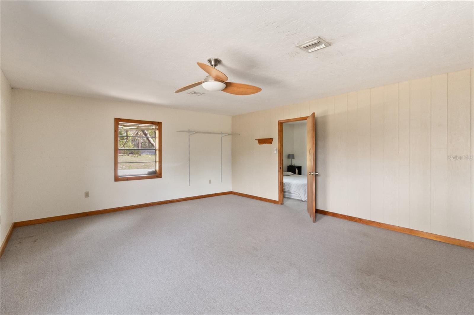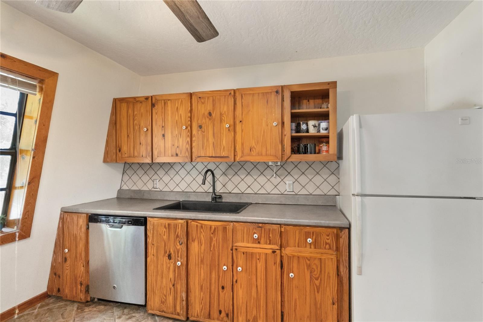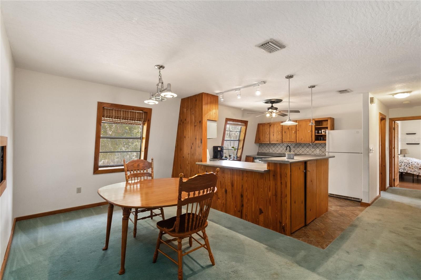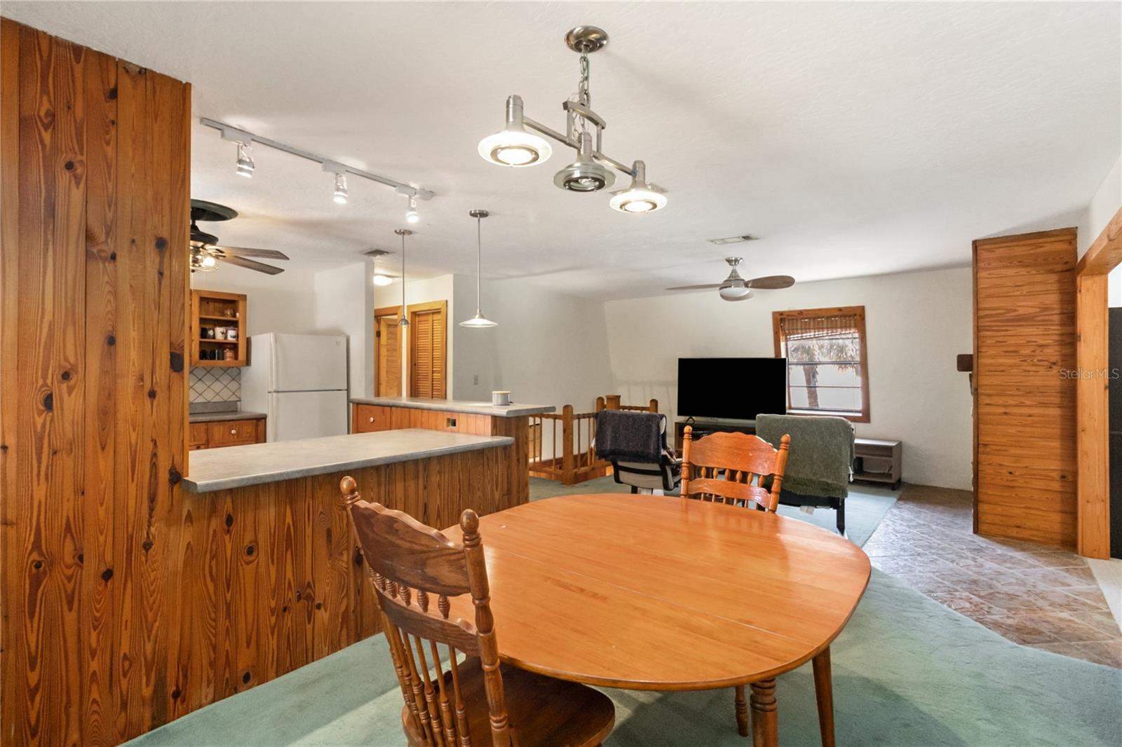 Great investment opportunity! Cash only! This unique, barn shaped 2-story home is surrounded by mature oak trees on a large corner lot and features 3 bedrooms and 2 baths. Downstairs you'll find a large family room, the owner's bedroom and full bath - could be a guest suite or rental opportunity. Upstairs boasts a full kitchen, living room with cozy wood-burning fireplace, dining area, 2 bedrooms and a full bath. AC is 2023. Water heater is 2021. Solar panels - utility bills are very reasonable! Whole home water softener and filtration system. 2 car garage. Conveniently located near shopping, dining, 20 min to Harris, 30 min to beach & Patrick Air Force Base, 50 min to Kennedy Space Center, NASA, SpaceX, Blue Origin, 60 min to Orlando airport and area attractions.