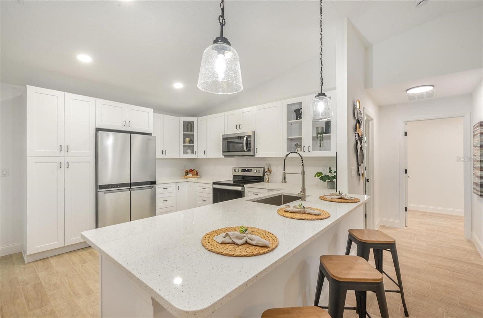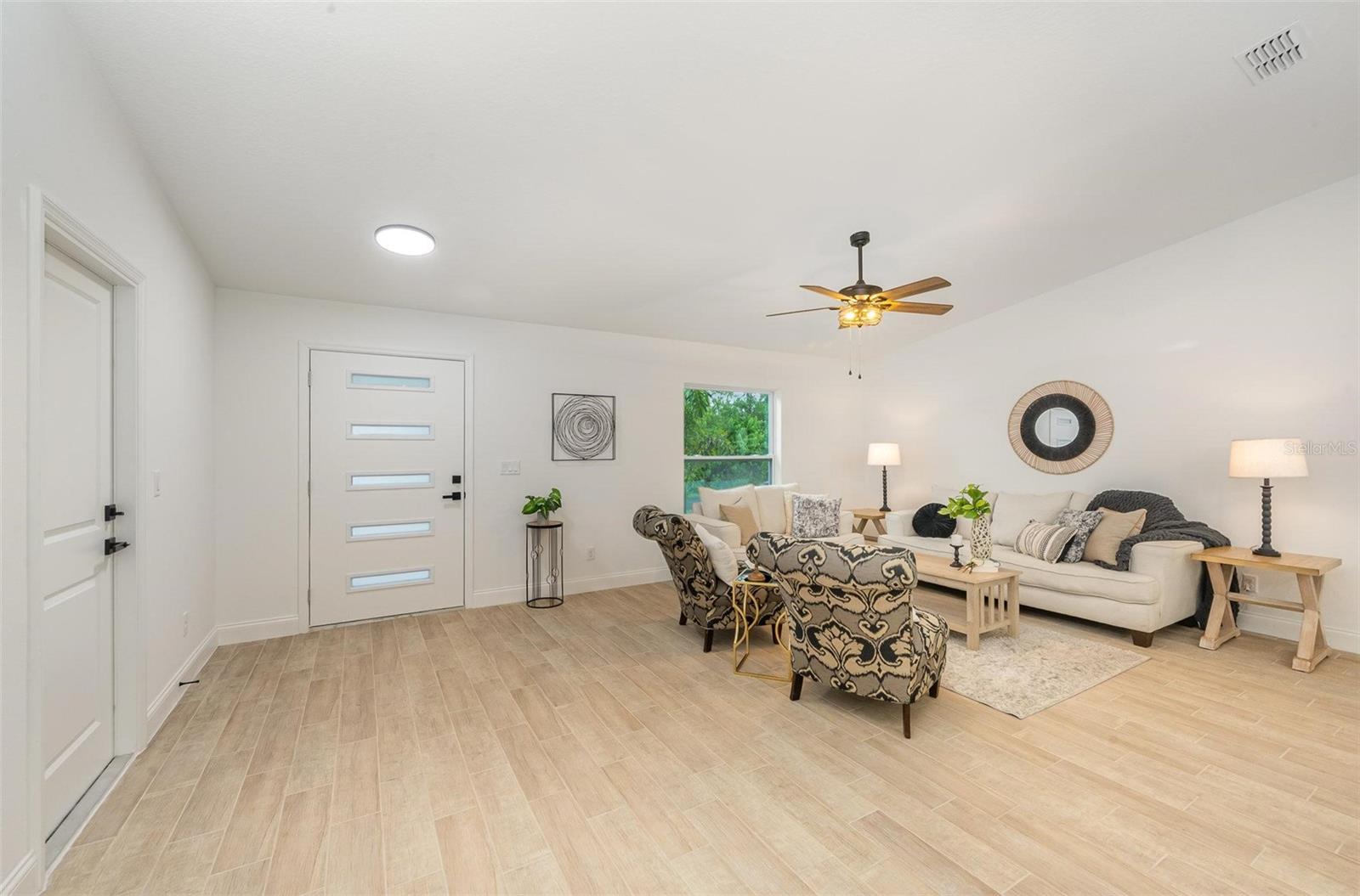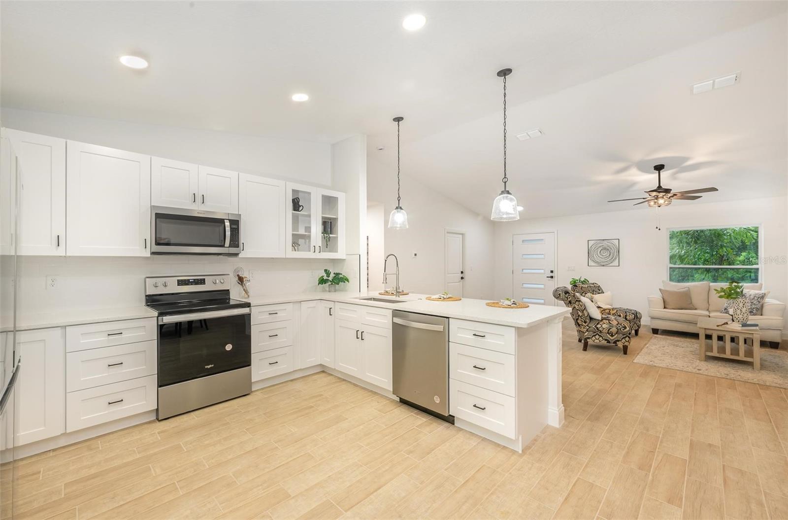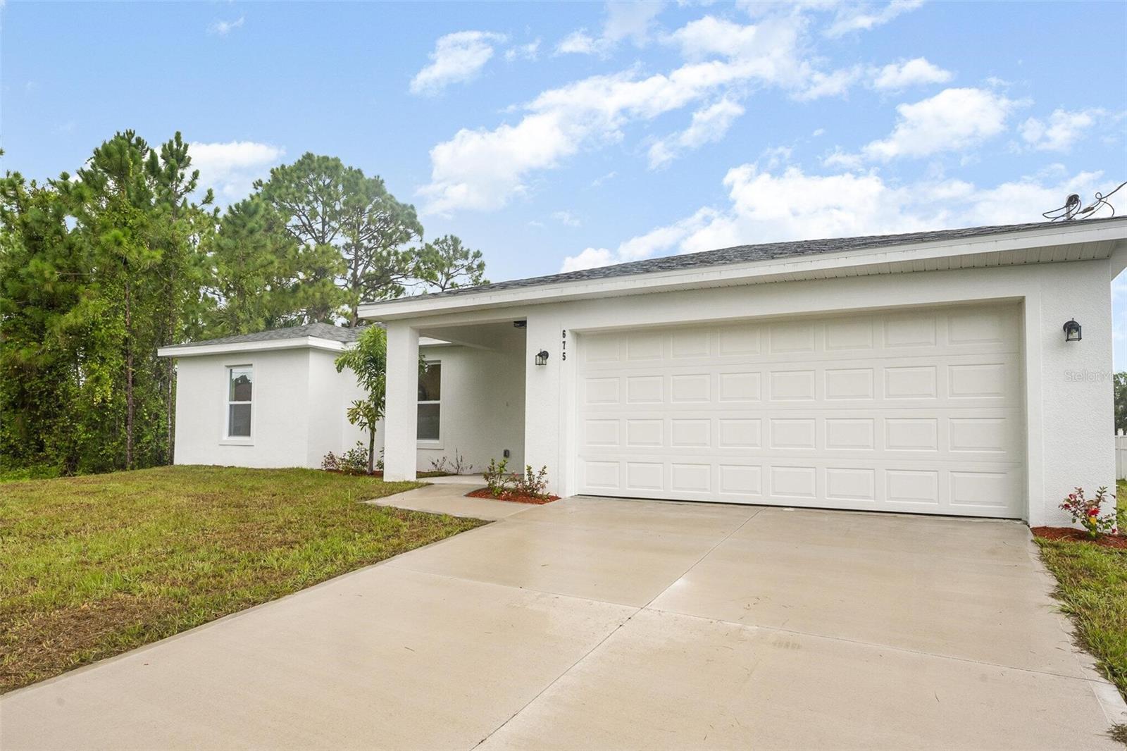 This beautiful home features quartz countertops and soft-close cabinets throughout the kitchen and bathrooms. The open concept floorplan seamlessly connects the living, dining, and kitchen areas, perfect for modern living. The split floor plan ensures privacy, with the primary suite separate from the 2 bedrooms. The home is tiled throughout, has luxury bathrooms, and is equipped with hurricane impact windows and doors for added safety. Step outside to a covered porch, and enjoy the convenience of a 2-car garage and a whole-house water filtration system.
