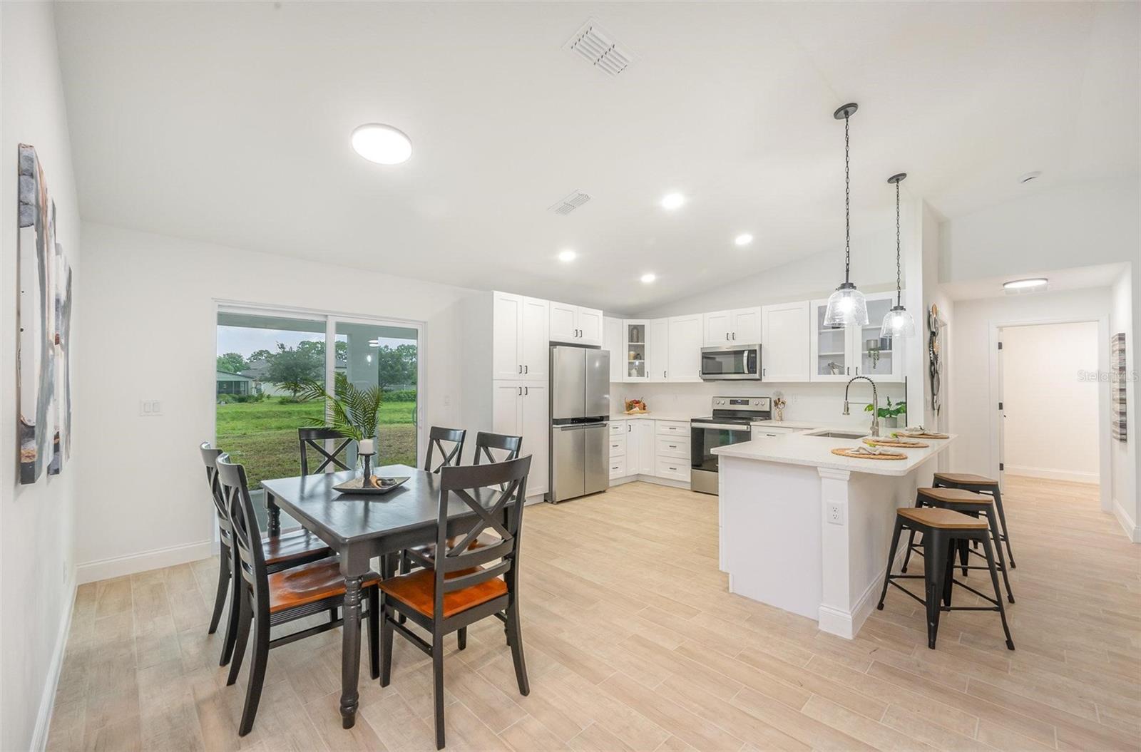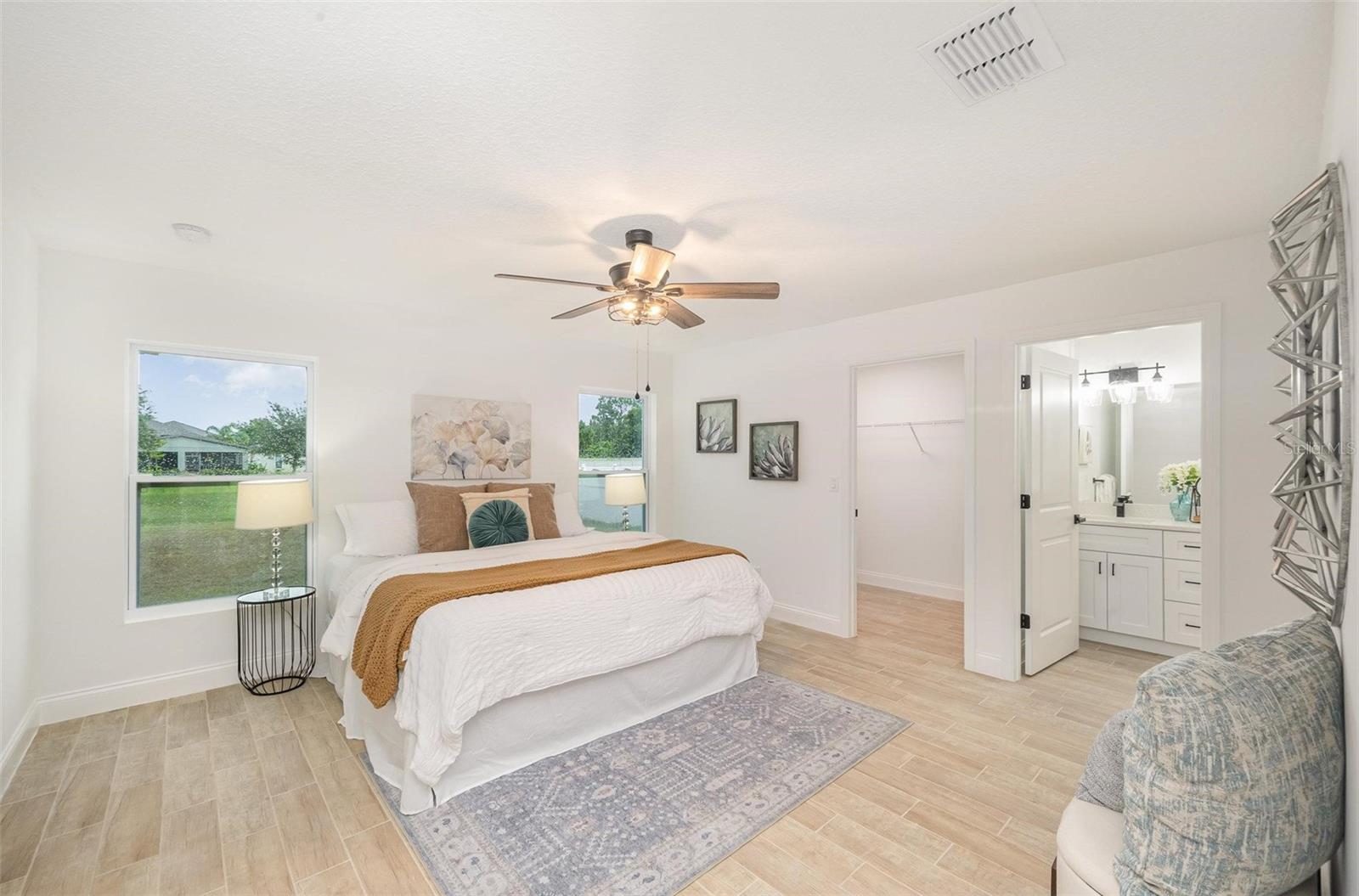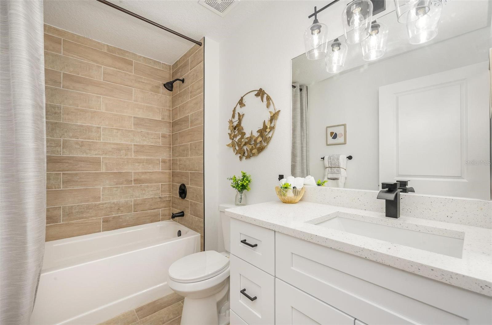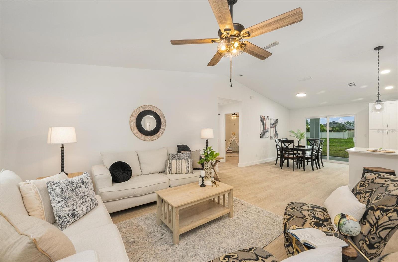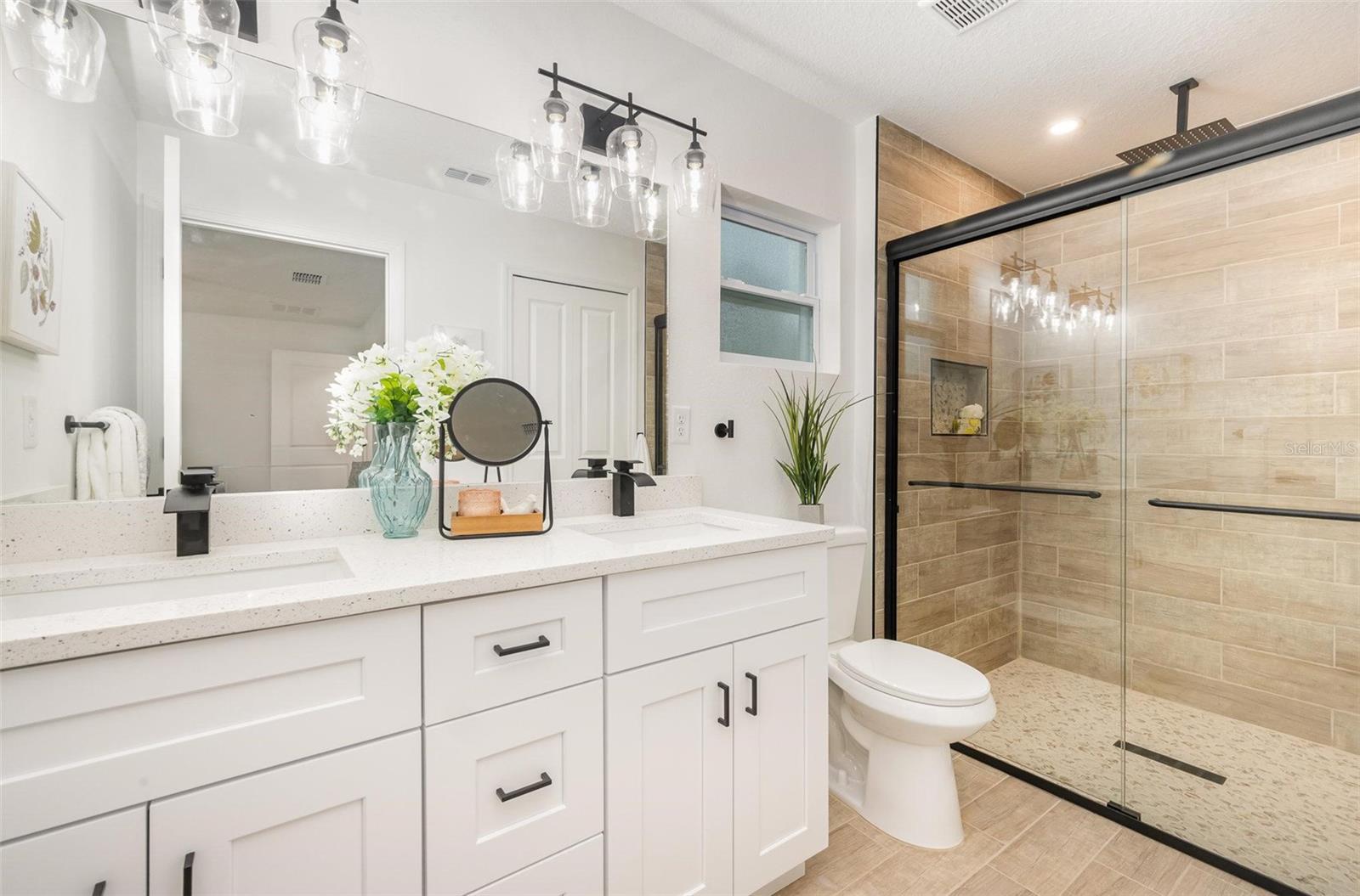This beautiful home features quartz countertops and soft-close cabinets throughout the kitchen and bathrooms. The open concept floorplan seamlessly connects the living, dining, and kitchen areas, perfect for modern living. The split floor plan ensures privacy, with the primary suite separate from the 2 bedrooms. The home is tiled throughout, has luxury bathrooms, and is equipped with hurricane impact windows and doors for added safety. Step outside to a covered porch, and enjoy the convenience of a 2-car garage and a whole-house water filtration system.