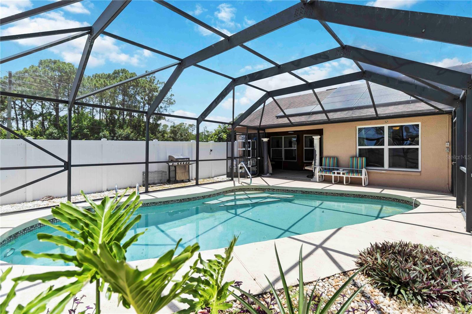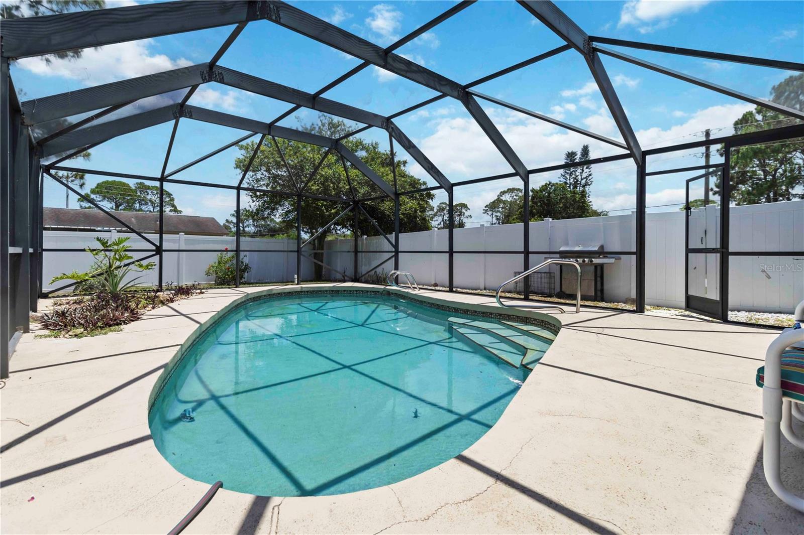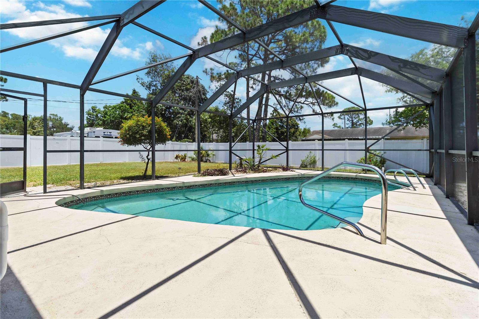 Palm Bay Pool Home! This charming 3-bedroom, 2-bath residence offers a spacious living and dining area, plus an eat-in kitchen featuring stainless steel appliances —perfect for the avid cook. Double-paned, tinted vinyl windows and slider, as well as the water heater, were replaced in 2015. The roof was replaced in 2018, and both bathrooms have been tastefully remodeled. Ceilings feature skip trowel texture, and the screened pool enclosure has been updated. Enjoy your private backyard oasis complete with a covered patio for entertaining, a sparkling pool for relaxing, and a vinyl fence for added privacy. Conveniently located with easy access to St. Johns Heritage Parkway.