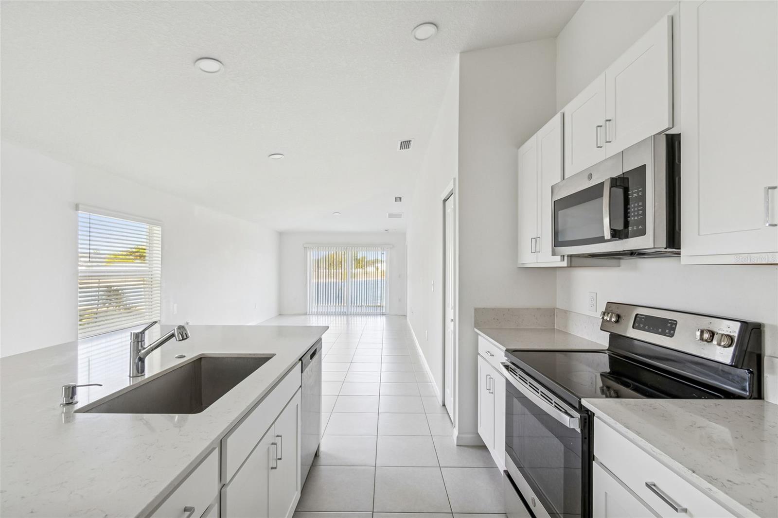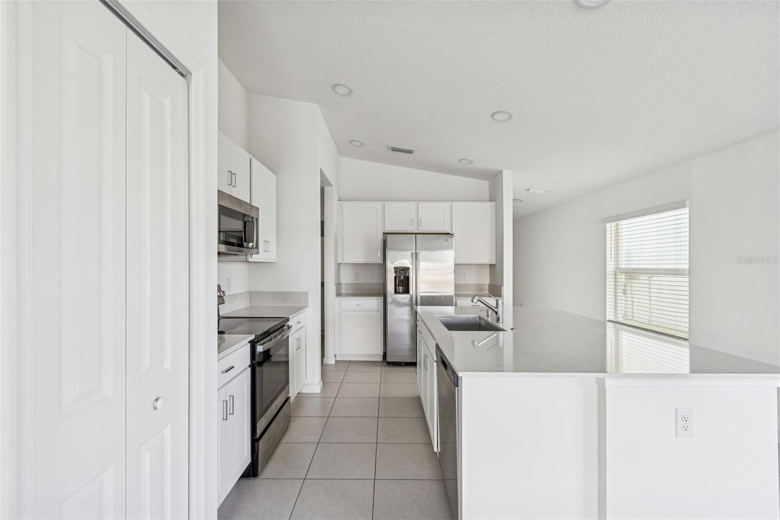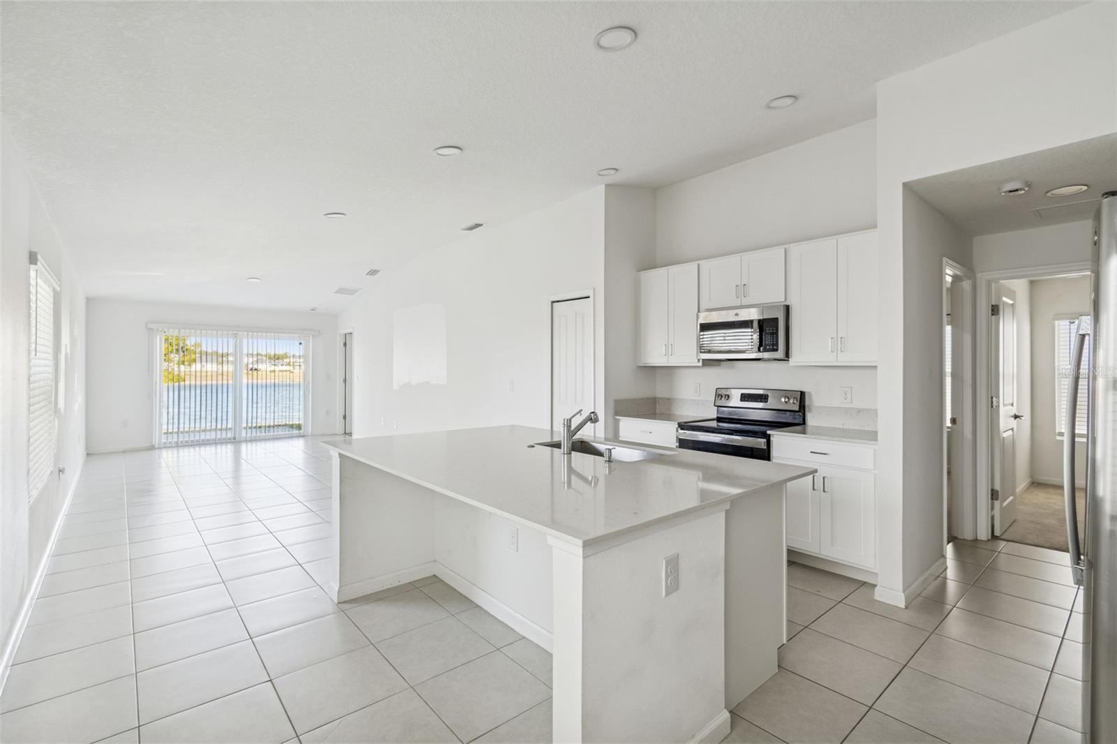 Welcome to this stunning Lennar-built home, completed in 2023 and ideally located in Palm Bay. This beautifully designed residence features three spacious bedrooms and two elegant bathrooms, with a split-bedroom floor plan that offers privacy and comfort. The heart of the home is a spacious kitchen with a large island, perfect for entertaining, featuring quartz countertops, premium wood cabinetry, and tile flooring throughout. Enjoy the peace of mind that comes with impact windows and the convenience of smart home features, including recessed lighting that enhances the modern ambiance. Step outside to a covered front porch, a paver driveway, and a backyard that overlooks a tranquil private lake, adding charm and serenity to everyday living. Located in a low-HOA community, your monthly dues include cable, internet, access to a dog park, and beautifully maintained common areas. With easy access to St. John's Heritage Parkway and proximity to shopping and dining, this home truly has it all—style, comfort, and location.