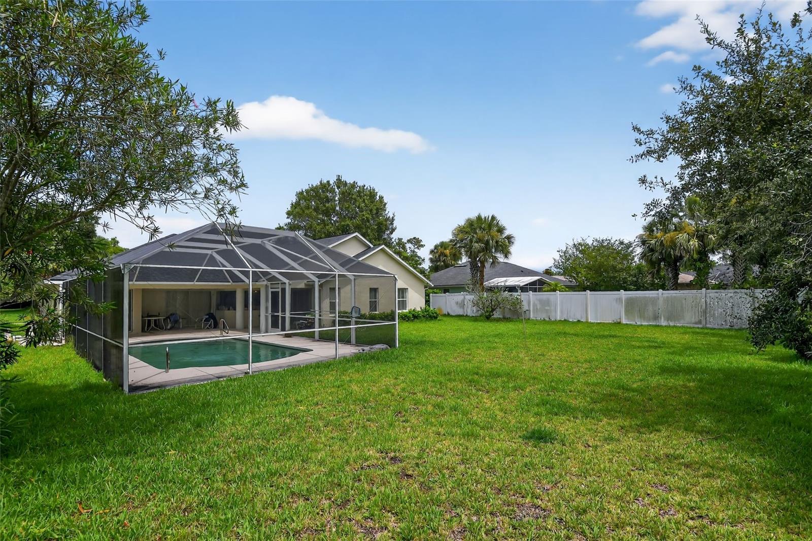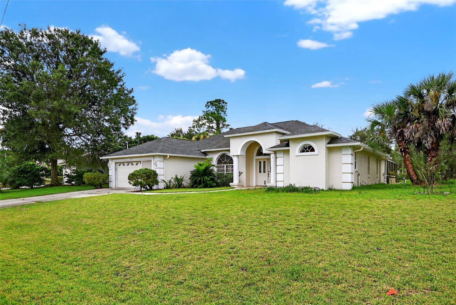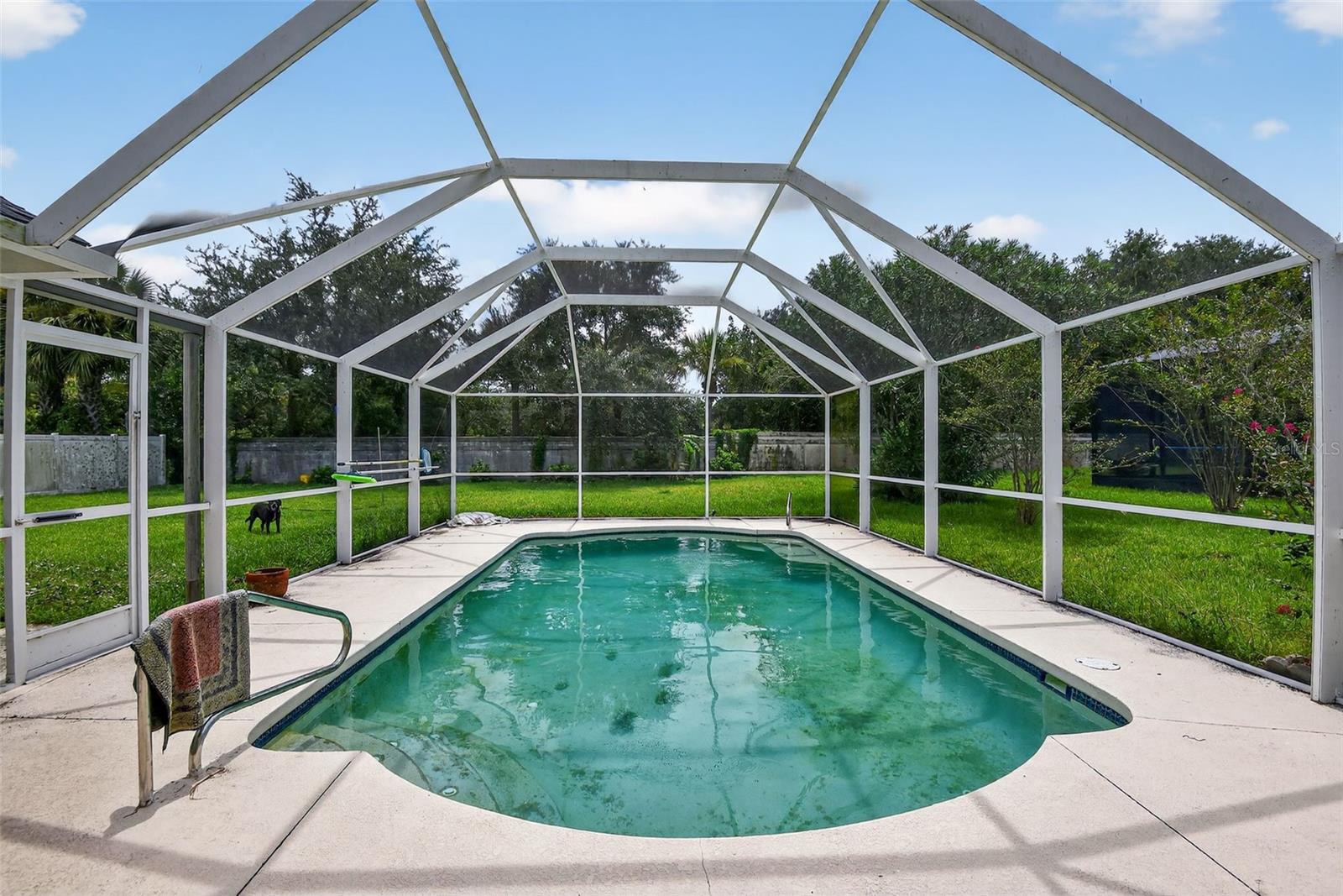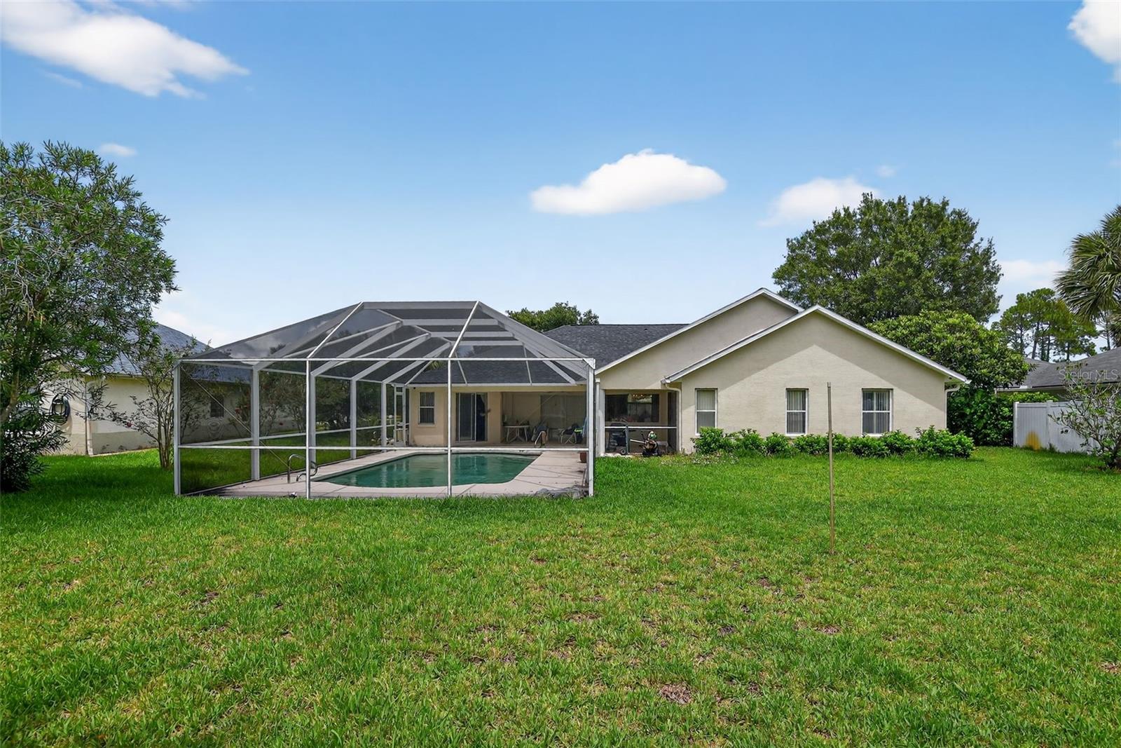 This 3 bedroom/2 bath home features 2,033 sq. ft. of living space. The home sits on a large 0.29-acre lot. The kitchen offers wooden cabinets, a pantry, and granite countertops. The living room is carpeted while bedrooms feature walk-in closets. Bathrooms include double sinks, wooden cabinets, and an extra storage closet. The front yard is landscaped with a 1-car garage while the backyard offers a covered patio connected to a screened swimming pool with a spacious yard. Subdivision: Palm Coast Sec 16