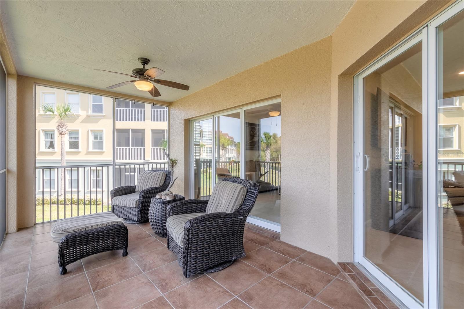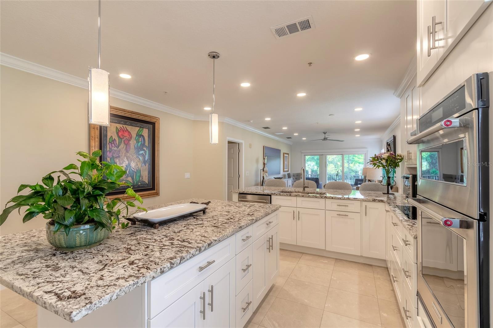 This completely remodeled, highly sought after END/CORNER unit with beautiful water and wooded views is looking for a new owner. With over $170,000 in remodeling costs and upgrades, this stunning unit will thrill the most discriminating buyer. Canopy Walk is a wonderful, gated community that runs along side the Intracoastal Waterway and offers beautiful water views, walking paths, private garages, a fabulous clubhouse, work out facility, large pool, hot tub, cabanas, plenty of open and covered sitting/lounging areas, covered and open sitting areas overlooking the Intracoastal Waterway and so much more! The open & spacious floor plan offers a custom kitchen with built in pantry, pull out drawers, all new appliances, granite counter tops, gorgeous backsplash, a large island, travertine floors, custom bathrooms with travertine walls and stunning accent tiles. The master bath offers a rain shower along with 2 additional shower heads, granite countertops with his & hers sinks, custom cabinets & linen closet. The primary bedroom has a beautiful view of the water & wooded area & private access to the beautiful lanai. The 2 guest rooms are on the opposite end of the unit so there is plenty of privacy. Being an end unit, there is Natural Sunlight Throughout. Some remodeling highlights are as follows: Removal of kitchen wall which created an open floor plan. Travertine floors throughout and installed on bathroom shower walls. Added crown molding throughout, all new kitchen appliances, granite counter tops, built in pantry, new hot water heater, enlarged primary shower, new indoor ceiling fans, added numerous LED ceiling lights throughout, painted all walls, baseboards & ceilings, replaced door handles & hardware, added plantation shutters throughout unit, new shades on sliding glass doors, replaced & updated window seals, custom master and hallway closets. Added cabinets to laundry room. There is even a boat slip available in a SEPARATE PURCHASE!!!! So what are you waiting for? Schedule a showing today! Bedroom Closet Type: Walk-in Closet (Primary Bedroom).