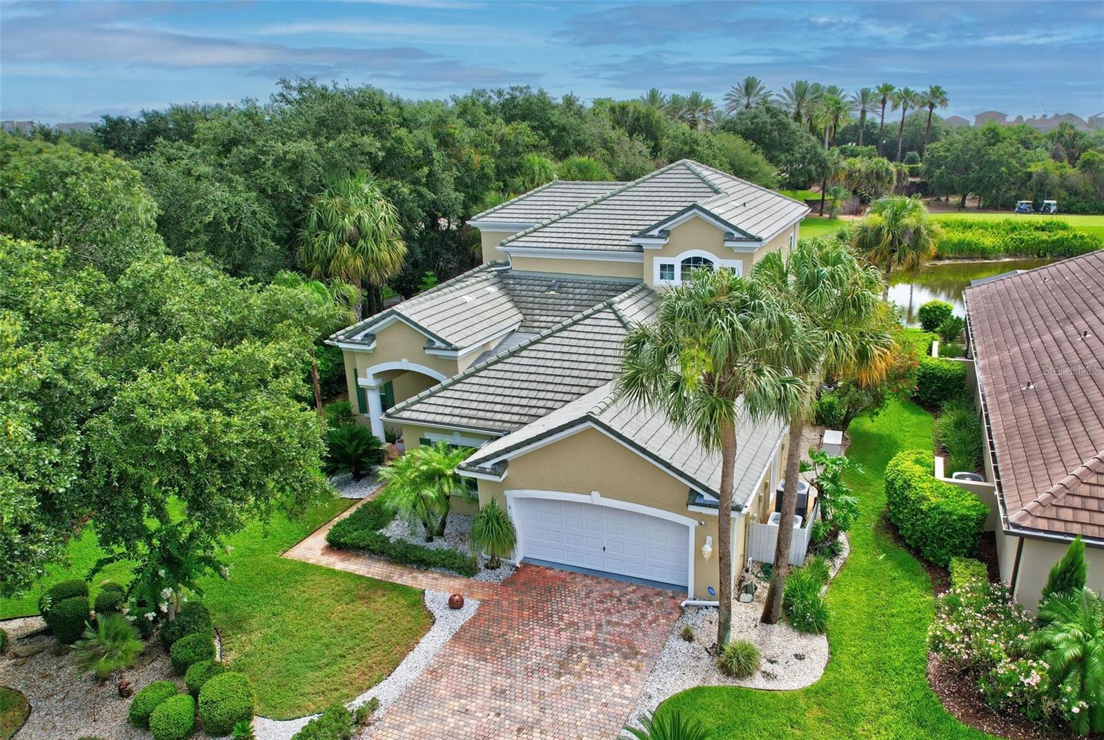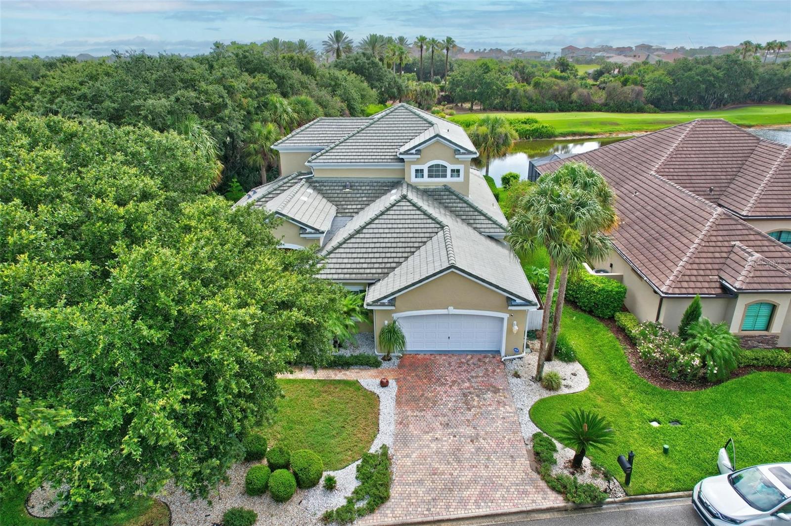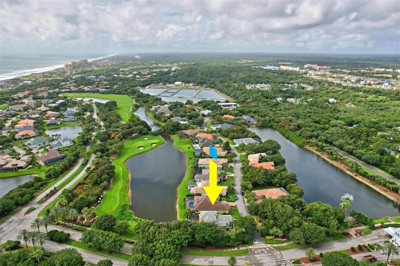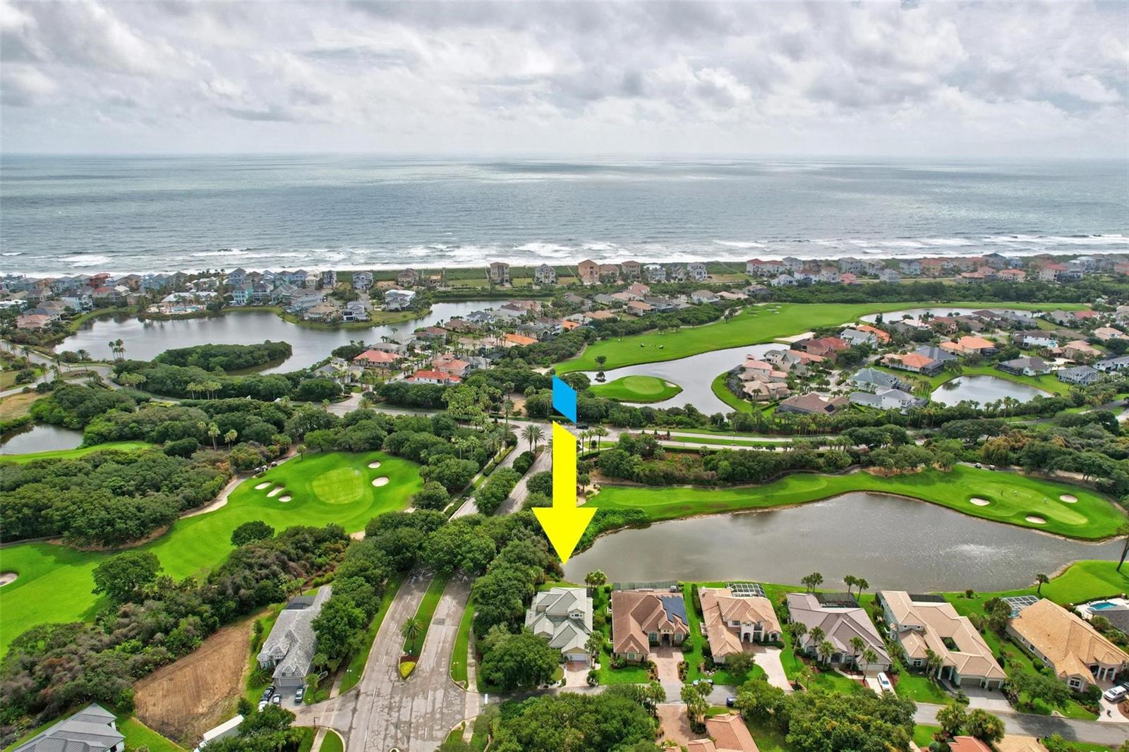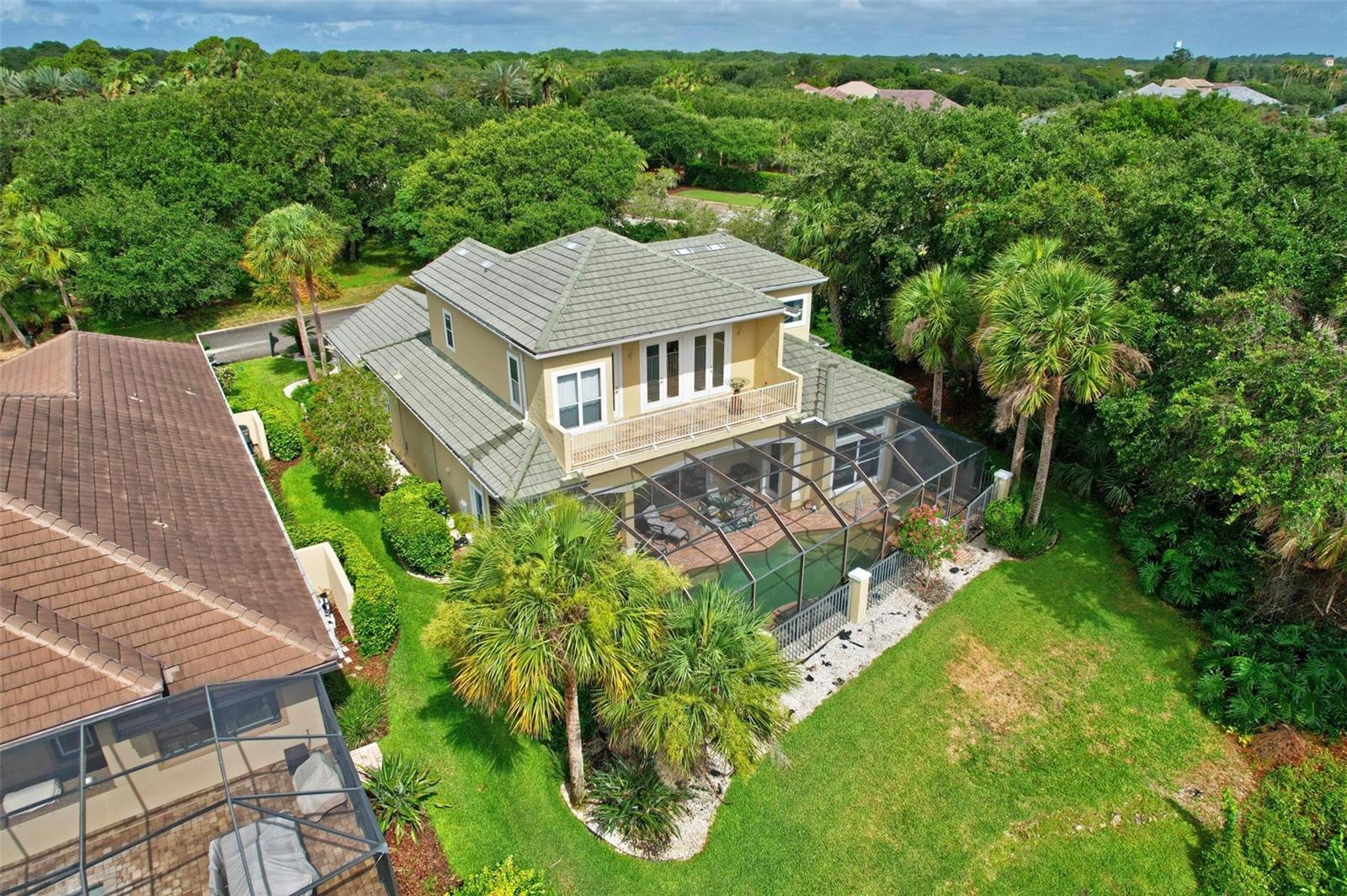 Welcome to your dream pool home in Ocean Hammock! This stunning residence is conveniently situated on the 4th fairway lake of the Ocean Course at Hammock beach. Boasting over 3,500 sq ft of luxurious living space, 3 bedrooms, 2.5 bathrooms, and a versatile office, this premier property provides endless oppotunity. As you arrive, you'll be captivated by the elegant tile roof and paver driveway. Step through the French doors into a beautiful inlay tile foyer, where the spacious study with hardwood floors awaits on your right—perfect as a potential 4th bedroom. The open and airy living space is bathed in natural sunlight, thanks to the numerous windows and sliding glass doors. These ceilings soar, climbing high with tray in the kitchen adorned with crown molding. Decorative columns on either end of the countertop bar enhance the grandeur. The living area seamlessly flows into the gourmet kitchen, featuring an eat-in nook, plantation shutters, large island, granite countertops, tile backsplash, wine refrigerator, stainless steel appliances, built-in oven, and a separate workspace leading to the laundry area. The main floor also houses the luxurious primary suite with plush carpet, offering a private retreat. The exquisite en suite bathroom includes a soaking tub, floor-to-ceiling tiled walk-in shower, expansive vanity with ample storage, large walk-in closet, and separate water room. Both the master suite and the living room provide access to the screened-in patio, leading to the serene pool and spa area with wonderful lake views. Up the hardwood stairs, the second floor offers a spacious living area with a dry bar, a bathroom with dual vanities, and two bedrooms—one with balcony access. The lush carpeted floors add warmth and comfort to this level. Enjoy the tranquility and beauty of Ocean Hammock from the privacy of your balcony or poolside patio. This exceptional property is the perfect blend of elegance, comfort, and style. Make it yours today and experience the best of Florida living. * Seller is offering a $10,000 credit for pool resurfacing *