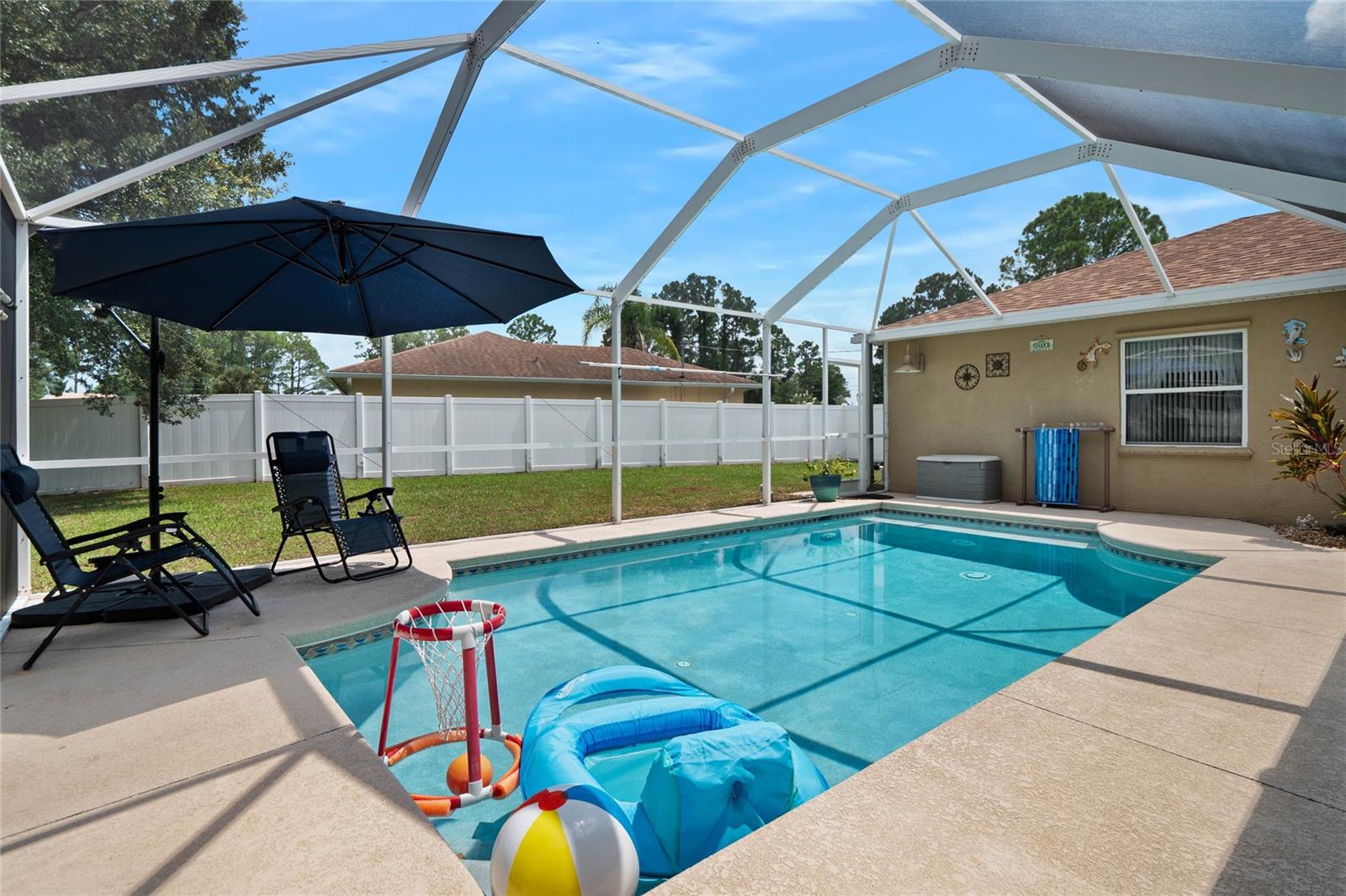 Rare double lot pool home with vinyl fenced backyard offering 4 bedrooms and 3 baths in Palm Coast. You'll love relaxing on the covered screened patio area overlooking the pool and the view of the peaceful wide-open private back yard. Splitting the lots can also be an investment opportunity. You’ll appreciate all the great spaces this home has to offer to live the Florida lifestyle. Come inside while embracing two large bedrooms with their own private ensuite baths. The large kitchen is a chef’s dream that is full of upgrades including granite counter-tops, stainless-steel appliances and wood cabinets. The spacious living room is another amazing feature with new French doors that lead out to the pool and patio area for entertaining. You really need to explore this gorgeous home to see all that it has to offer. Brand new Berber carpet in bedrooms, roof 2022, HVAC/AC 2021, and water heater 2023. Minutes away from Palm Coast schools, shopping, restaurants, and I-95. A short drive to the sandy beaches of Flagler Beach. Schedule a showing today to see this rare and amazing gem before it is gone!